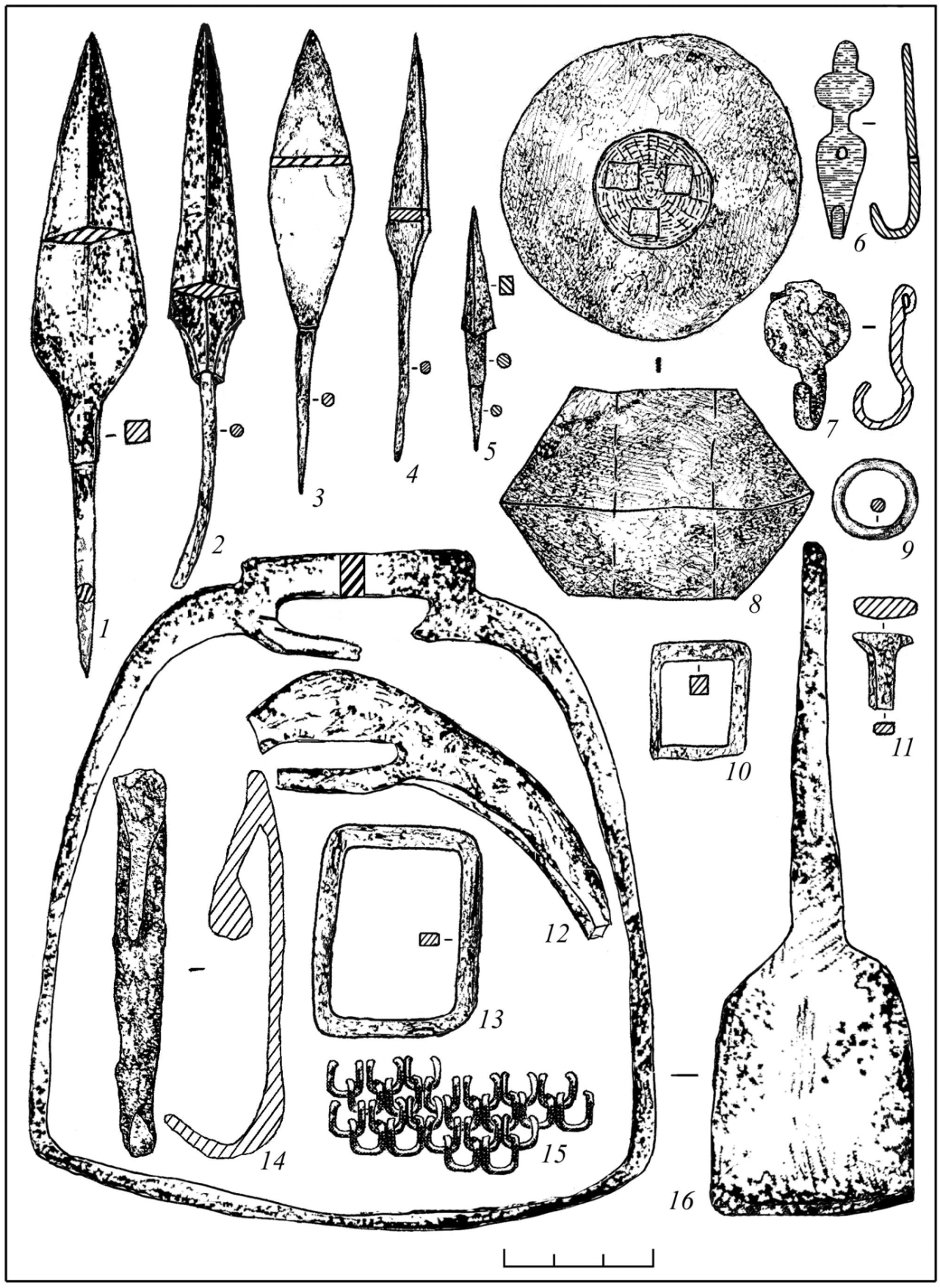 Кресало – 2 экз. Прямоугольной формы с прорезью в центре, имеют размеры: длина 151-152 см, ширина 20-22 см. Нижнее окончание кресал в виде небольшой заостренной лопаточки, клиновидной в сечении. У одного экземпляра сохранилась петля для подвешивания кресала к поясу. Гвозди железные – 5 экз. Гвозди кованые, имеют четырехгранный стержень, шляпки в форме многоугольника или овала. Котлы изготовлены из бронзы и железа. Дужки железные – 4 экз., имеют плоское сечение и небольшие крючки на концах. Они не похожи на дужки от описанного выше котла. Скорее всего, эти дужки крепились к другим сосудам, вероятно, к ведрам. Петли железные для подвешивания котлов над очагом сделаны из крученого дрота и представлены во всех случаях одним звеном – 3 экз. Тарелка чугунная или поддон – 1 экз., представлен небольшим фрагментом в слое жертвенника. Скобы железные – 11 экз., использовались для скрепления досок. Скобы делятся на ленточные и эллиптические. Существует мнение, что эллиптические скобы применялись для нужд судостроения (Захаров С. Д. 2004. С. 209). Клинья железные – 11 экз., использовались для скрепления деревянных конструкций. Пряслица из глины (15 экз.). Туеса – 2 экз., обнаружены в постройке 2004 года. Днища сосуда диаметром 10-12 см изготовлены из нескольких слоев бересты. По периметру днища имелись парные отверстия, которые служили для соединения донца со стенками.