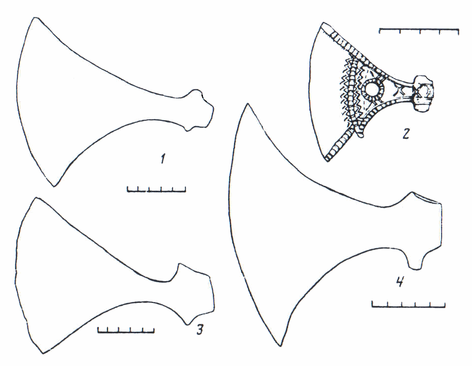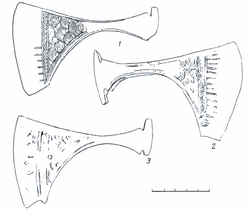 Вне выделенных типов остаются амулеты из Княжей Горы и святилища на о. Вайгач. Первый из них (Каталог, № 55) имеет форму топора, насаженного на рукоять, конец которой снабжен отверстием для подвешивания. Амулет с о. Вайгач (Каталог, № 56; рис. 5. 2) представляет собой широколезвийный топорик с почти симметричным лезвием и двумя парами боковых щековиц с прямыми краями на обухе. На внутренней стороне лезвия у этого топорика небольшая шпорца, посредине круглое отверстие. Боковые грани украшены врезным орнаментом в виде двух пар дуг с короткими насечками между ними и зигзагообразных линий, вдоль краев бордюр из прямых линий и коротких насечек, отверстие заключено в кружок с двумя треугольниками. Отличаясь по форме и пропорциям от топориков двух выделенных групп, амулет с о. Вайгач подобно им копирует реальное боевое оружие – топоры типа VII, по классификации А. Н. Кирпичникова [5, с. 39, рис. 6 J. Эти топоры, характерные для Скандинавии и Балтийского региона, получили в XI-XII вв. распространение и в Северной Руси (рис. 5, 1, З, 4), один из них найден на Печоре (13, л. 24, 25, рис. 30), по которой проходил путь «в Югру» – на о. Вайгач.