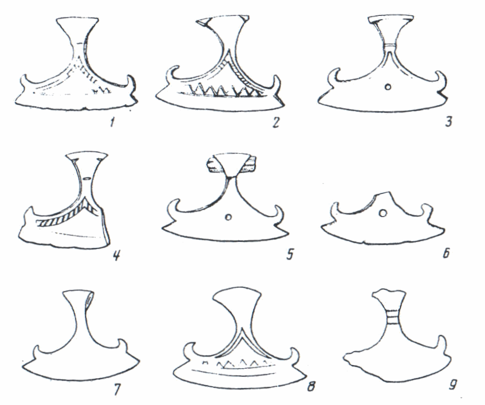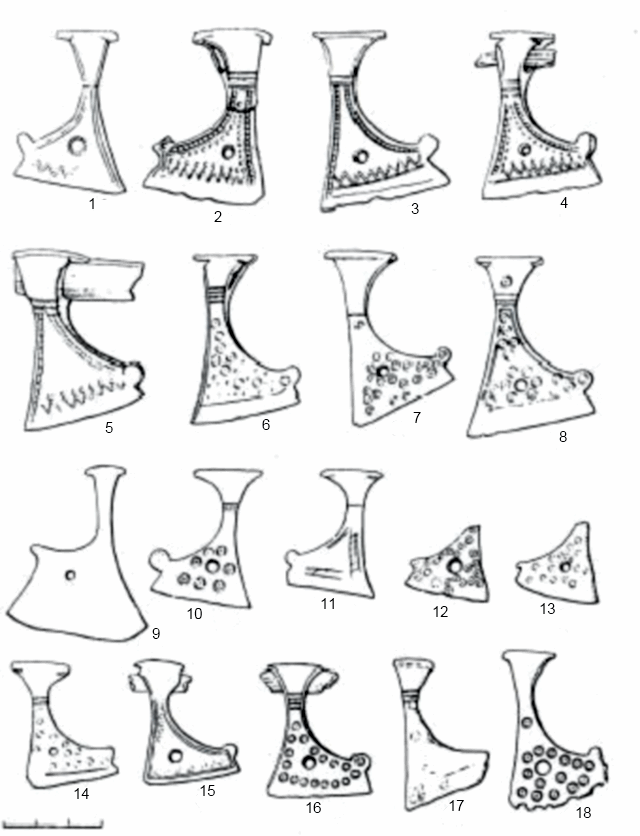 Наиболее многочисленную группу составляют амулеты, имитирующие боевые топоры с оттянутым вниз лезвием, полукруглым вырезом в основании и удлиненным вырезным обухом – тип IV, по А. Н. Кирпичникову [5, с. Зб. 37, табл. ХIII, 4-8, табл. XXI, 1, 2, 8-12). Таких подвесок 39 (Каталог, N, 1-36). Длина их варьируется от 4 до 5,5 см, ширина лезвия – от 2,8 до 4 СМ. Сходство амулетов этой группы с подлинными боевыми топорами отмечалось целым рядом исследователей: А. Надольским [6, с. 390], П. Паульсеном [7, с. 195, 196], В. П. Даркевичем [4, с. 92, 93]. Действительно, миниатюрные топорики воспроизводят не только форму топоров типа IV, но и многие детали: мысовидные выступы на обухе, две пары коротких щековиц, сквозное отверстие для крепления чехла на лезвии, шпорцу на его внутренней стороне. На шейке у большинства экземпляров имеются глубокие насечки или небольшие рельефные валики, отмечающие переход от лезвия к обуху. Орнаментация амулетов этого типа различна. У 6 экз., происходящих из Кемского некрополя, Новгорода, Саркела, Старой Руссы и Биляра, боковые грани окаймлены бордюром из двух (реже одной) глубоких врезных линий и небольших круглых углублений; вдоль края лезвия, на некотором расстоянии от него, проходит зигзагообразная линия с круглыми углублениями на углах (рис. 1, 1-5). Три топорика (из Киевской губернии, Княжой горы и Яблонова) орнаментированы по краям боковых граней бордюром, образованным двумя прямыми линиями с короткими насечками или зигзагообразной линией между ними (рис. 1, 11). Более представительную серию (14 экз.) образуют топорики, украшенные циркульным орнаментом (рис. 1, 6-8, 10, 12-18). Кружки с точками обычно образуют лепестки вокруг сквозного отверстия на лезвии, а на остальной плоскости располагаются хаотически, оставляя свободной лишь узкую полоску у края лезвия. Один кружок, как правило, помещен на мысовидный выступ. В некоторых случаях циркульный орнамент сочетается с врезной линией, окаймляющей боковые грани (рис. 1, 8, 15), Судя по публикациям. некоторые топорики (экземпляры из Вышгорода, Княжой Горы, Дрогичина, Старой Рязани, Городца; Каталог, № 6, 17, 18, 22, 26) лишены орнамента, но вполне вероятно, что он не виден из-за слоя коррозии. Два топорика, включенные в первую группу, несколько отличаются от остальных амулетов по форме и орнаментации. Один из них, найденный в 1978 г. в Киеве (Каталог, N2 23), не имеет шпорцы на внутренней стороне лопасти, лезвие его орнаментировано кружками и прямыми и зигзагообразными линиями, образуюющими не вполне понятную композицию. Я. Е. Боровский и М. А. Сагайдак полагают, что подвеска имитирует топор с полукруглой выемкой в основании лезвия (8, с. 40), но деформированный обух амулета-топорика не соответствует форме обуха топоров типа V. У амулета, найденного в Ултуне в Швеции (Каталог, № 2), лезвие имеет обычную форму, но шпорца выделена слабо, а конструкция обуха без мысовидных выступов на тыльной стороне близка топорам типа VI, по А. Н. Кирпичникову [5, с. 38, 39, рис. 6]. Циркульный орнамент образует правильную кайму по боковым краям лезвия. Несмотря на своеобразную форму обуха, П. Паульсен рассматривал этот амулет вместе с топориками первой группы [7, с. 196].