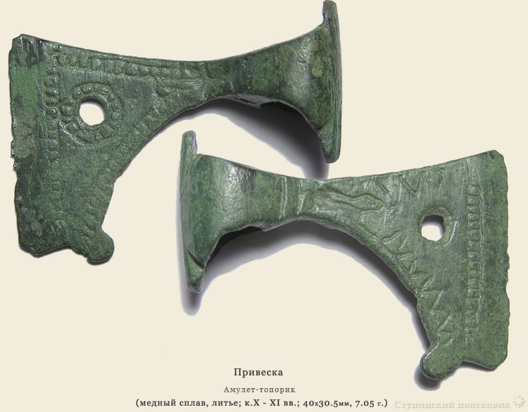 Поиски связующего звена между древнерусскими и скандинавскими амулетами не дают пока положительных результатов, как и поиски исходных типов амулетов-топориков в более ранних славянских древностях. По-видимому, миниатюрные топорики принадлежат к тому кругу вещей - бытовых предметов, украшений и культовых символов, которые появились как инновации на волне мощного обновления материальной культуры восточных славян в XI в.