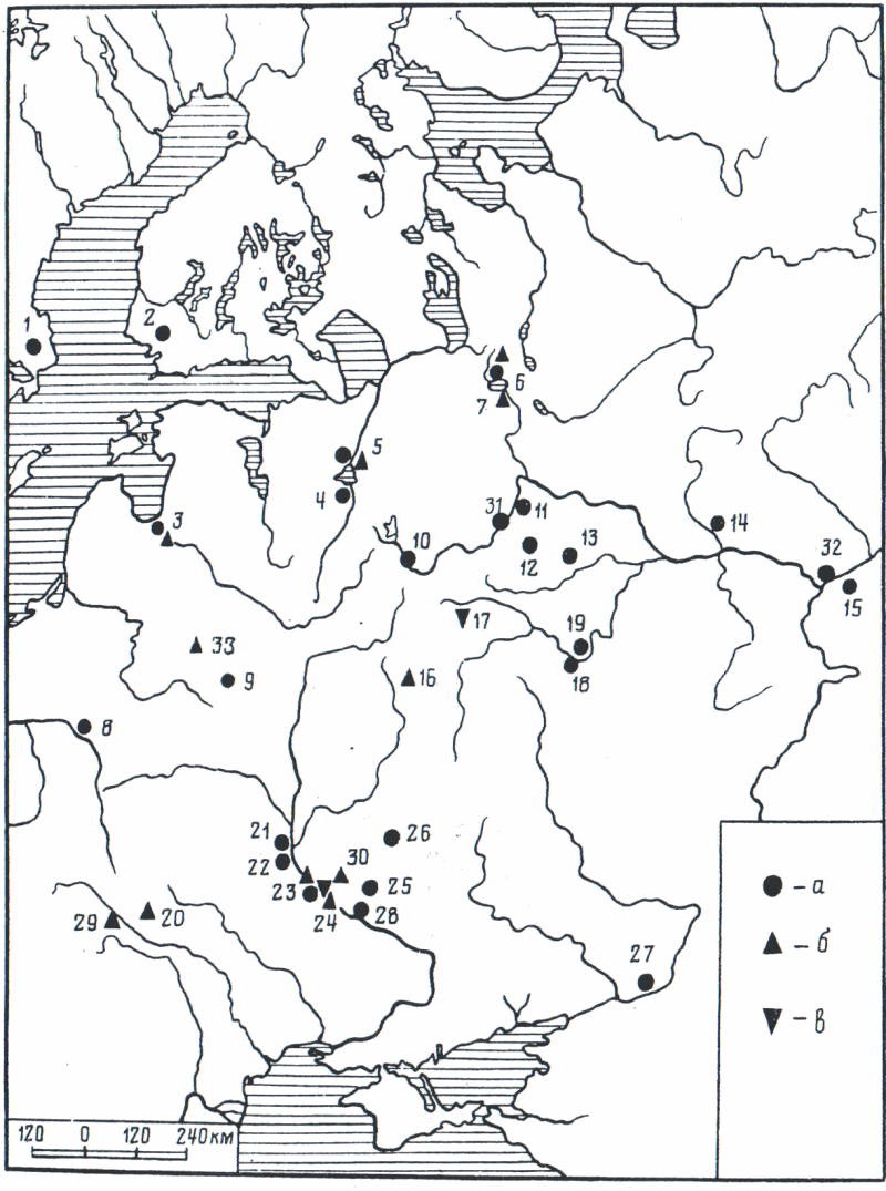 Рассмотрим теперь географию находок. Обратившись к карте (рис. 6), легко заметить, что топорики-амулеты встречаются как на юге – в Среднем Поднепровье, так и на севере – в Белозерье, как на западе - в Полоцкой земле, так и на востоке - на территории Владимиро-Суздальской Руси. При этом ареалы топориков типа IV и широколезвийных секир практически совпадают и ни один из типов не обнаруживает связи с определенной областью Древней Руси. Не прослеживается какой-либо закономерности и в распределении топориков с различной орнаментацией – экземпляры с циркульным орнаментом и врезными линиями с одинаковой частотой встречаются в северных и южных районах.