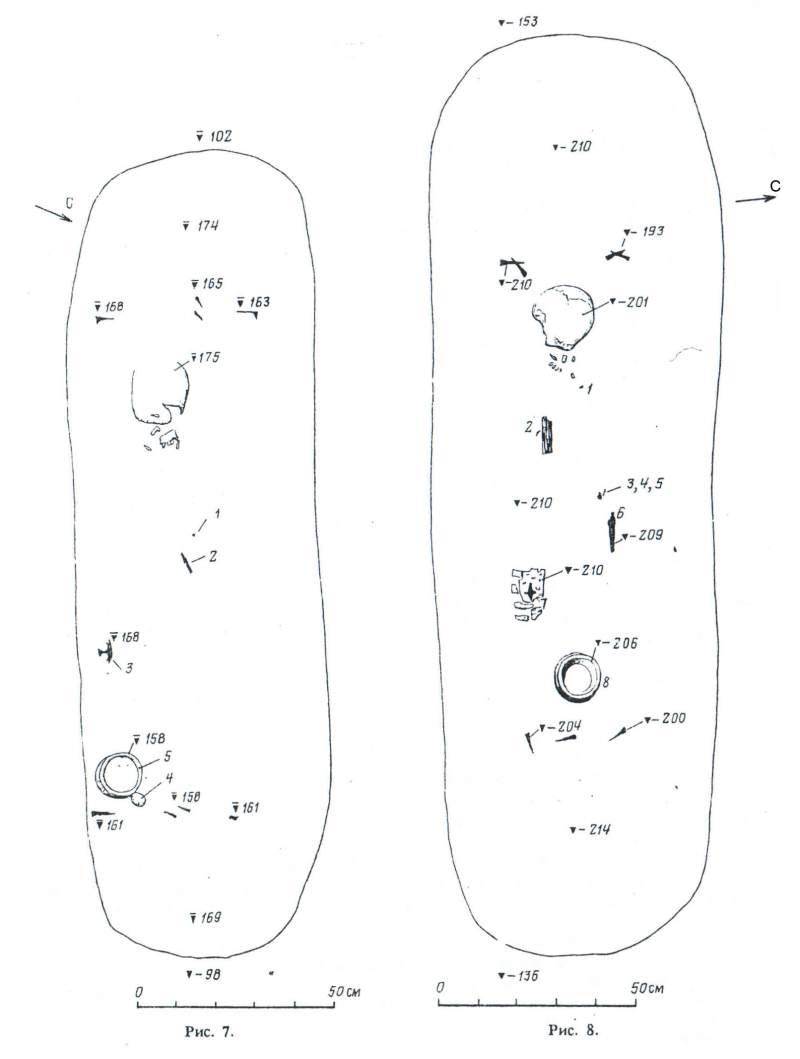 В. П. Даркевич справедливо обратил внимание на то, что топорики не встречаются в женских погребениях в наборах амулетов. Действительно, из девяти документированных погребений с топориками лишь два являются женскими. В кург. 41 второй Колчинской группы топорик найден у плеча погребенной женщины (Каталог, № 53). В погр. 17 Выжумского III могильника мининтюрный топорик находился на груди погребенной на одной низке с бусами (Каталог, № 19), но этот могильник принадлежит древним марийцам, в среде которых значение древнерусских амулетов могло истолковываться по-своему. Пять погребений с амулетами-топориками принадлежат мальчикам (Кемский некрополь, Митяево, Белая Вежа, Каталог, № 10, 35, 42, 43. 57), одно – подростку 17-19 лет (Кемский некрополь, Каталог, № 11). Детское захоронение в кург. 6 в Кемской. группе сопровождалось боевым топором и боевым наконечником стрелы, захоронение подростка из кург. 9 – бронзовым навершием рукояти плети и острием с кольцом, т. е.. предметами, связанными с воинским снаряжением. В детских и мужских погребениях миниатюрные топорики покоятся в ногах у костяков – у стопы, у колена или у таза справа (рис. 7, 8), там же, где должны находиться настоящие топоры. Таким образом, амулеты-топорики, представляющие собой прекрасные образцы прикладного искусства, не были украшениями и не имели постоянного места в костюме.