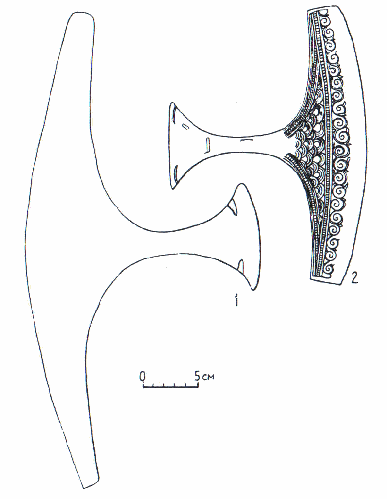 Амулеты второй группы воспроизводят форму широколезвийных секир, получивших в X-XI вв. широкое распространение в Скандинавии и Прибалтике. На территории Древней Руси находки широколезвийных секир сравнительно редки. Среди ближайших прототипов амулетам второй группы можно указать секиру из Кемскоro некрополя в Белозерье (рис. 4, 1), из могильника Оленина в Углицком Поволжье [12, 67, рис. 57] и Лаптау в Восточной Пруссии (рис. 4, 2). У этих секир удлиненный вырезной обух с короткими боковыми щековицами к мысообразными выступами на тыльной стороне и тонкая узкая шейка. У секиры из могильника Оленина посредине лезвия имеется отверстие для крепления чехла. Все эти особенности точно переданы на миниатюрных топориках. Есть, однако, и различия: на секирах из Кемскогo некрополя и Лаптау отсутствуют шпорцы, возможно, эта деталь миниатюрных широколезвийных секир заимствована от боевых топоров типа IV, часто имевших шпорцу на тыльной стороне. Многие широколезвийные секиры были покрыты серебряной инкрустацией [7, с. 167-170], в их числе секира из Лаптау (рис. 4, 2), декор которой находит соответствие с орнаментацией парадных топориков типа IV [11, с. 457, 458], а следовательно, и в орнаментации миниатюрных топориков-амулетов. Очевидно, простые узоры на миниатюрных топориках второго типа соответствуют сложным орнаментальным композициям на широколезвийных секирах.