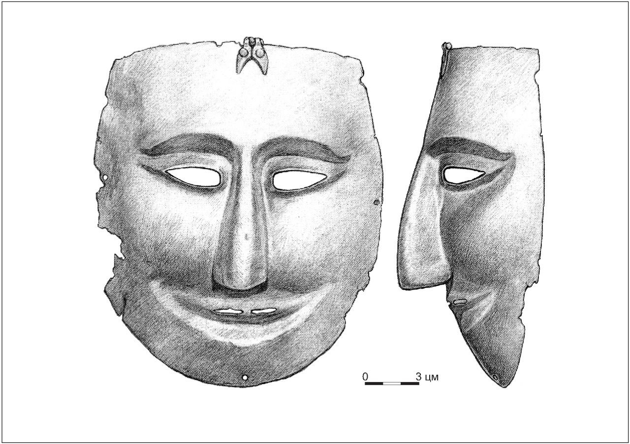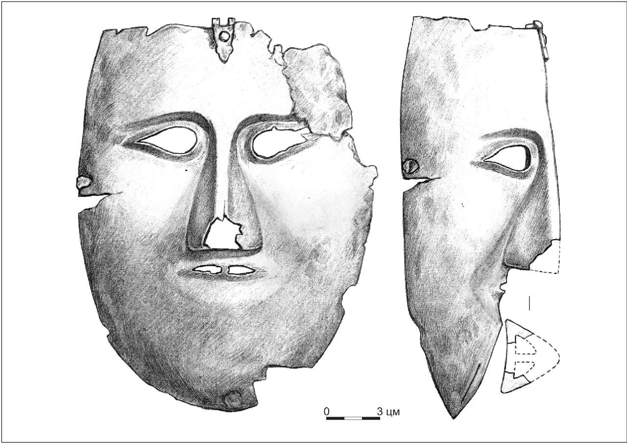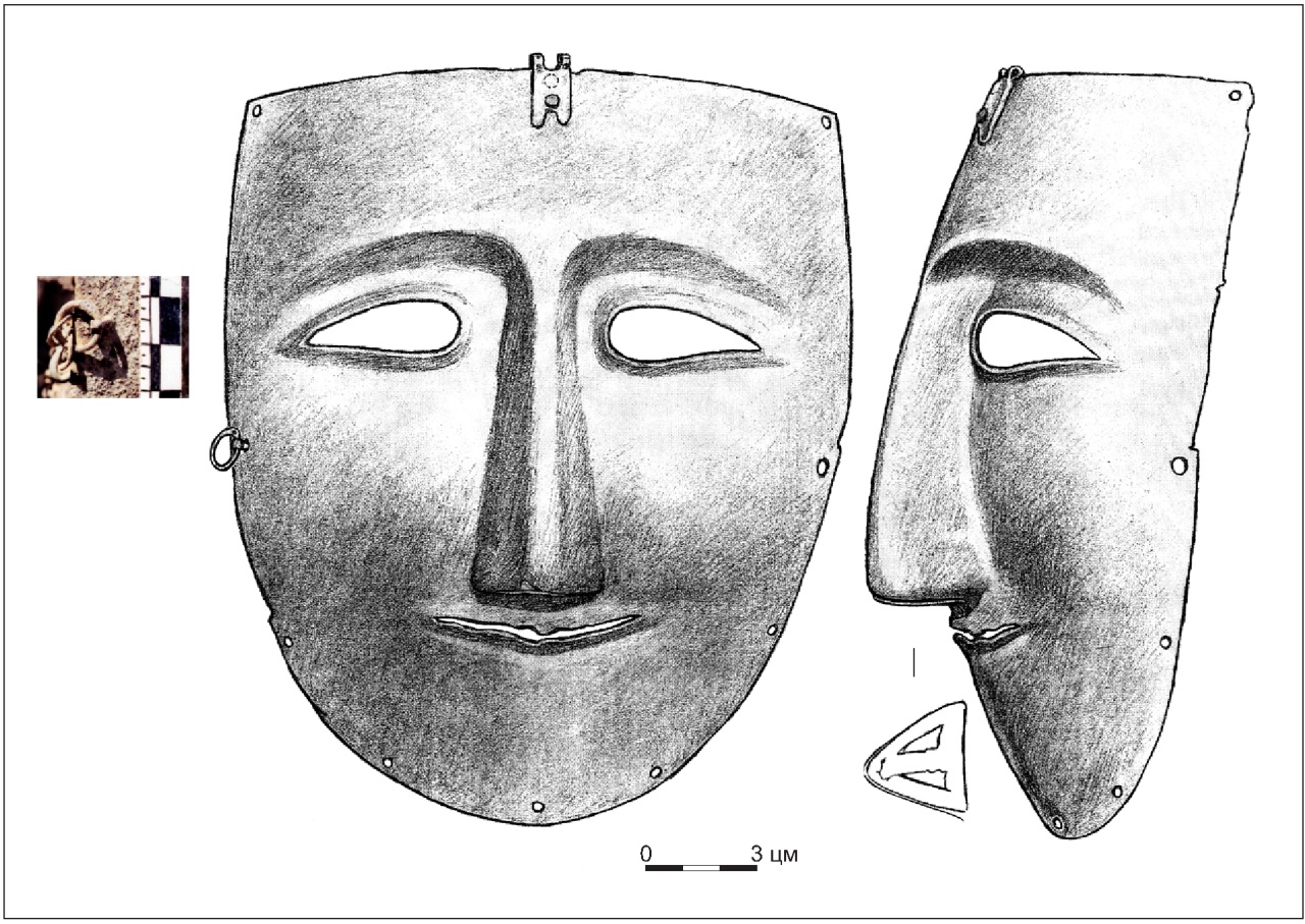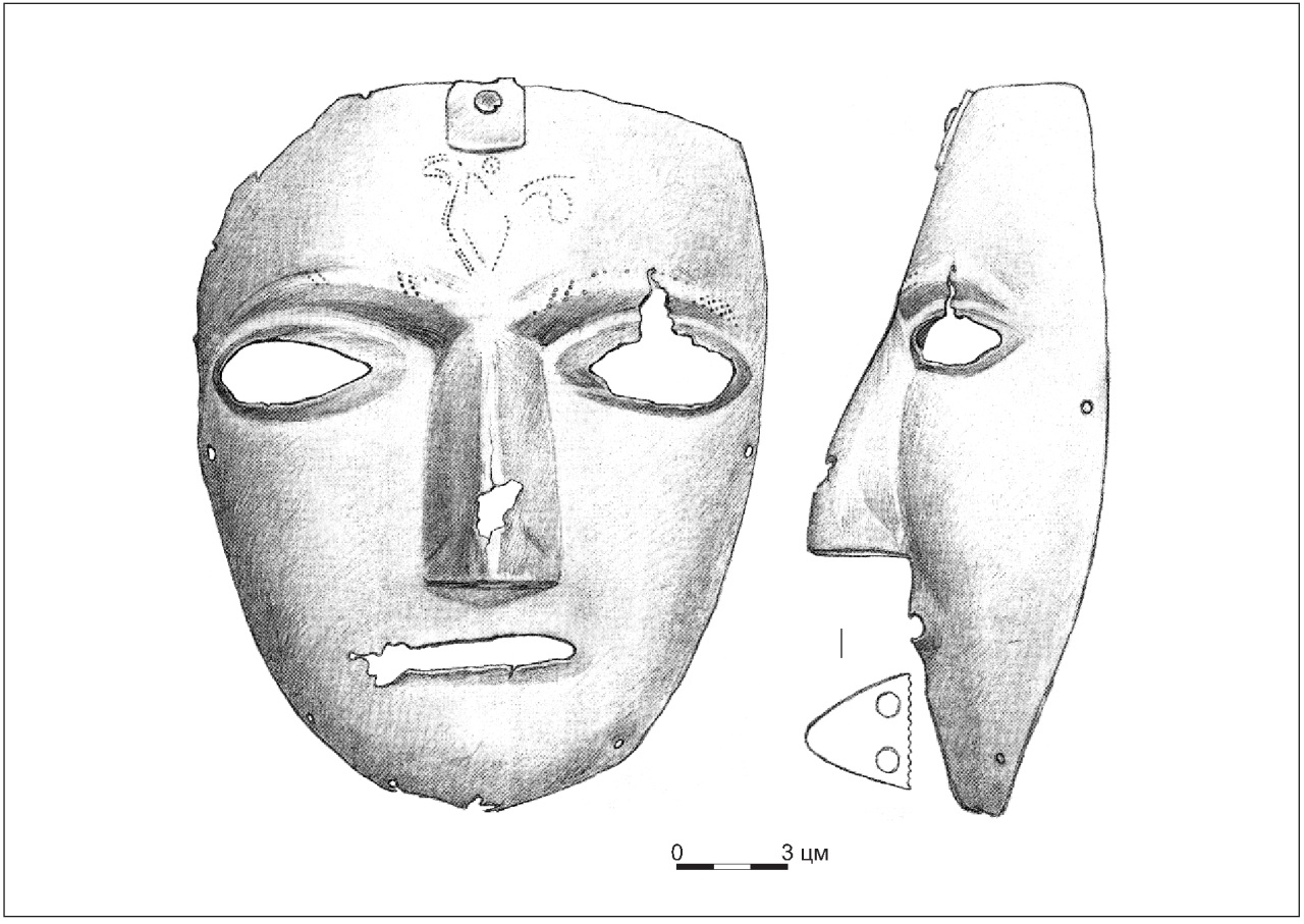 Если мы обратимся к находке хорошо известной маски из кургана 53 у с. Ковали, относящийся к другому, более проработанному, типу масок, то на ее левом ухе – декоративном элементе, предназначенным для украшения маски – также присутствует кольцо (Бобринский 1901, 123). Это кольцо примечательно тем, что оно являлось частью дополнительной системы фиксации маски (Кирпичников 1958, 61; 1966, 216-217). И то обстоятельство, что кольцо и штифт на итумкалинской маске, расположенные на одном уровне с кольцом и ухом на ковалевской находке, а так же то, что именно они задействованы для соединения маски с кольчато-пластинчатой защитой оголовья, не оставляет у нас сомнений, что и здесь мы имеем дело с устройством, предназначенным для дополнительной фиксации маски.