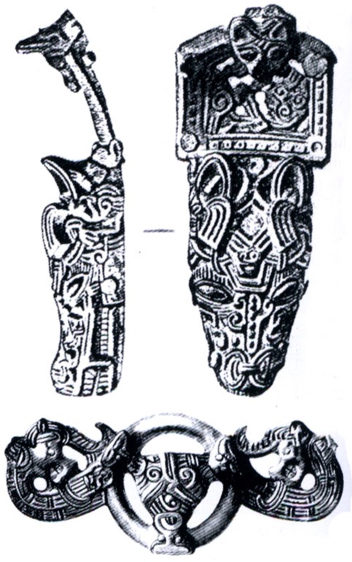Состоятельные люди заботились о богатом убранстве для своих лошадей. Наиболее нарядной частью конской упряжи несомненно была узда. Так как на территории Древней Руси не найдено ни одного целого уздечного набора, то нам пришлось объединить на рисунке детали, происходящие из разных мест, но выдержанные в одном орнаментальном стиле. За основу для реконструкции взята относительно хорошо сохранившаяся узда, найденная в Гнёздовском могильнике, украшенная множеством бронзовых квадратных бляшек в стиле Борре. На лбу лошади закреплялся дракончик с подвижной нижней челюстью, которая при езде открывалась и закрывалась. Подобный дракончик, помимо Гнёздова, найден в одном из владимирских курганов. Он сохранился несколько лучше, и именно его мы изобразили на реконструкции. Аналоги богато декорированных бронзовых удил с псалиями имеются, как в Скандинавии, так и на территории Руси (Супрутское городище).