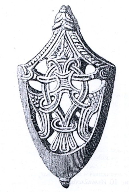 Иногда нижний конец ножен снабжался бронзовым ажурным наконечником. В X -первой половине XI веков на территории Древней Руси были распространены наконечники с изображением дракона или птицы. Ножны меча на нашей реконструкции украшает наконечник широко распространенного в Скандинавии типа; на территории Руси подобные наконечники найдены в Гнёздово, Новгороде и на городище Крутик.