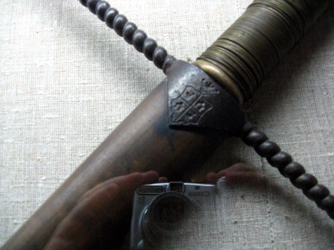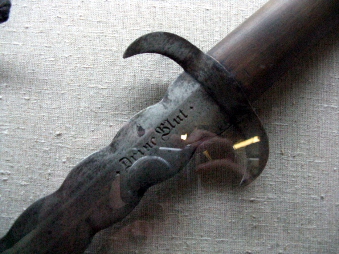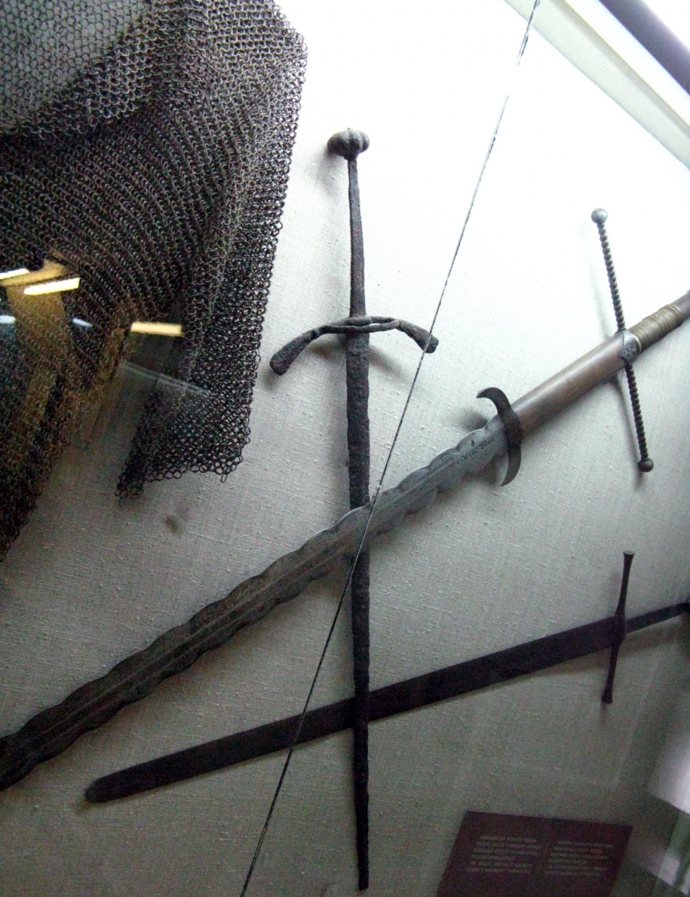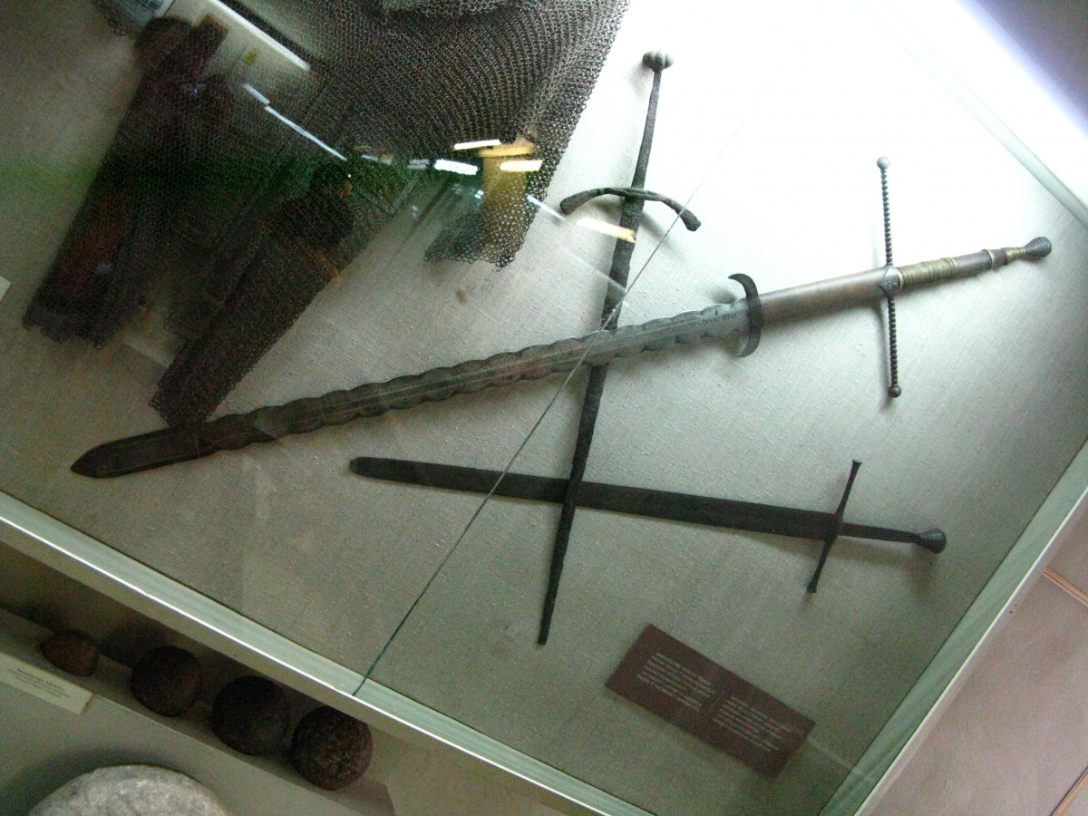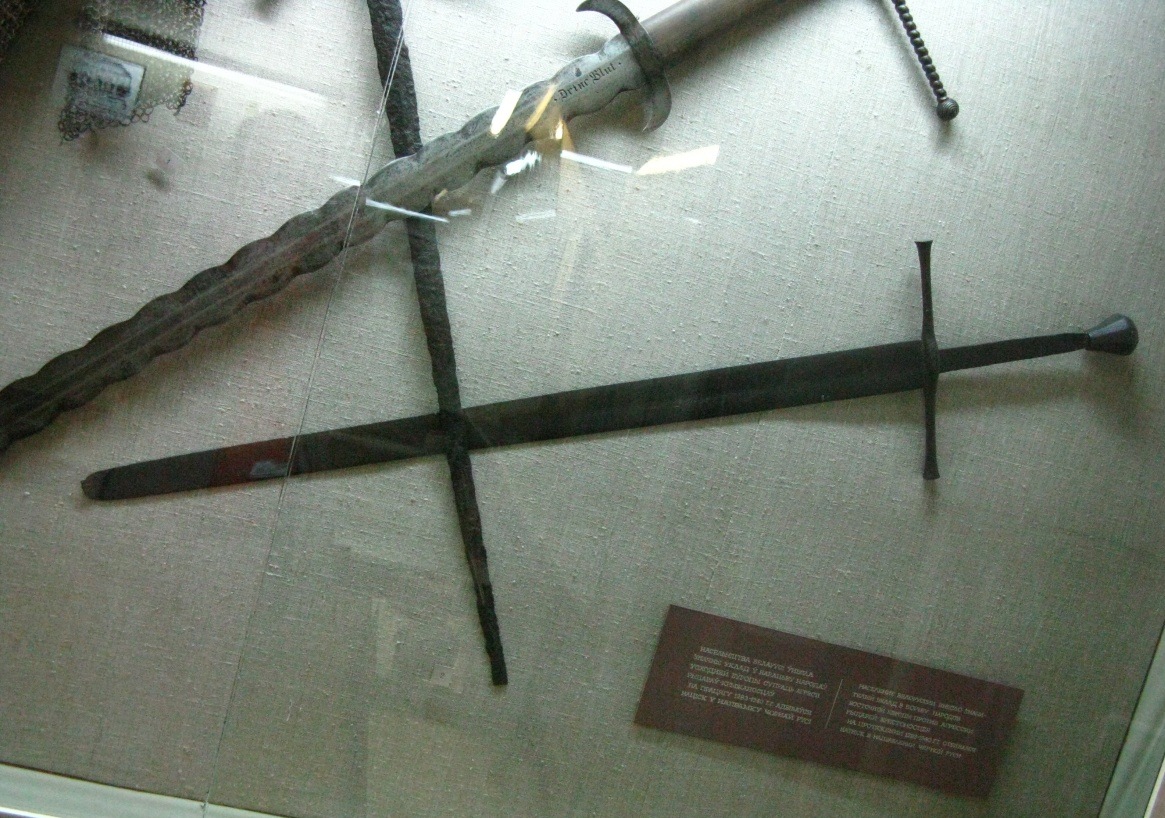 1. Среди них двуручных меч "фламберг" с надписью "Drink Blut", неоднократно публиковался в популярных изданиях как образец оружия крестоносцев. Необходимо уточнить, что такую трактовку этого довольно тщательно выполненного новодела, который до 1939 г. оформлял интерьер имения Потоцких в Рутцы (сегодня Подляшское воеводство Республики Польша), можно объяснить лишь невысоким уровнем оружиеведения в Беларуси. В то время, когда появился такой тип мечей, крестоносцев уже не было. Кроме того, можно с полной уверенностью утверждать, что человек, который делал этот меч, настоящего фламберга не видел, а в качестве образца пользовался каким-то рисунком (возможно, с "Энциклопедии оружия" Бейхама).