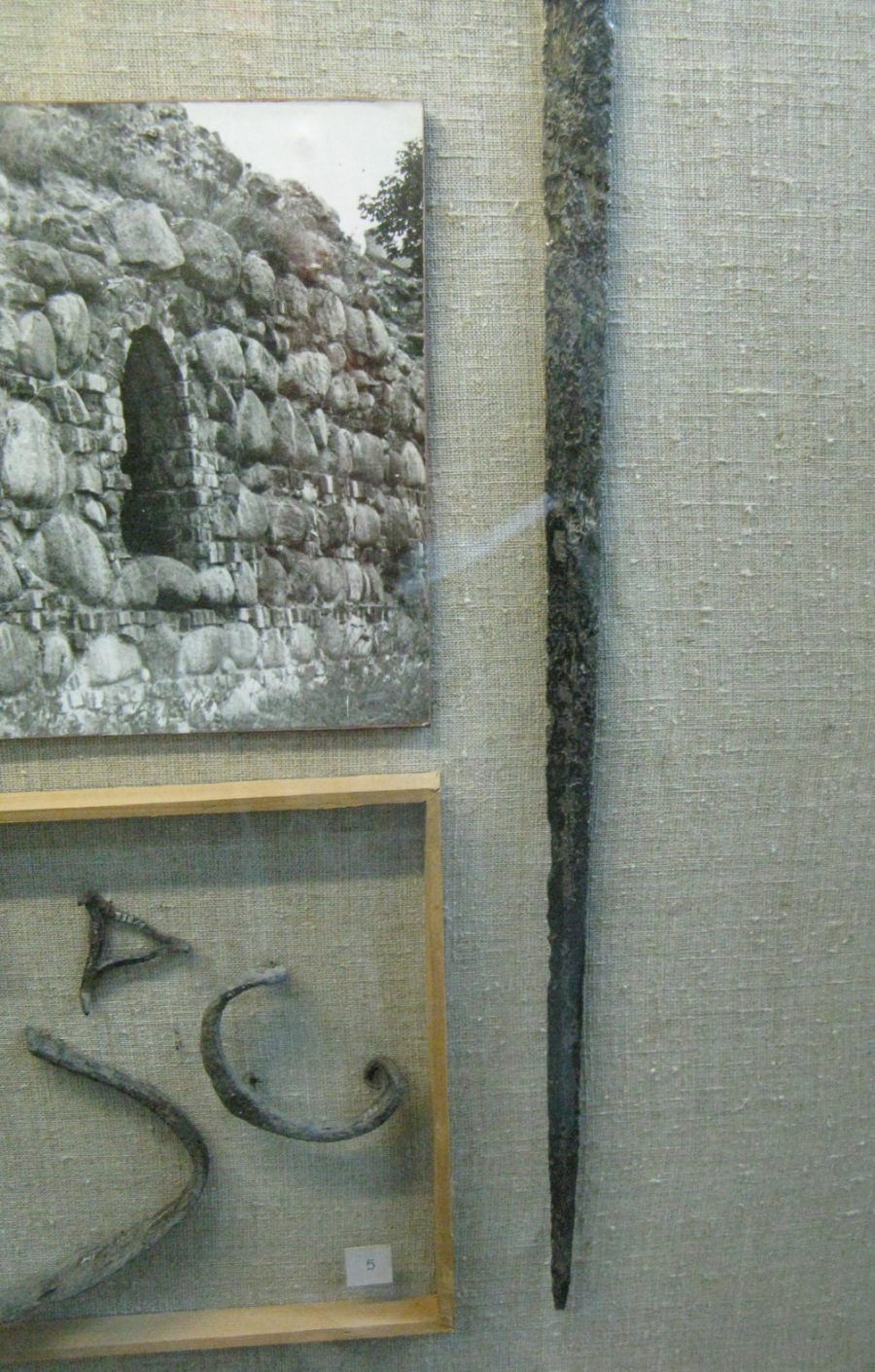 Очень важным для датирования и пояснения меча является тот факт, что вместе с ним были найдены вещи, которые составляют почти полное боевое снаряжение всадника начала-середины 13 в.: Наконечники копья и сулицы, железка боевого топора, конический шлем с остатками бармицы, пряжки (большая и малые для крепления острог), удила, шпилька и три стремени. А.К. Кравцэвич, который первый обработал и опубликовал этот археологический клад, предположил, что это могло быть места захоронения местного воина-феодала. С этим можно было бы согласиться, тем более что меч у кладет был разломан пополам (это было частью погребального обряда), но тогда возникают дополнительные вопросы: почему стремени три и где человеческие останки? Однако в любом случае, независимо от того, как меч попал на берег Немана - в результате захоронения или был спрятан вместе с другими вещами и позже не найден – это оружие несомненно принадлежит к числу памятников, которые очерчивают уровень вооружения воинов-дружинников Гродненщины в 13 веке. Подробная статья о мече и сопутсвующих предметах, читать.