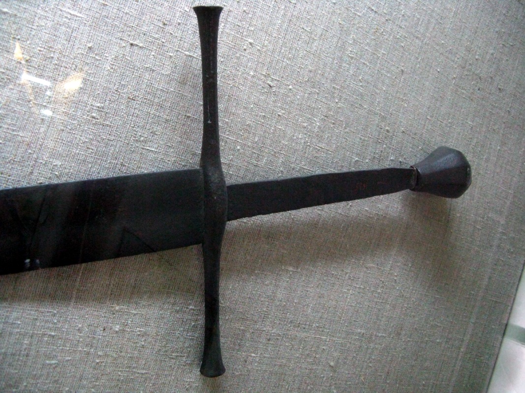 На наших землях меч также символизировал княжескую власть. Мечник – человек, занимавший должность в судебной княжеской администрации назывался он так потому, что носил меч как символ справедливости. В 13-16 в. в Великом княжестве Литовском мечи были массовым оружием. В белорусских городах существовали цеха изготовителей мечей, где главным экзаменом на звание мастера считалось изготовление меча-шедевра. Чтобы сделать такой меч давалось 12 недель. Мечи ковали с использованием технологии сварки прутков из железа, ковкой вытягивали в длину, складывали вдвое и опять проковывали. Такая операция повторялась несколько раз и в результате получали твердые и упругие клинки. Мечи из коллекции ГИАМ созданны по такой технологии, на их поверхности хорошо видно неоднородная структура металла, где рядом с науглероженными участками есть полоски мягкого железа с невысоким содержанием углерода.
