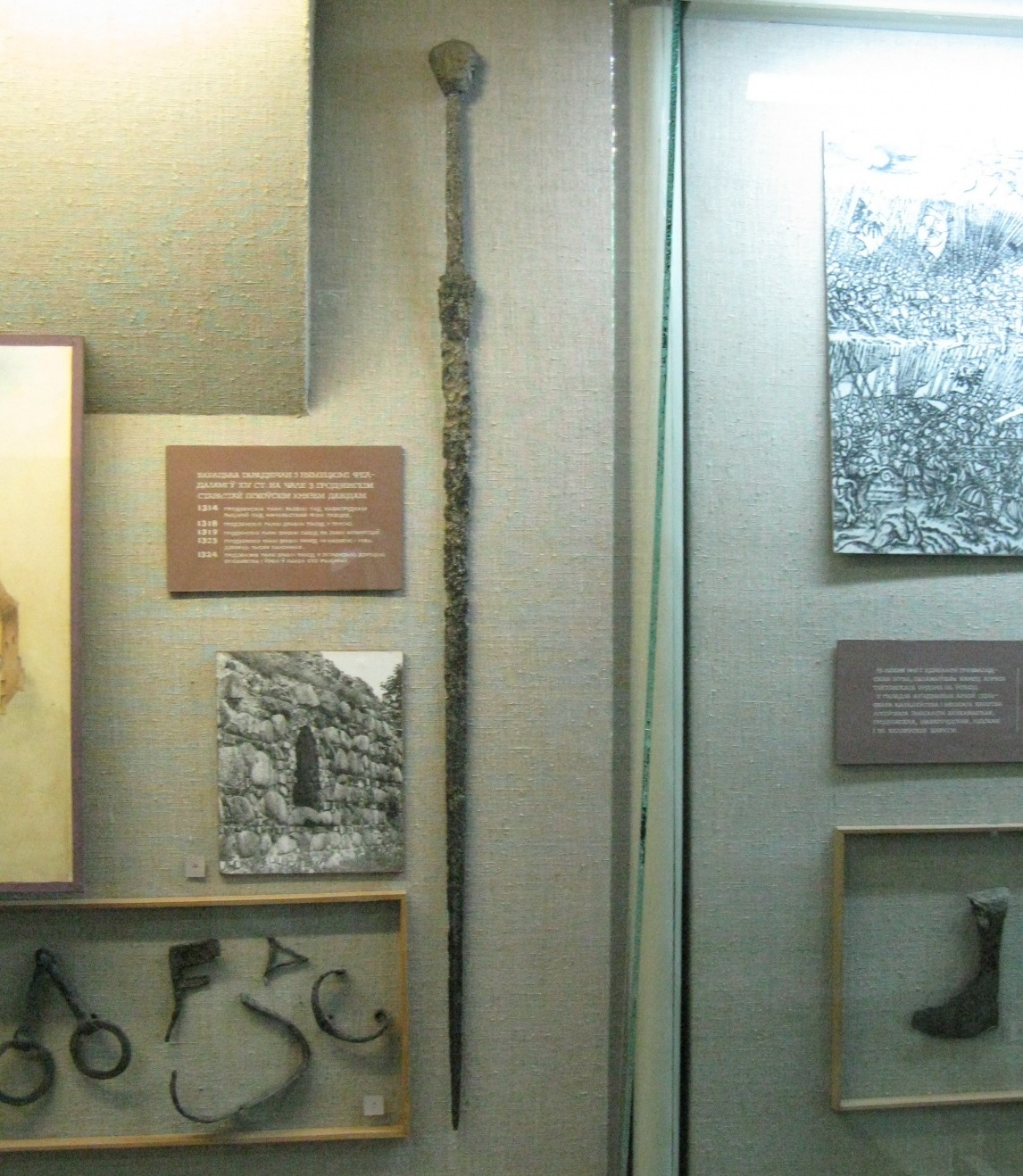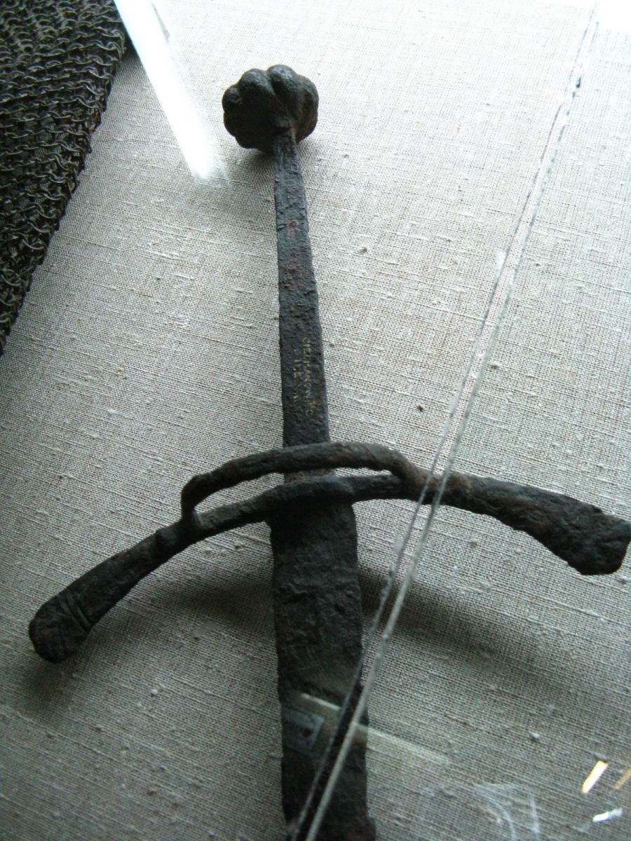 Меч отражает эволюцию, которая происходила в развитии форм северо и центральноевропейских мечей с середины 13 в. В результате изменений клинок меча становился более тонким и предназначался для сильного колющего удара. Вполне вероятно, что этот меч имеет отношение к заключительному этапу войны с крестоносцами. Однако если обратиться к работе М. Глосека, то наибольшее количество мечей типа "XV а" и очень похожего на него меч типа "XVII" зафиксирован на территории Чехословакии (8 из 15 и 9 из 22)14. Это дает основания предположить, что данный меч мог быть связан с известным историческим эпизодом 1422 года – предложением гуситами Великому князю Витовту чешской короны и коронацией вместо его князя Сигизмунда Корибутовича, которого Витовт послал в Чехию с 5-тысячным войском. Возможно, меч был принесен на наши земли каким-нибудь рыцарем из этой армии.