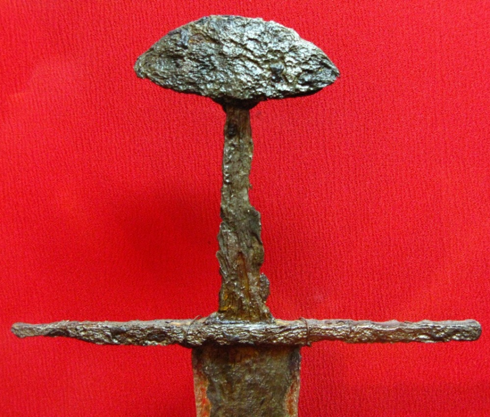 Черенок рукояти плоский. Постепенно сужающийся к навершию. Из-за больших каверн ржавчины кузнечные символы или их следы выделить невозможно. Навершие по форме напоминает горизонтально вытянутый овал с двумя значительными симметрично расположенными углублениями на верхнем крае. На плоских поверхностях навершие сохранились следы украшения, из которых можно разглядеть отчетливо углубленную линию, нанесенную параллельно нижнему краю. Крестовина не закреплена, прямая, постепенно сужающаяся к концам. Клинок сильно корродирован, дол неглубокий, начинается у пятки. В 55 мм от основания виден след выбитого знака, который похож на подкову. Размеры: общая длина меча – 240 мм, длина черенка – 93 мм, ширина черенка у клинка – 28 мм, крестовина – 165 мм, навершие 34x78x15 мм, длина клинка – 115 мм, ширина клинка у основания – 51 мм.