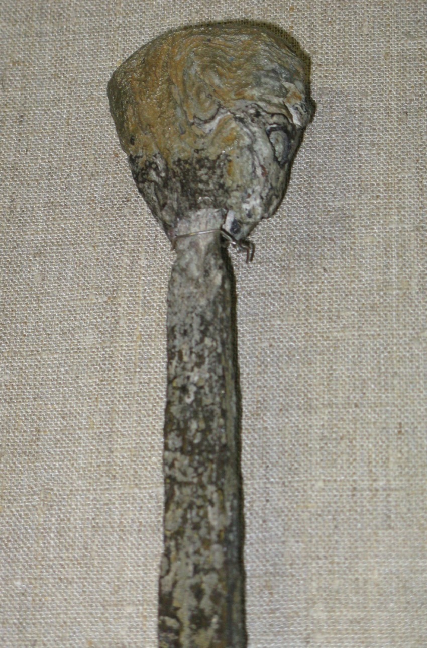 Черенок рукояти плоский, постепенно сужающийся к навершию. Навершие сильно повреждена, деформирована, однако по части, которая сохранилась, можно сделать вывод, что оно было грушевидным и восьмигранным. Клинок в сечении у основания шестигранный, далее переходит в ромбический. В 46 мм от рукояти можно разглядеть часть знака, который изначально выглядел как равноконечный крест с раздвоенными концами поперечин, взятый в окружность (Рис. III, 5а). Диаметр окружности около 10-11 мм, крест – 8x8 мм. Знак был выполнен инкрустацией бронзой. Возможно, этот значок является лишь частью более сложного изображения клейма. Размеры: общая длина меча – 1082 мм. Длина рукояти – 232 мм; ширина черенка уоснования – 20 мм; навершие – 53x49x41 мм, длина клинка – 850 мм; ширина клинка у рукояти (из-за коррозии явно уменьшена) – 40 мм.