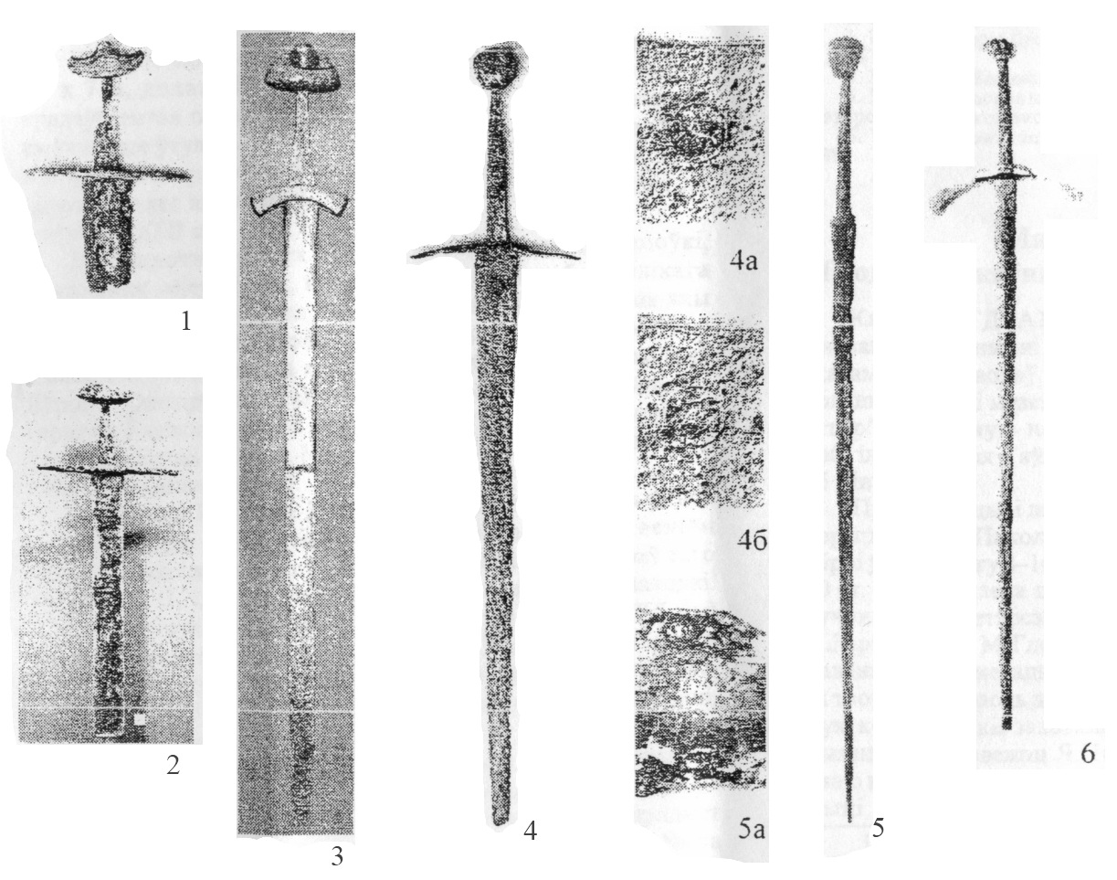 | Рис I. 1. Меч 950-1100 гг. КП-28786. 2. Меч 1000-1100 гг. КП-3482. 3. Меч 1230-1250 гг. КП-80615/1. 4. Меч 1280-1370 гг КП-31099. 4а. Клеймо на клинке меча КП-81099. 4б. Клеймо на обратной стороне клинка меча КП-81099. 5. Меч 1350-1450 гг. КП-31044. 5а. Клеймо на клинке меча КП–31044. |