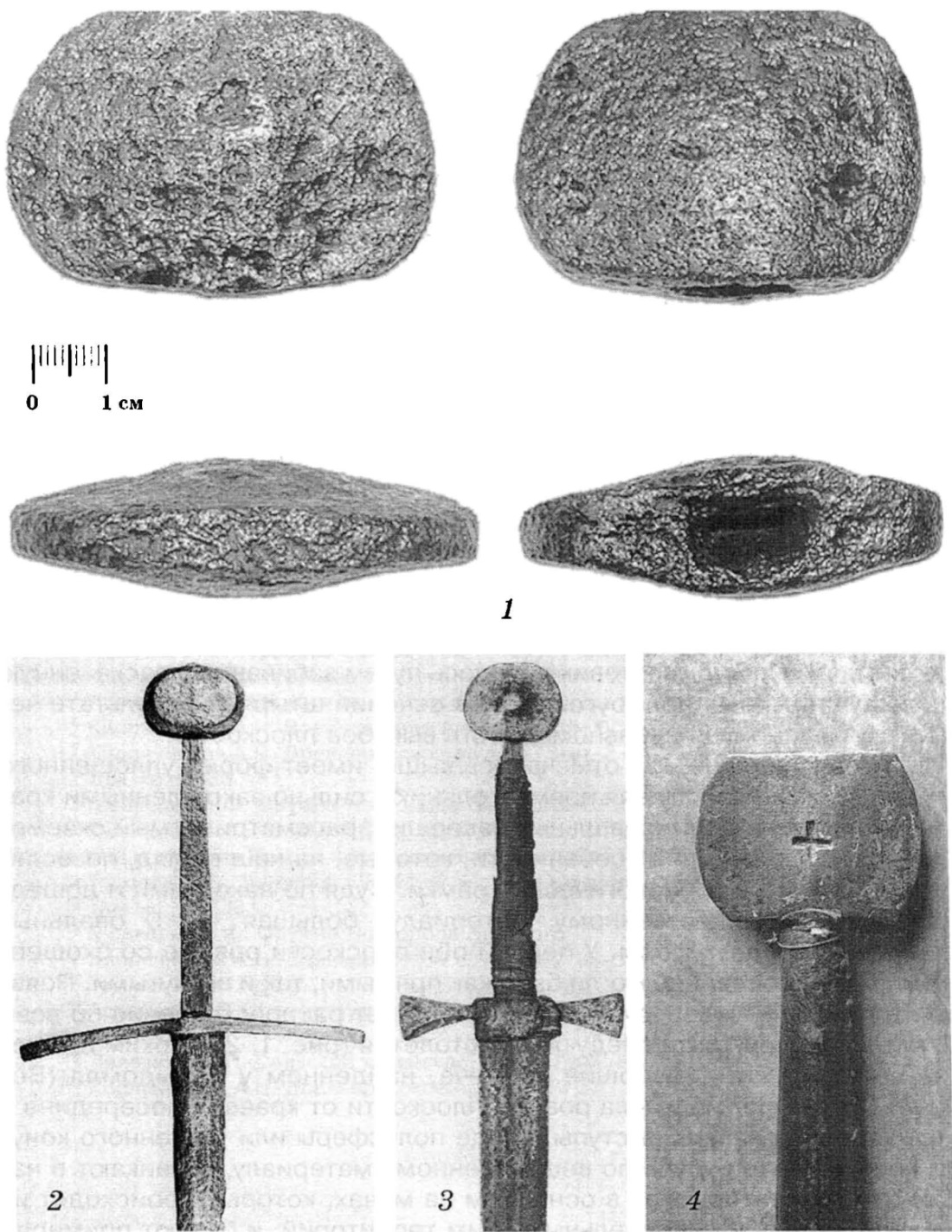 Данное навершие, как отмечалось выше, имеет форму уплощенного овала, несколько напоминая прямоугольник с сильно закругленными краями. В отличие от других овальных наверший, рассматриваемый экземпляр имеет свои внешние особенности, которые, на наш взгляд, позволяют определить его хронологические рамки. Судя по находками и дошедшему до нас вещественному материалу, большая часть овальных наверший были двух форм. У первой обе плоскости ровные со скошенными краями, последние могли быть как прямыми, так и вогнутыми. Появляется эта форма к середине XIV в. и получает распространение по всей Европе до первой трети следующего столетия (рис. 1, 2)1 Ярким примером может служить навершие на мече, найденном у с. Рыдомля (Волынь)2. Вторая форма имела ровные плоскости от краев, а посередине с обеих сторон делались выступы в виде полусферы или усеченного конуса. Такие навершия, судя по вещественному материалу, возникают в начале XIV в. и монтируются в основном на мечах, которые происходят из немецких земель и сопредельных к ним территорий, и бытуют примерно до середины XV в. (рис. 1, 3)3.