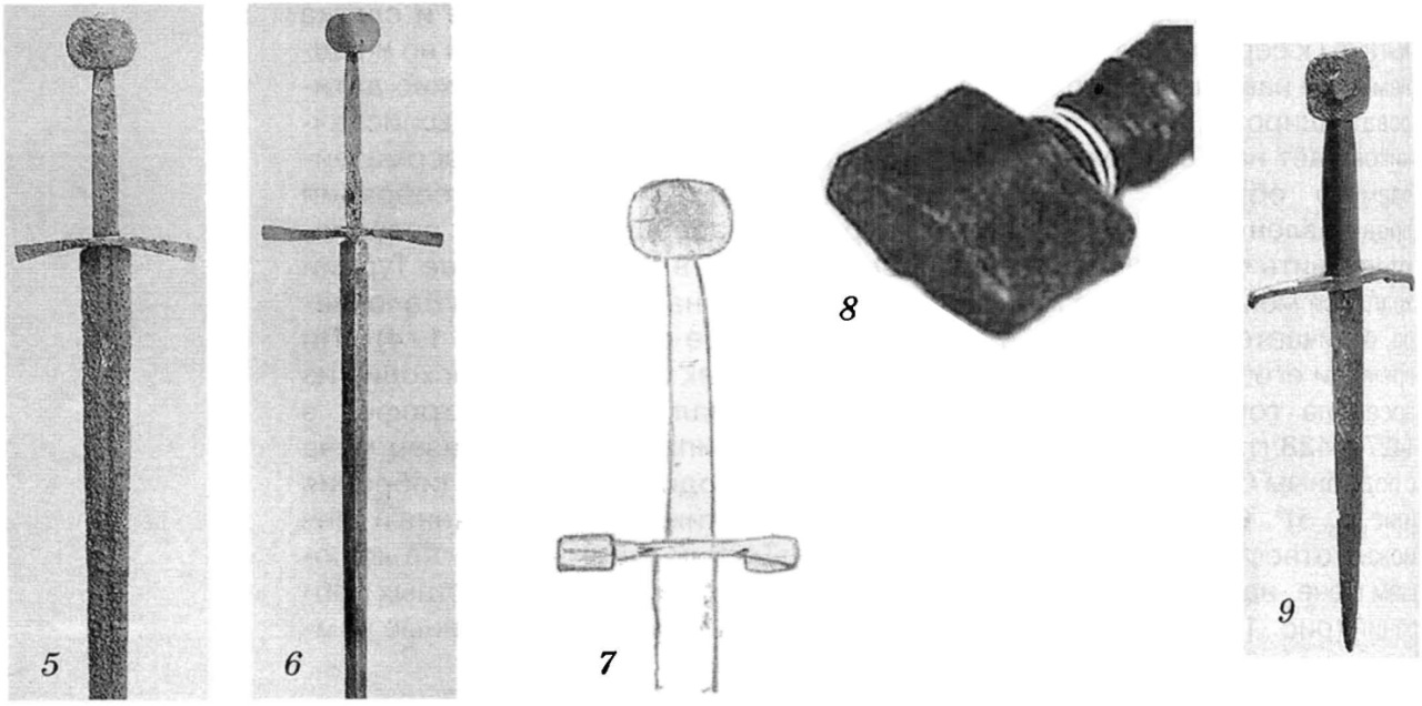Кроме формы, данное навершие имеет еще одну особенность – отверстие под хвостовик, которое, как было отмечено, не сквозное, а доходит до середины. Для большинства мечей, начиная со времен раннего Средневековья, характерно наличие навершия как раз со сквозным отверстием. Это позволяло лучше закрепить данный элемент на хвостовике. На рассмотренных выше образцах такой особенности, кроме второго экземпляра, не выявлено по причине их изображения в одном ракурсе и общем описании. Но в XV столетии, по всей видимости, стали делать навершия, где отверстия идут насквозь. Тому примером может служить пара образцов наверший с такой особенностью. Одно на мече конца XV в. (инв. № НАМ 75) из собрания Музея-арсенала Хаггинса (США) (рис. 1, 8)9, представляющее собой прямоугольник с вертикальными ребрами по центру на обеих плоскостях. Другое на кинжале (рубеж XV-XVI вв.) из частной коллекции (рис. 1, 9)10, по форме квадратное, с небольшими выступами в центре с обеих сторон. Оба предмета происходят из Центральной Европы. Следовательно, можно сделать предположение, что подобная особенность также характерна для указанного региона.