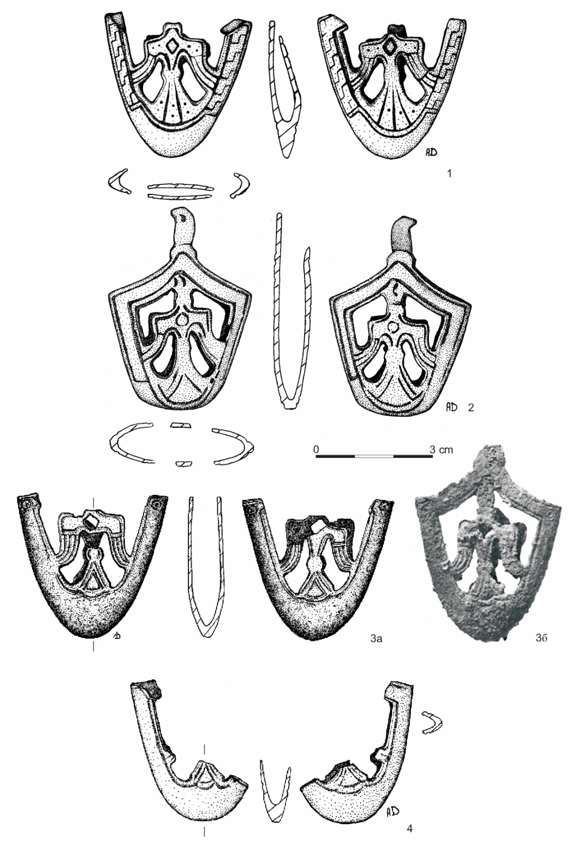 Рис. 4. Наконечники ножен тип Гн-1.1. 1 - № 1 (в Каталоге наконечников ножен мечей); 2 - № 2; 3 - № 4 (3а - современное состояние наконечника, 3б - наконечник после находки - по Сизов 1902, табл. У1П:5); 4 - № 3.