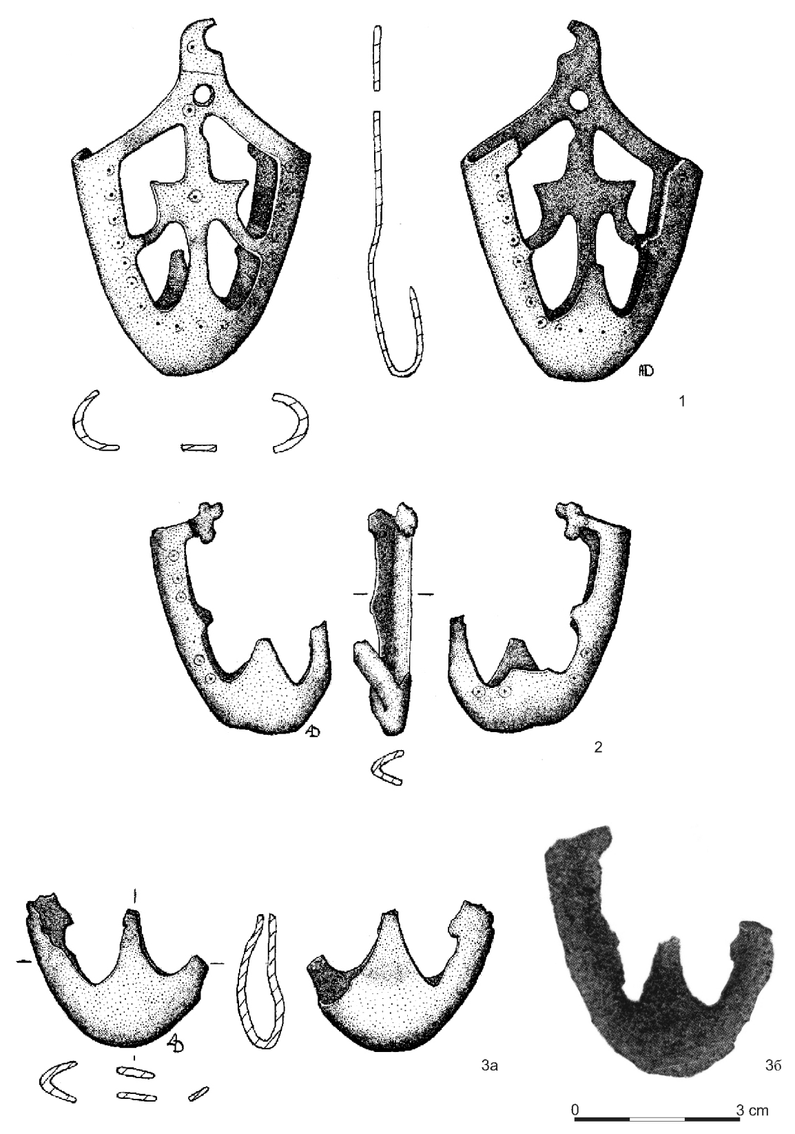 Рис. 5. Наконечники ножен типа Гн-I.2. 1 - № 10; 2 - № 5; 3 - № 8 (3а - современное состояние наконечника, 36 - наконечник после находки - по Спицын 1905, рис. 118).