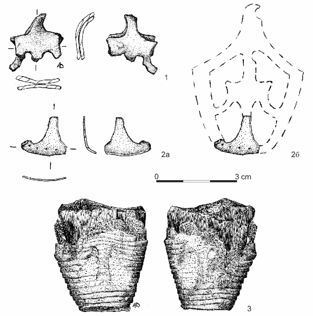 Рис. 6. Наконечники ножен типа Гн-I.2. 1 - № 7; 2а - № 9 (2б - реконструкция расположения фрагмента наконечника ножен); 3 - № 6 (фрагмент нижней части ножен меча с отпечатком наконечника типа Гн-I.2).