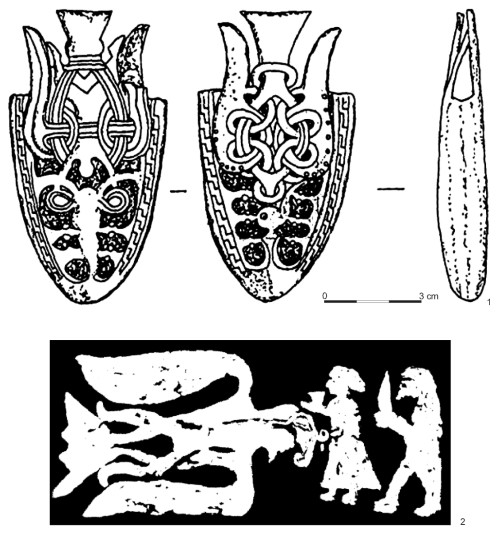 Fig 7. 1 - sword’s chape from excavation in Birka (after Ambrosiani, Androshuyk 2006, 4, puc. 2:3); 2 - image of human and bird figures on runic stone Hammars III, Gotland, Sweden (Ambrosiani 2001,13, fig. 1:4).