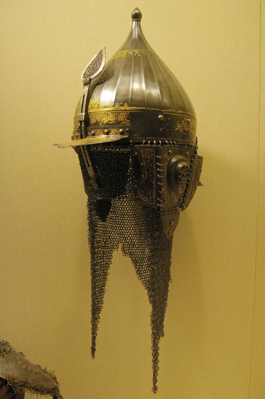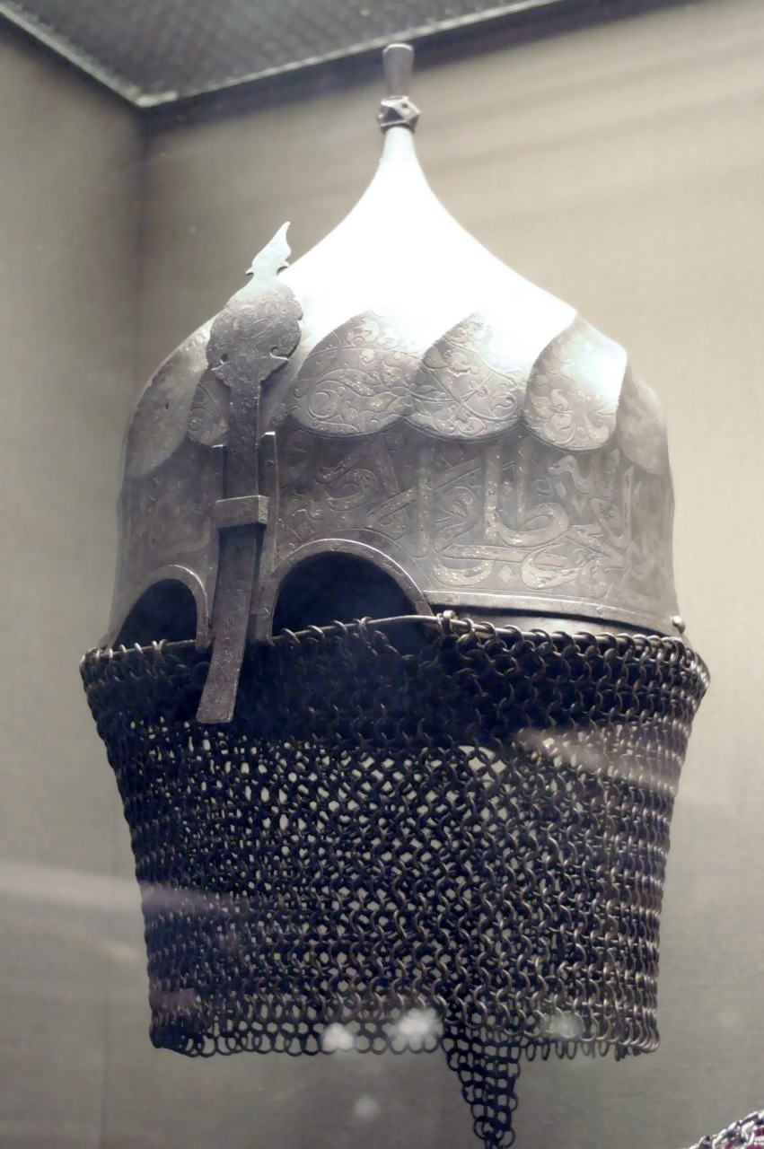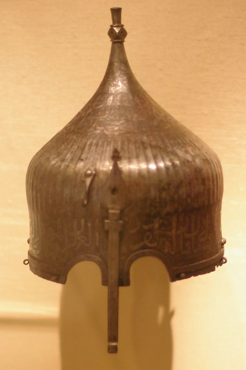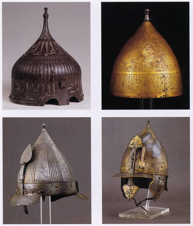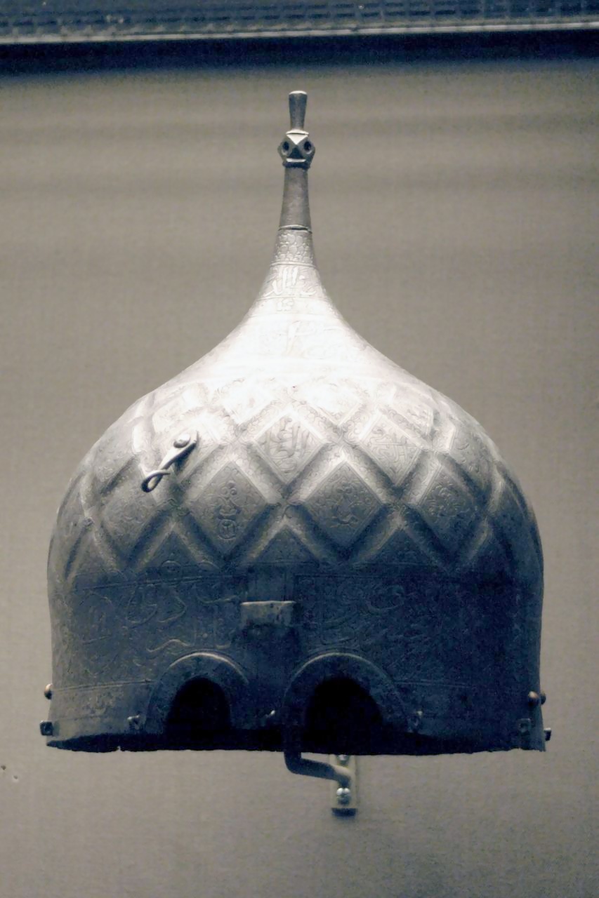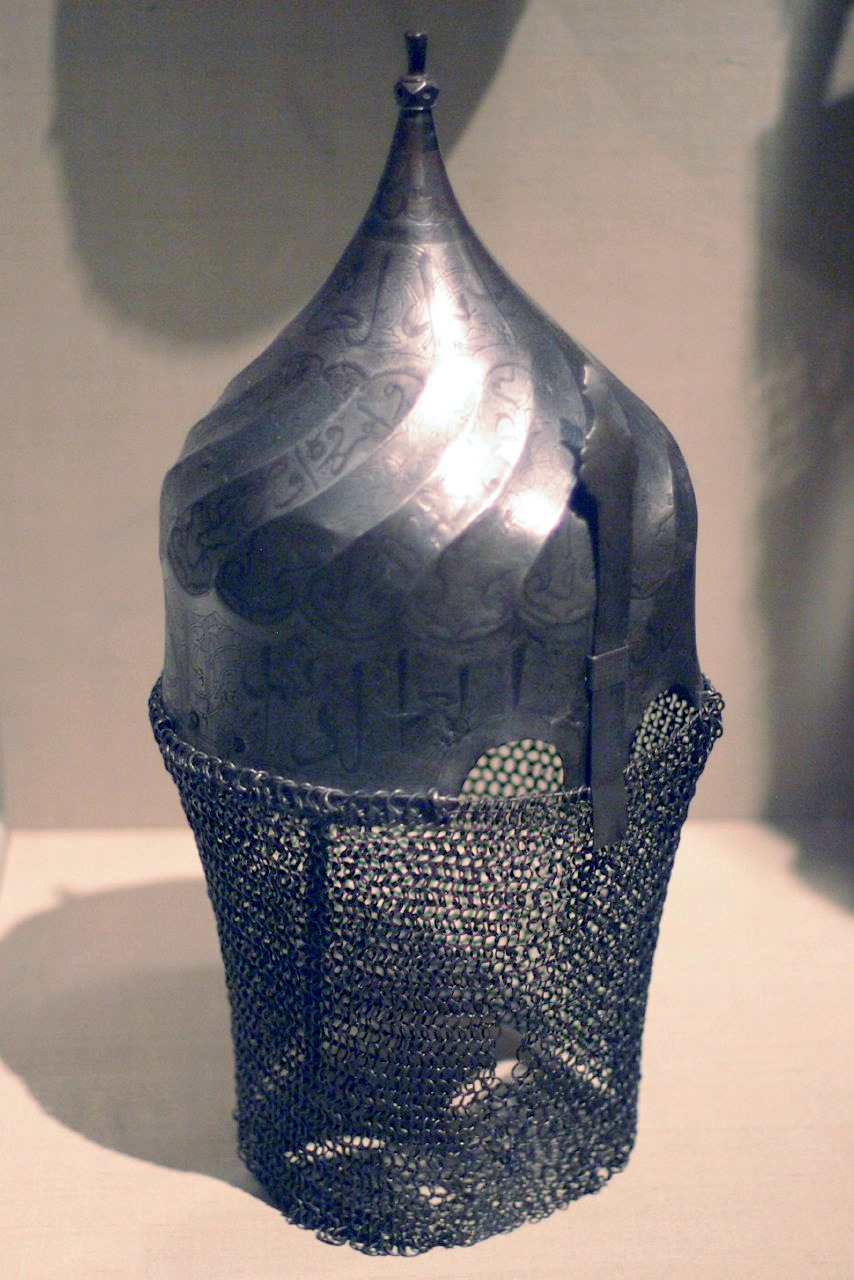 2. Тюрбанный шлем (анг. turban helmet, турецк. Turban miğfer ), нижняя половина его довольно глубокой тульи была цилинрической формы и имела вырезы для глаз, верхняя часть тульи была конической формы, с коротким шпилем. Коплектовался пластиной-наносником похожей на ложку и кольчужной бармицей. Причем бармица была длинной и круговой: защищала шлею плечи нижнюю половину лица и рот воина. Кольчуга нисколько не затрудняет дыхание, но ржавеет под действием влаги, поэтому кольца кольчуги воронили или танатировали. Тюрбанные шлемы происходят из Северного Ирана: Империи Тимура и Ак-Коюнлу. Ранние тюрбанные шлемы выделяются своей цилиндросферической тульей, которая склепана из нескольких частей и они не имели навершия. Классические тюрбанные шлемы датирутся второй половиной 15 -нач. 16 века.