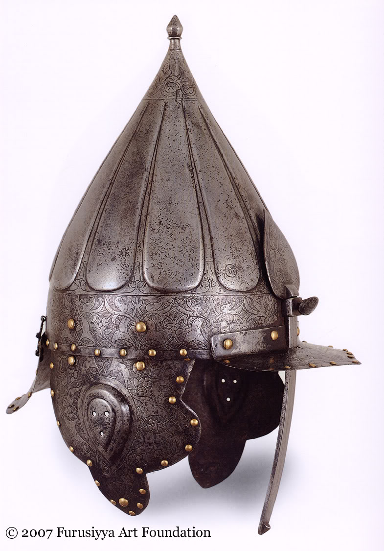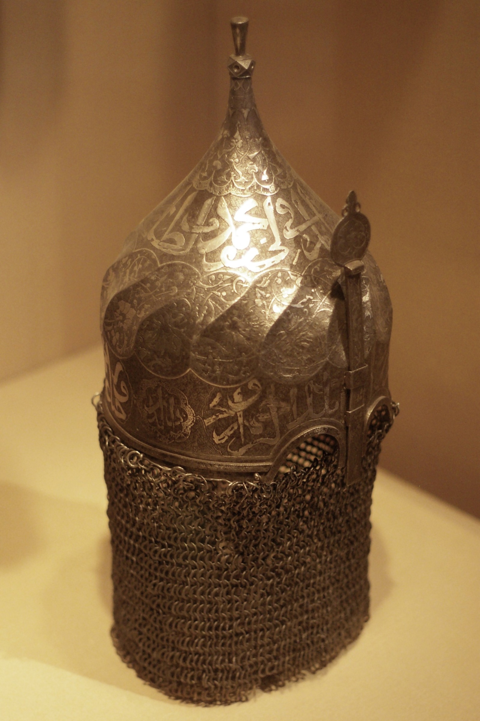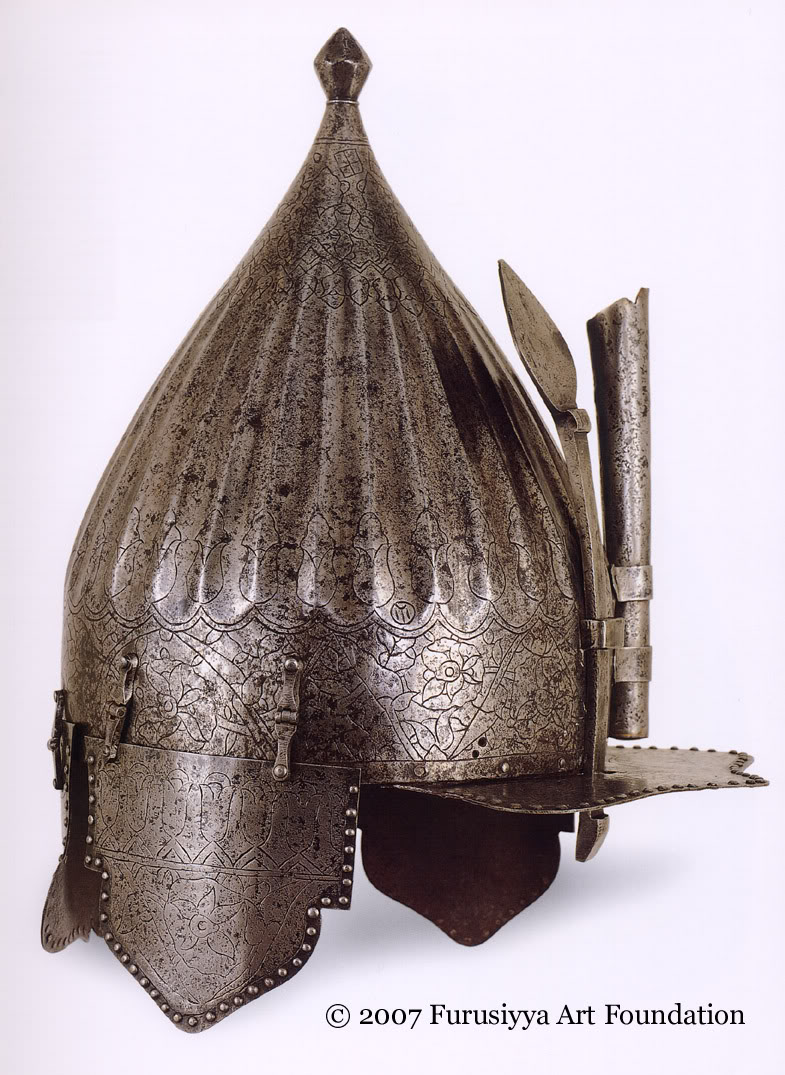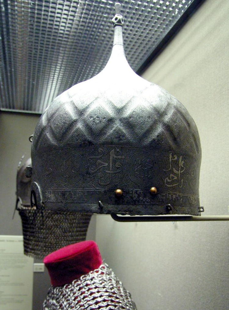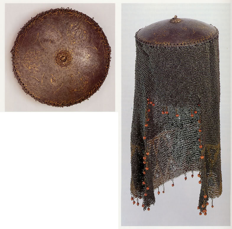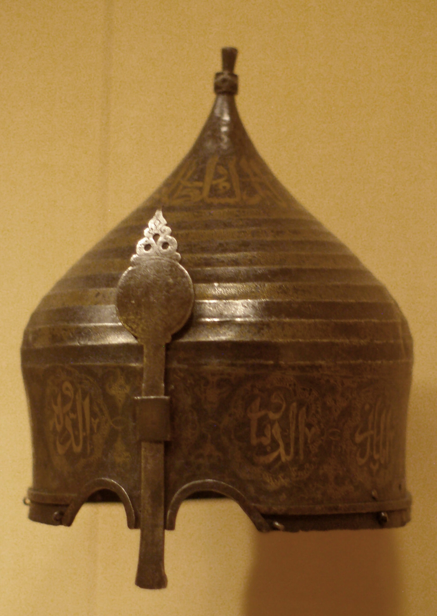 2. Тюрбанный шлем (анг. turban helmet, турецк. Turban miğfer ), нижняя половина его довольно глубокой тульи была цилинрической формы и имела вырезы для глаз, верхняя часть тульи была конической формы, с коротким шпилем. Коплектовался пластиной-наносником похожей на ложку и кольчужной бармицей. Причем бармица была длинной и круговой: защищала шлею плечи нижнюю половину лица и рот воина. Кольчуга нисколько не затрудняет дыхание, но ржавеет под действием влаги, поэтому кольца кольчуги воронили или танатировали. Тюрбанные шлемы происходят из Северного Ирана: Империи Тимура и Ак-Коюнлу. Ранние тюрбанные шлемы выделяются своей цилиндросферической тульей, которая склепана из нескольких частей и они не имели навершия. Классические тюрбанные шлемы датирутся второй половиной 15 -нач. 16 века.