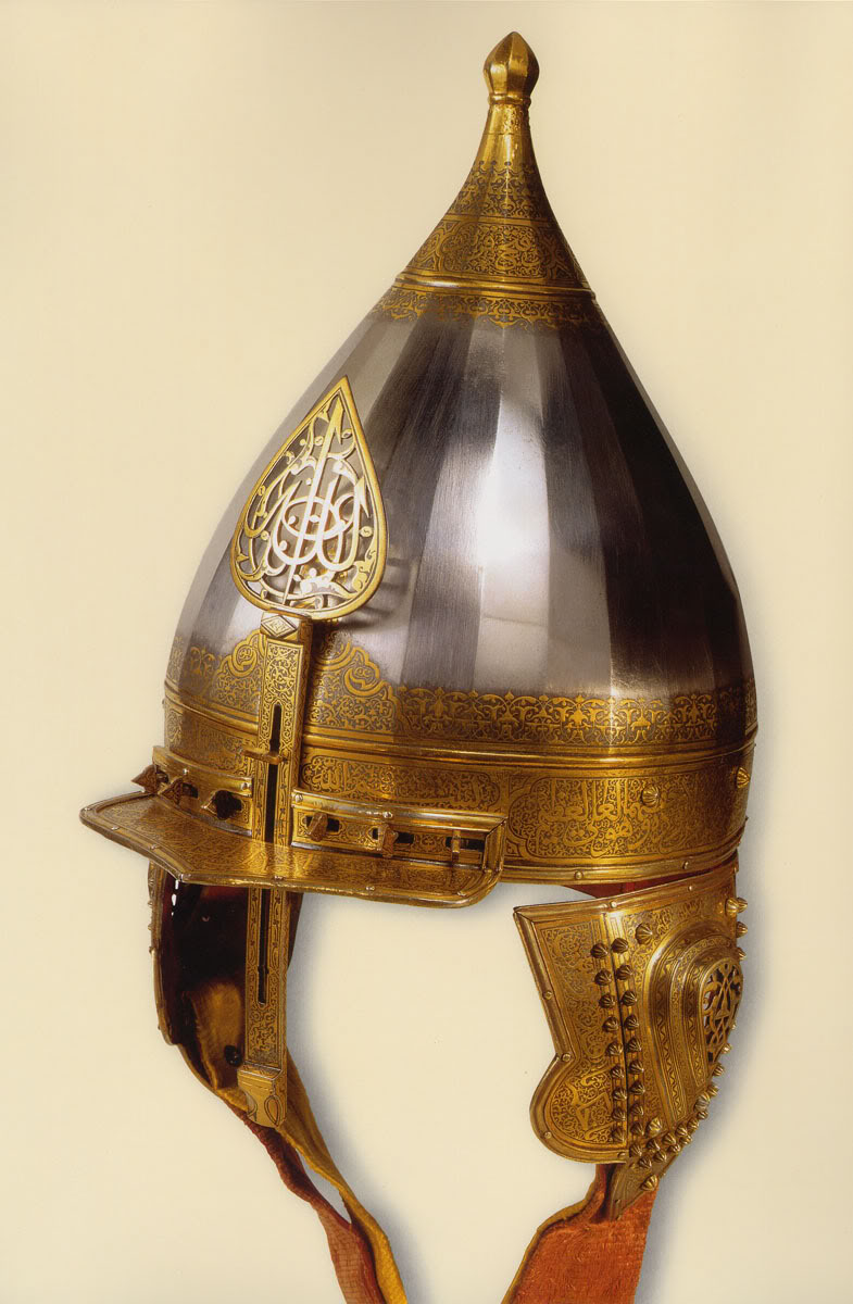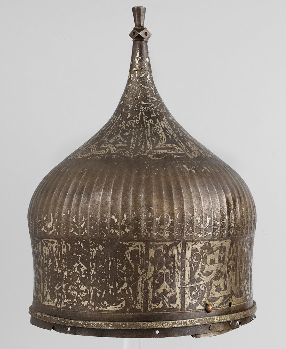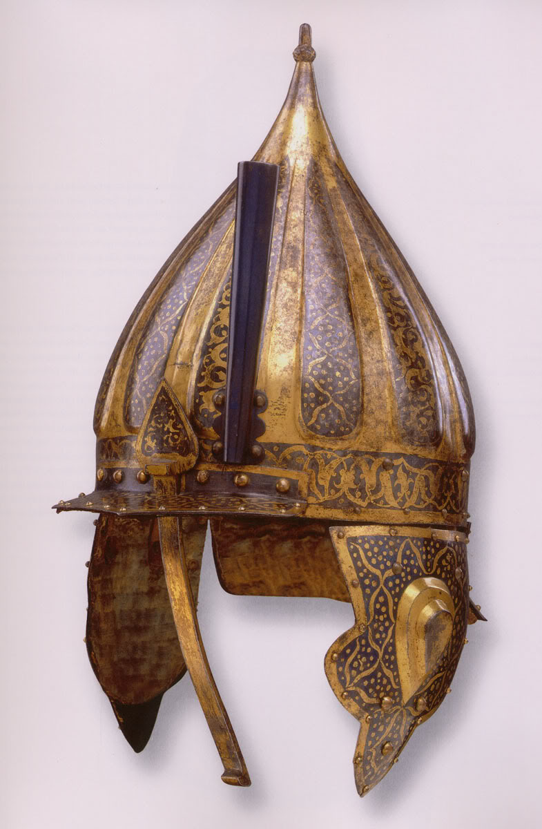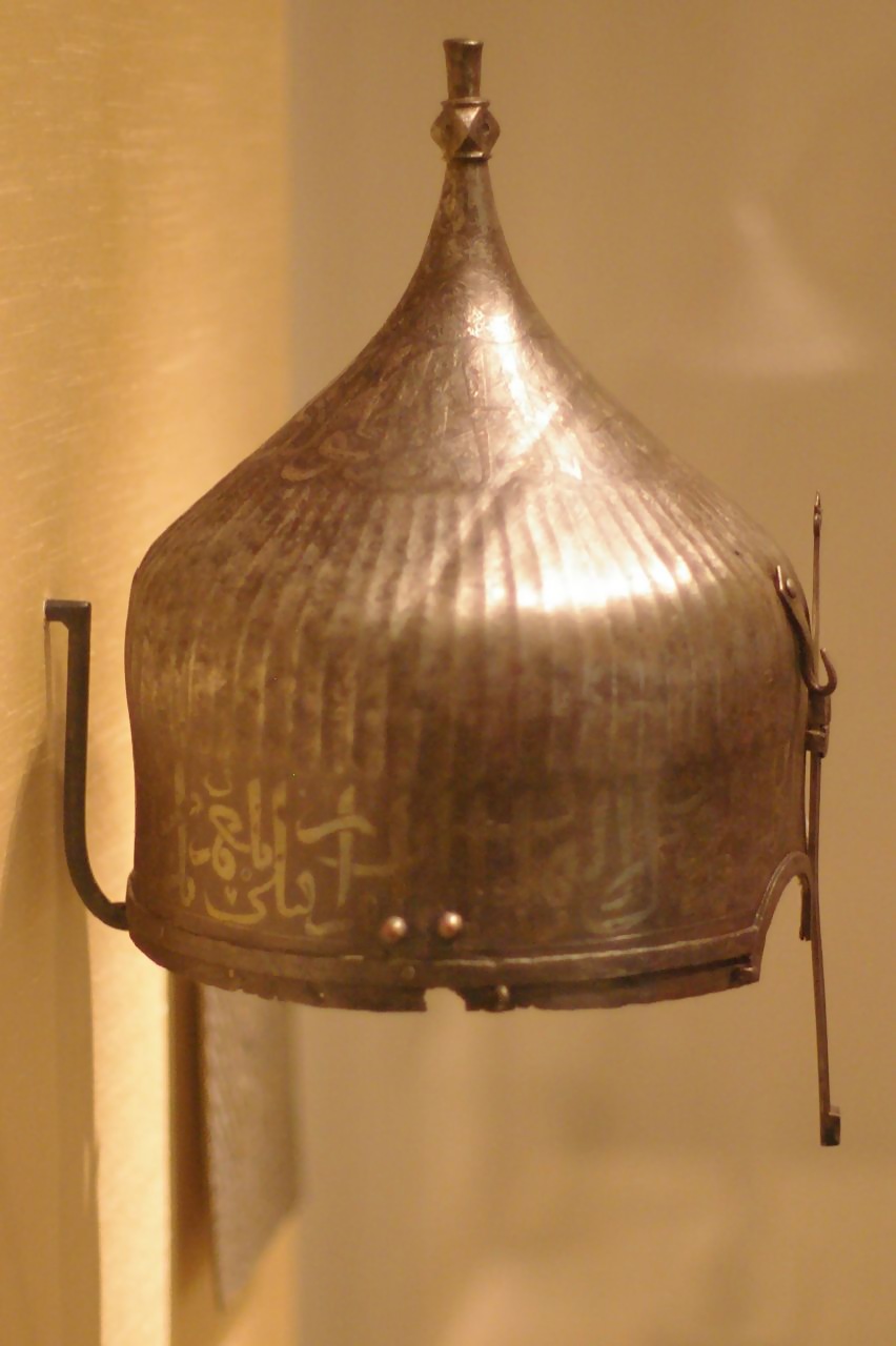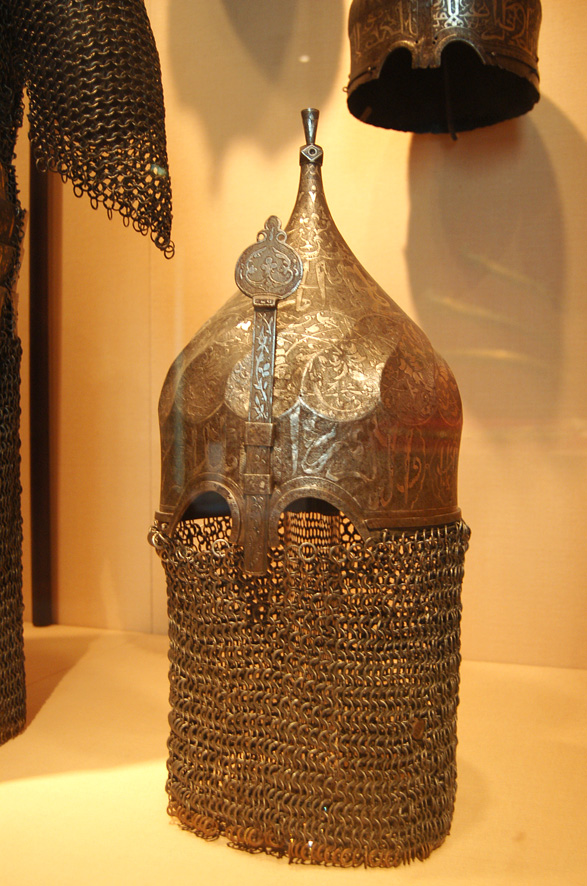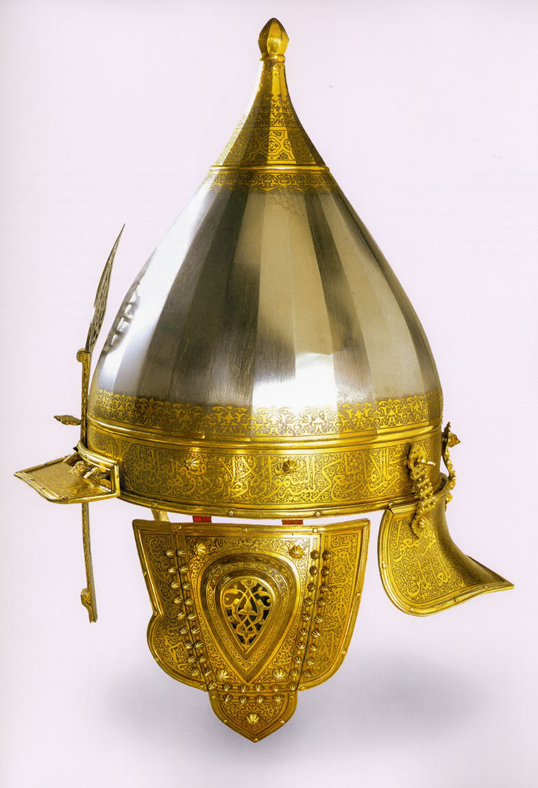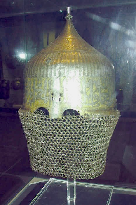 2. Тюрбанный шлем (анг. turban helmet, турецк. Turban miğfer ), нижняя половина его довольно глубокой тульи была цилинрической формы и имела вырезы для глаз, верхняя часть тульи была конической формы, с коротким шпилем. Коплектовался пластиной-наносником похожей на ложку и кольчужной бармицей. Причем бармица была длинной и круговой: защищала шлею плечи нижнюю половину лица и рот воина. Кольчуга нисколько не затрудняет дыхание, но ржавеет под действием влаги, поэтому кольца кольчуги воронили или танатировали. Тюрбанные шлемы происходят из Северного Ирана: Империи Тимура и Ак-Коюнлу. Ранние тюрбанные шлемы выделяются своей цилиндросферической тульей, которая склепана из нескольких частей и они не имели навершия. Классические тюрбанные шлемы датирутся второй половиной 15 -нач. 16 века.