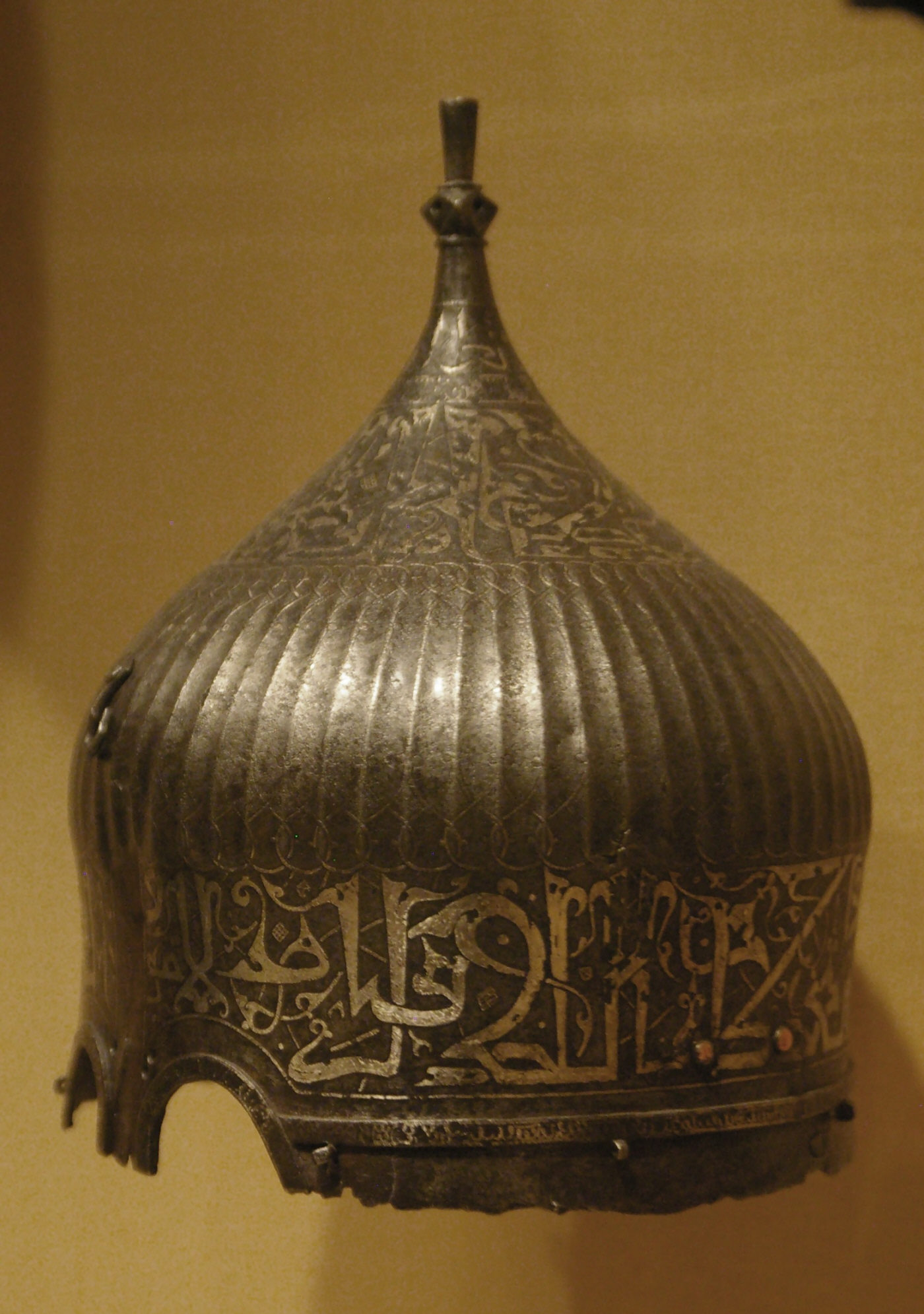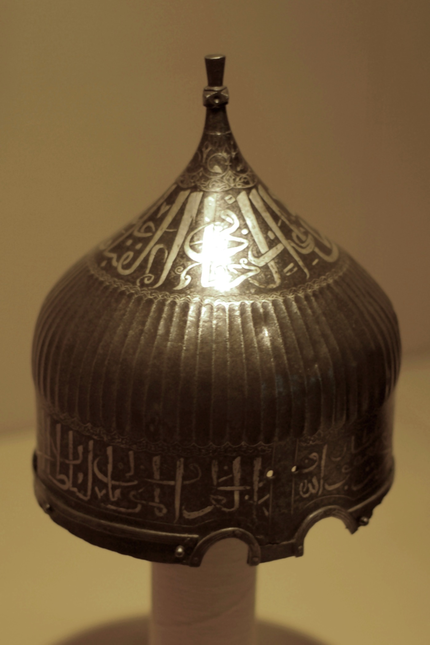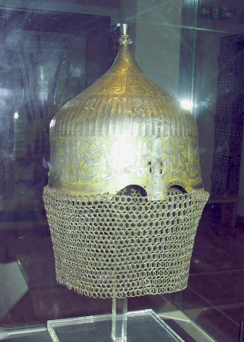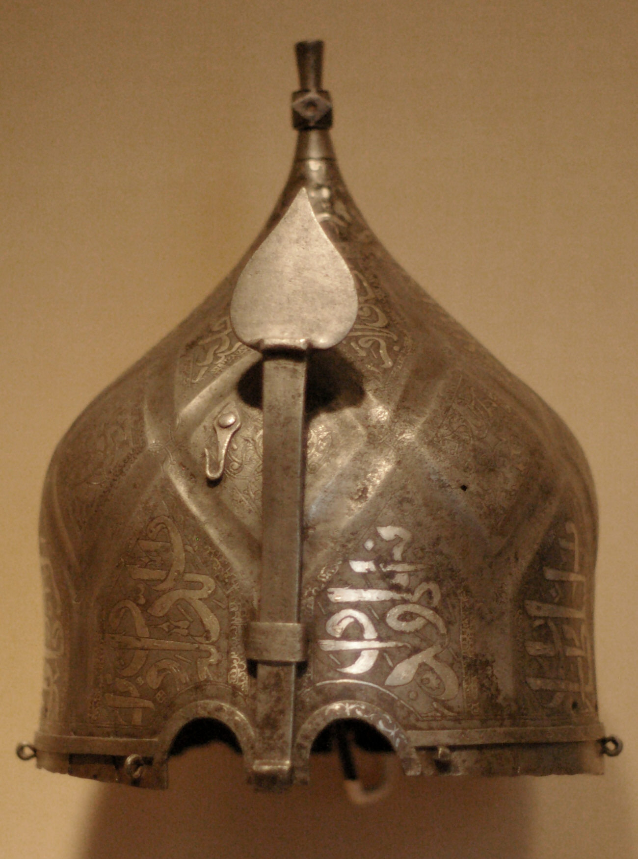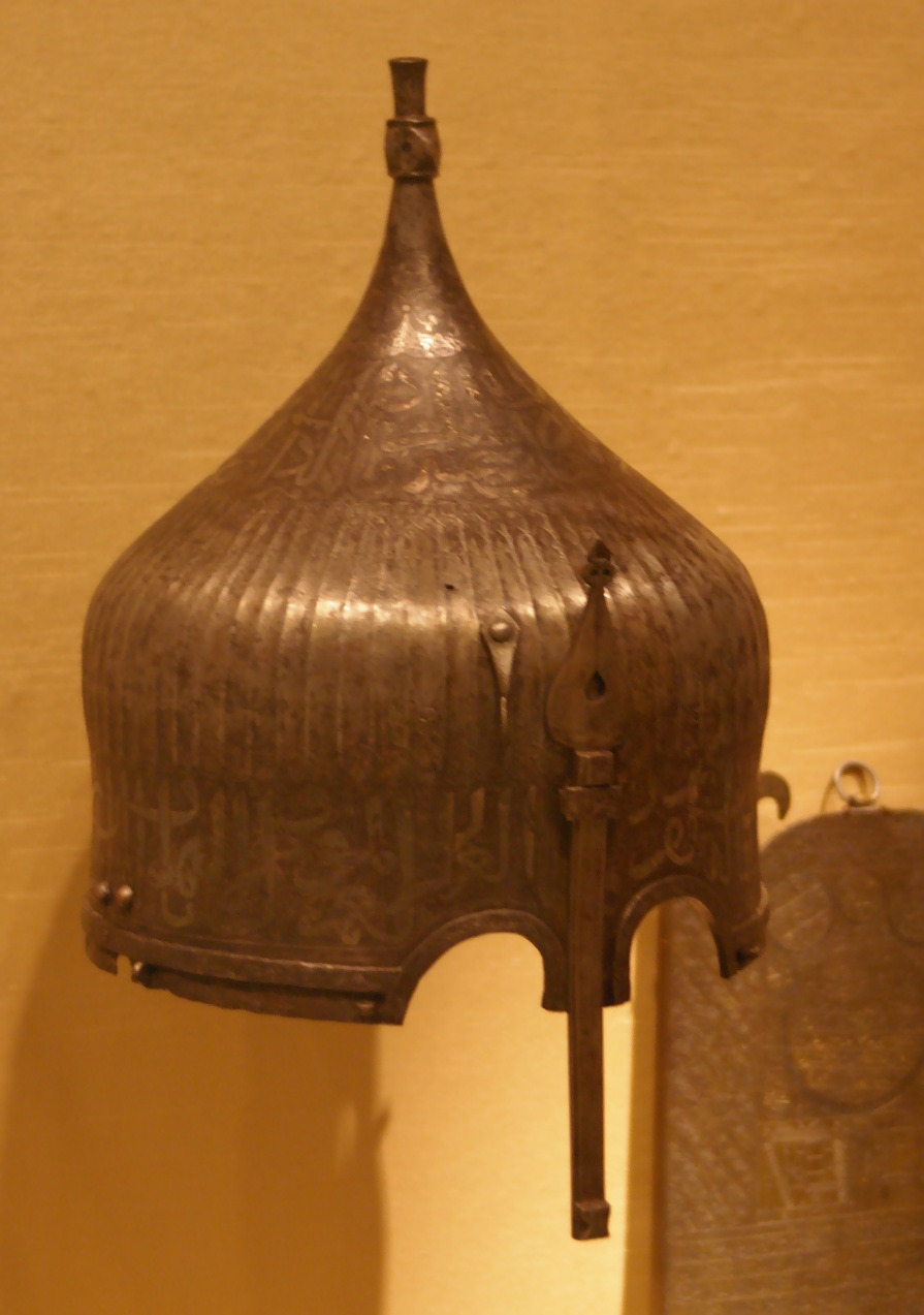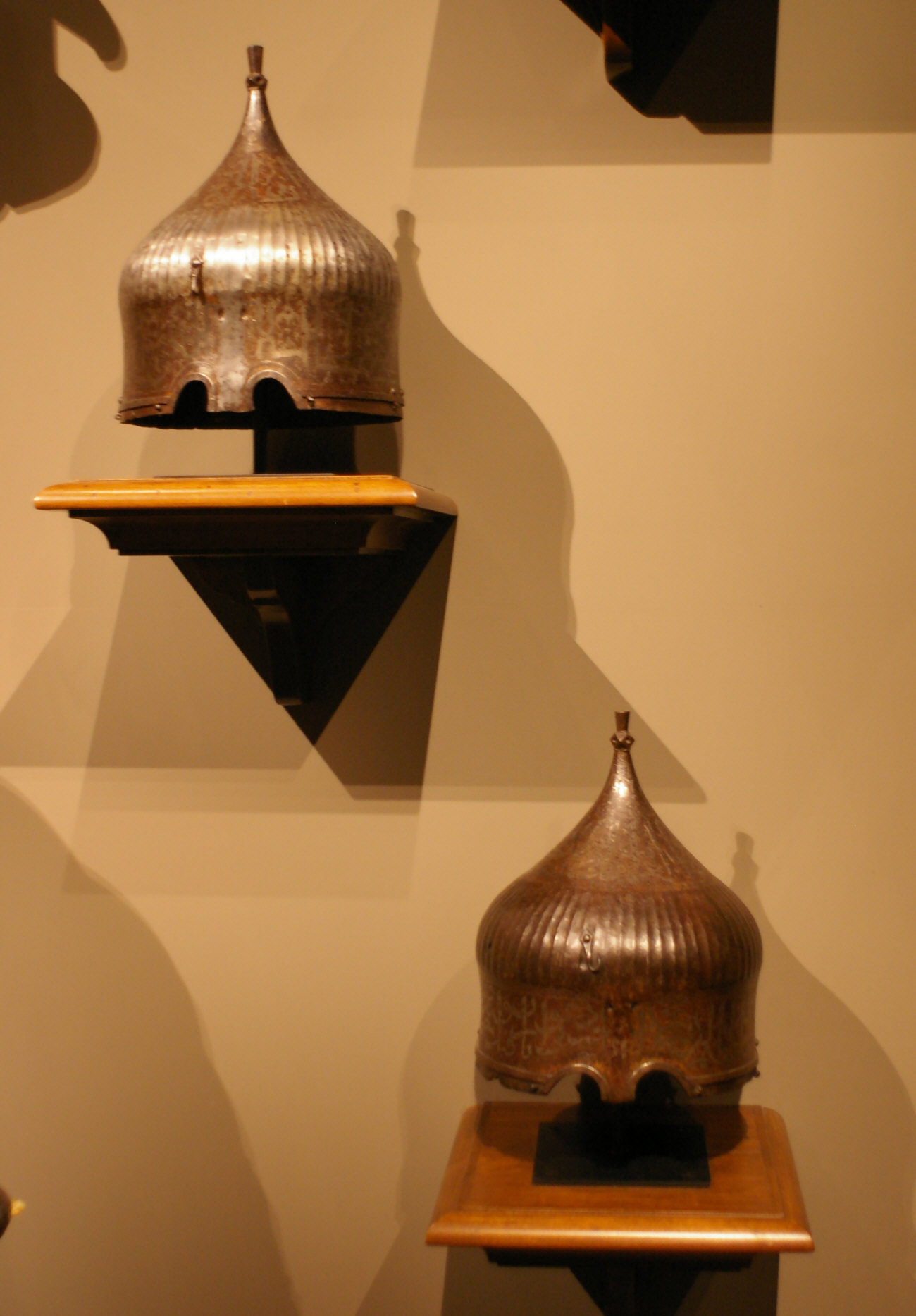 2. Тюрбанный шлем (анг. turban helmet, турецк. Turban miğfer ), нижняя половина его довольно глубокой тульи была цилинрической формы и имела вырезы для глаз, верхняя часть тульи была конической формы, с коротким шпилем. Коплектовался пластиной-наносником похожей на ложку и кольчужной бармицей. Причем бармица была длинной и круговой: защищала шлею плечи нижнюю половину лица и рот воина. Кольчуга нисколько не затрудняет дыхание, но ржавеет под действием влаги, поэтому кольца кольчуги воронили или танатировали. Тюрбанные шлемы происходят из Северного Ирана: Империи Тимура и Ак-Коюнлу. Ранние тюрбанные шлемы выделяются своей цилиндросферической тульей, которая склепана из нескольких частей и они не имели навершия. Классические тюрбанные шлемы датирутся второй половиной 15 -нач. 16 века.