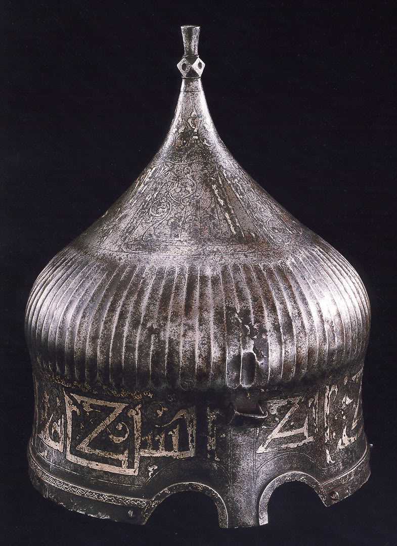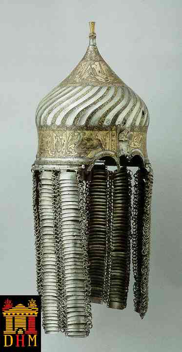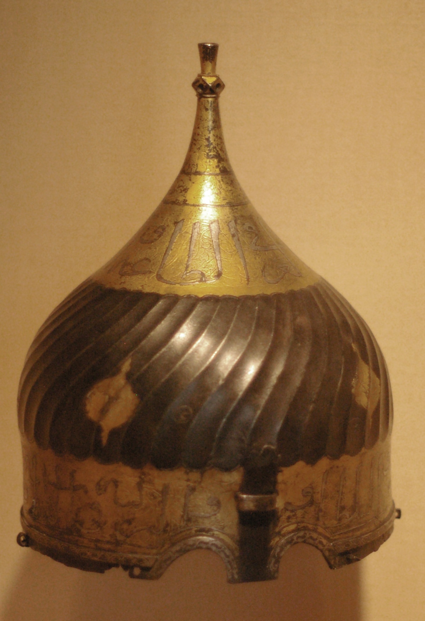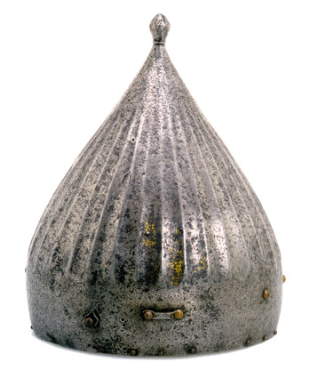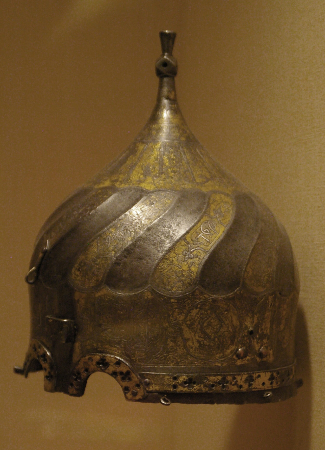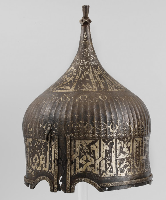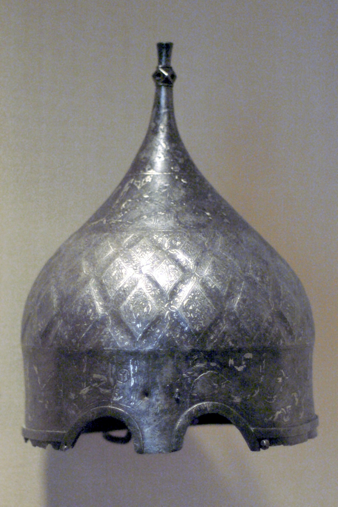 2. Тюрбанный шлем (анг. turban helmet, турецк. Turban miğfer ), нижняя половина его довольно глубокой тульи была цилинрической формы и имела вырезы для глаз, верхняя часть тульи была конической формы, с коротким шпилем. Коплектовался пластиной-наносником похожей на ложку и кольчужной бармицей. Причем бармица была длинной и круговой: защищала шлею плечи нижнюю половину лица и рот воина. Кольчуга нисколько не затрудняет дыхание, но ржавеет под действием влаги, поэтому кольца кольчуги воронили или танатировали. Тюрбанные шлемы происходят из Северного Ирана: Империи Тимура и Ак-Коюнлу. Ранние тюрбанные шлемы выделяются своей цилиндросферической тульей, которая склепана из нескольких частей и они не имели навершия. Классические тюрбанные шлемы датирутся второй половиной 15 -нач. 16 века.
