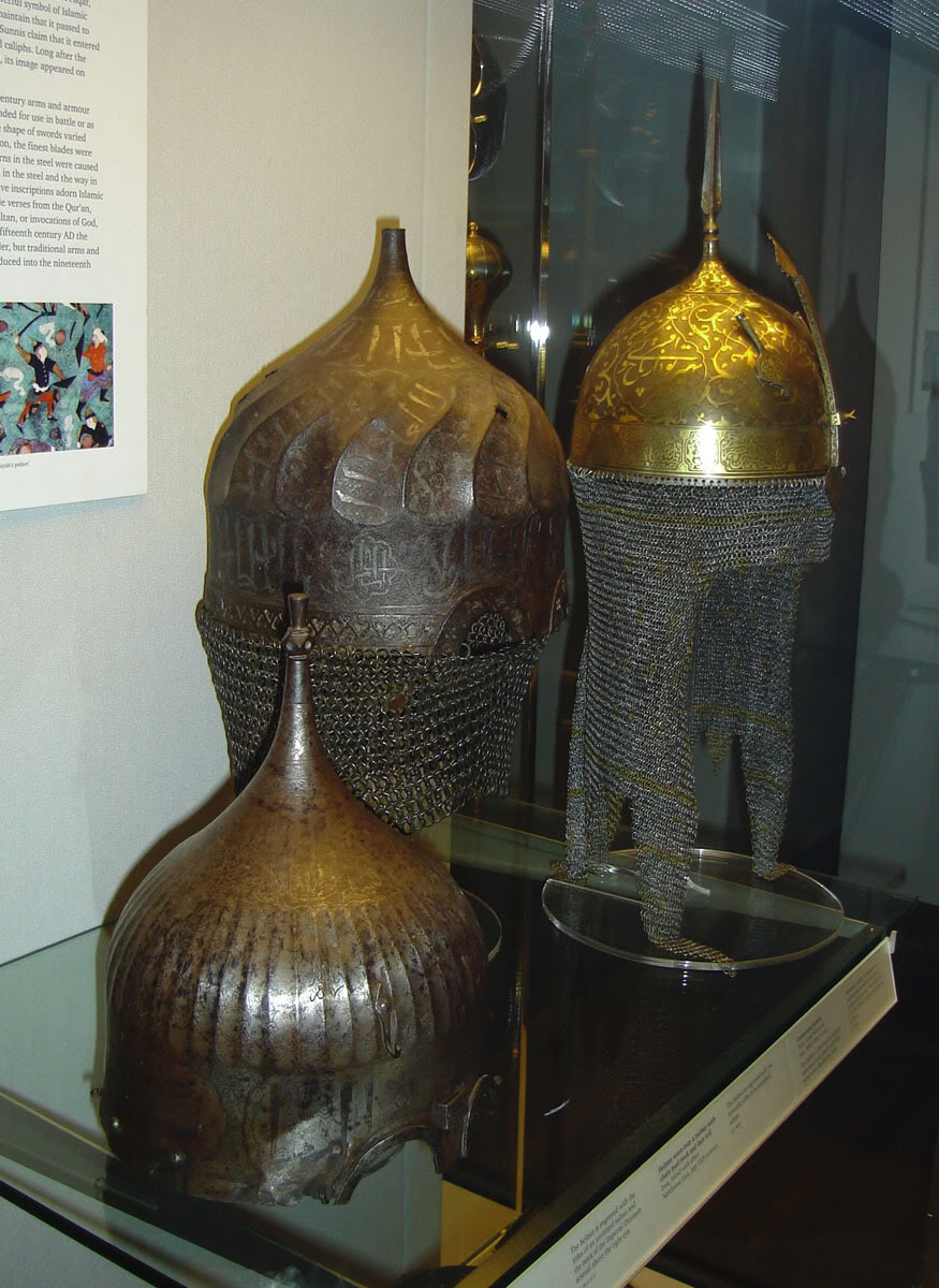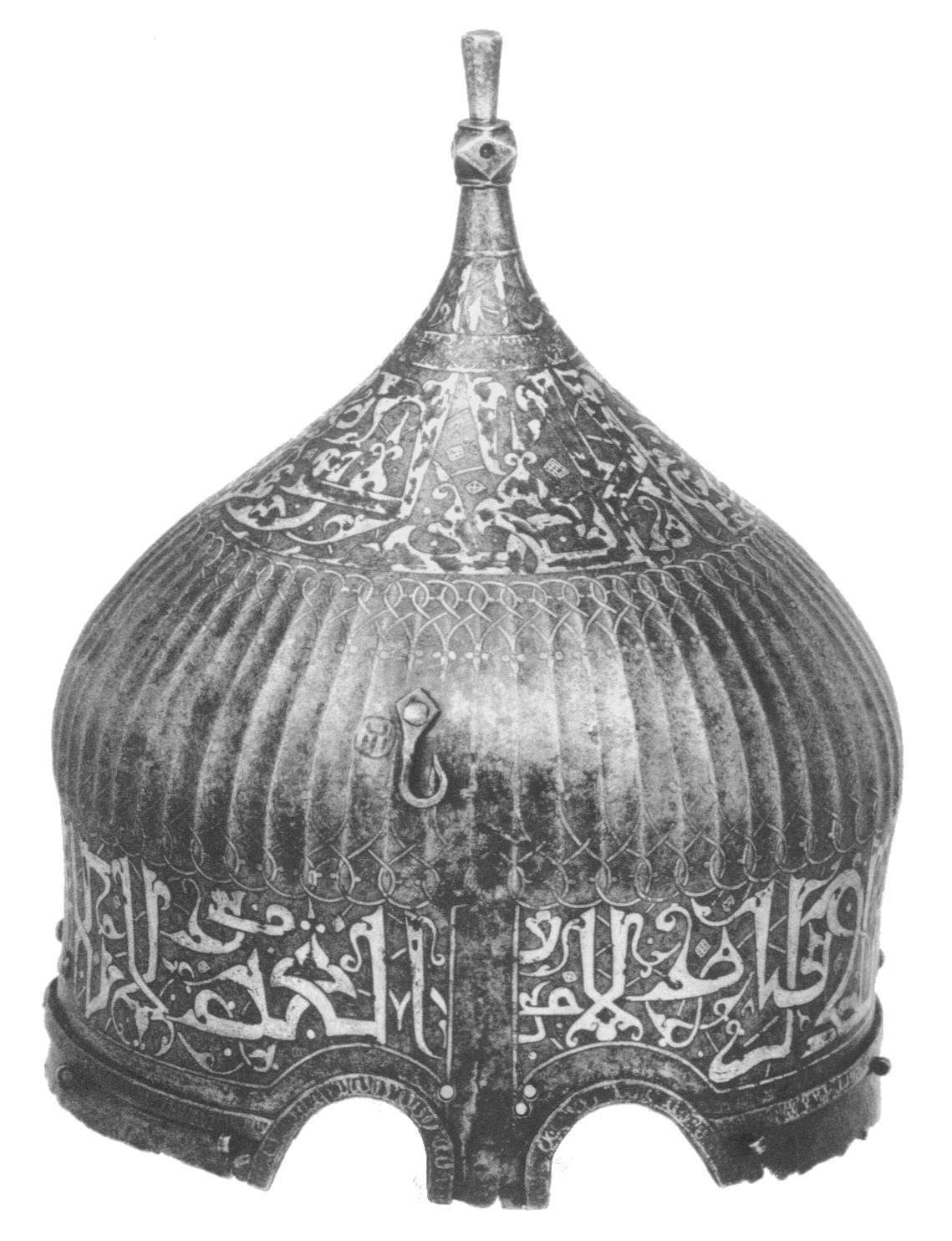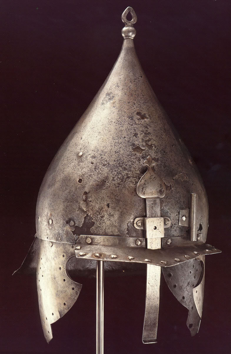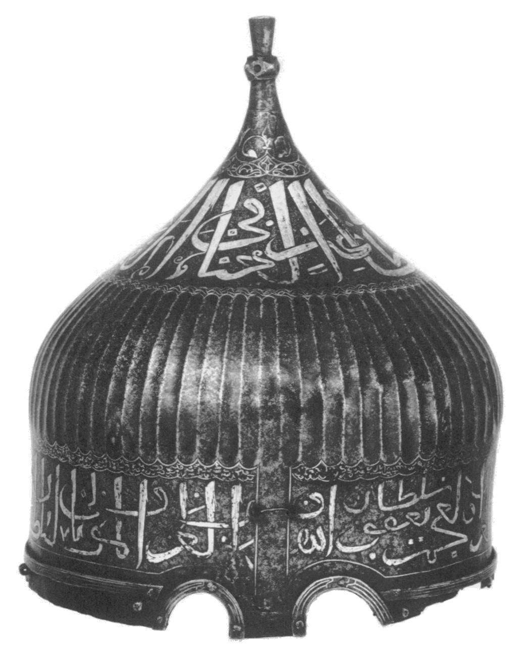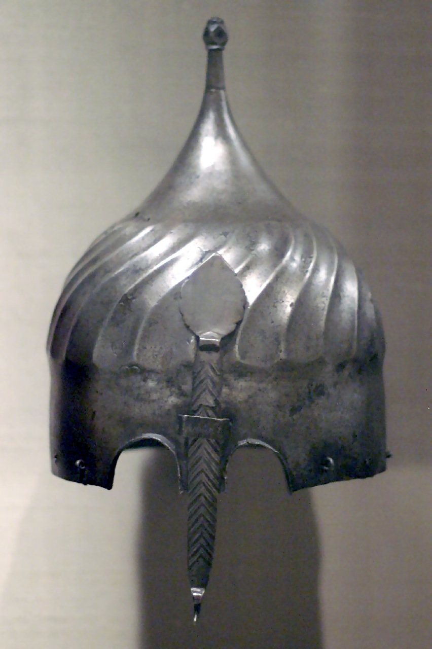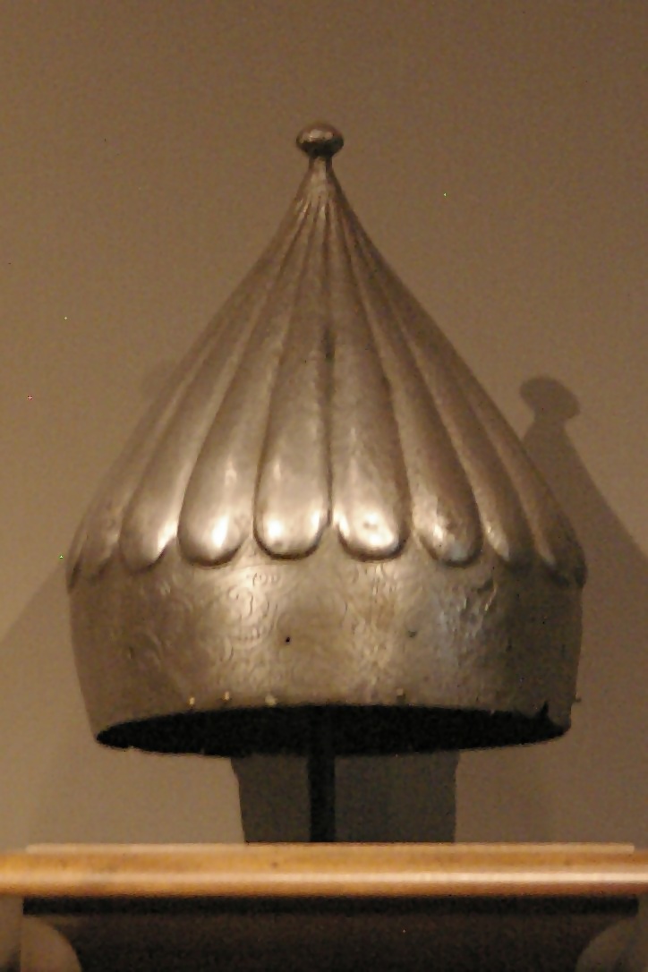 2. Тюрбанный шлем (анг. turban helmet, турецк. Turban miğfer ), нижняя половина его довольно глубокой тульи была цилинрической формы и имела вырезы для глаз, верхняя часть тульи была конической формы, с коротким шпилем. Коплектовался пластиной-наносником похожей на ложку и кольчужной бармицей. Причем бармица была длинной и круговой: защищала шлею плечи нижнюю половину лица и рот воина. Кольчуга нисколько не затрудняет дыхание, но ржавеет под действием влаги, поэтому кольца кольчуги воронили или танатировали. Тюрбанные шлемы происходят из Северного Ирана: Империи Тимура и Ак-Коюнлу. Ранние тюрбанные шлемы выделяются своей цилиндросферической тульей, которая склепана из нескольких частей и они не имели навершия. Классические тюрбанные шлемы датирутся второй половиной 15 -нач. 16 века.