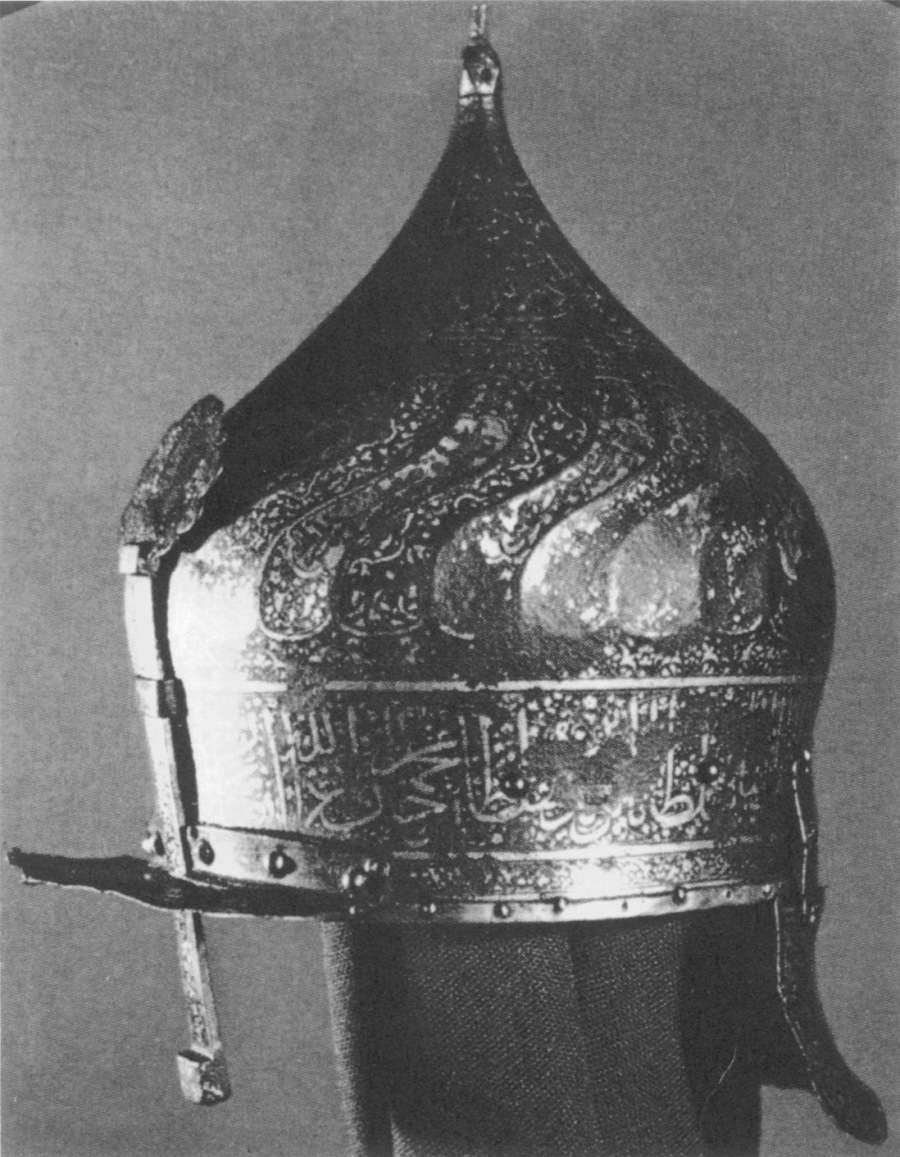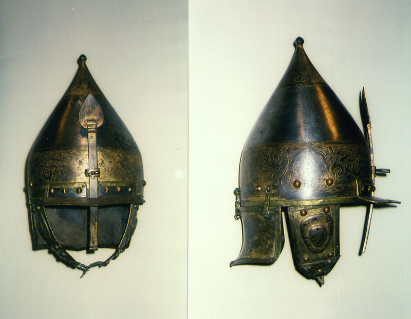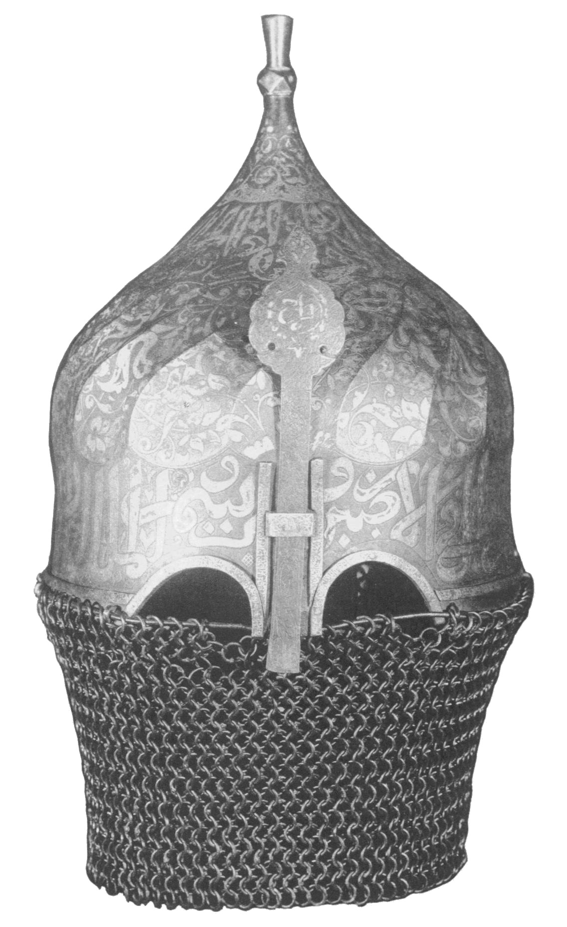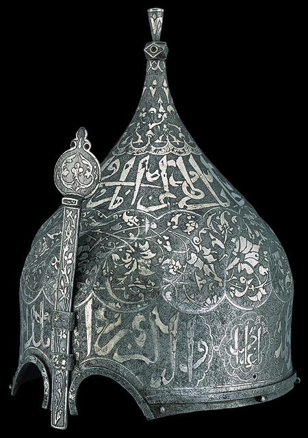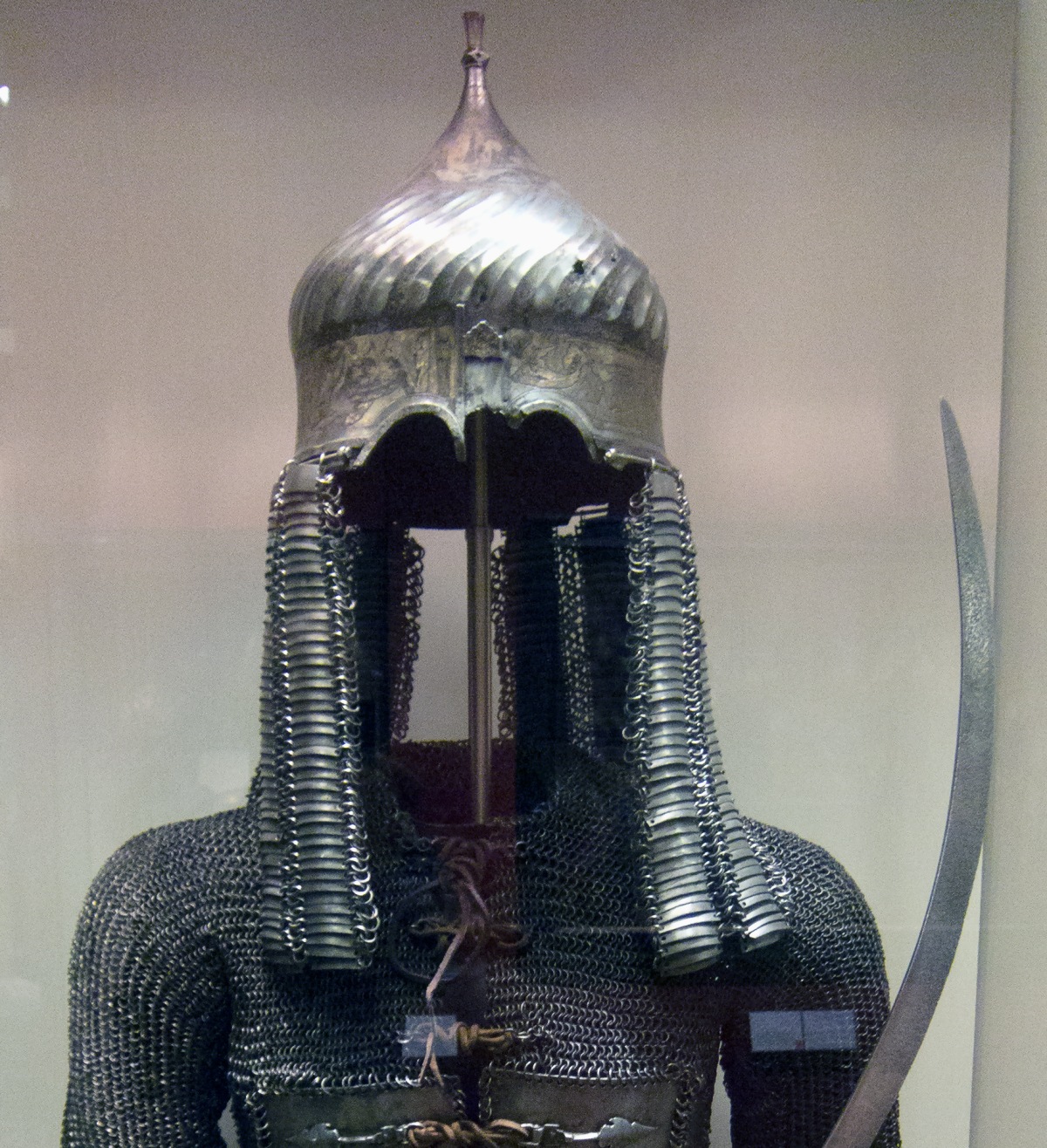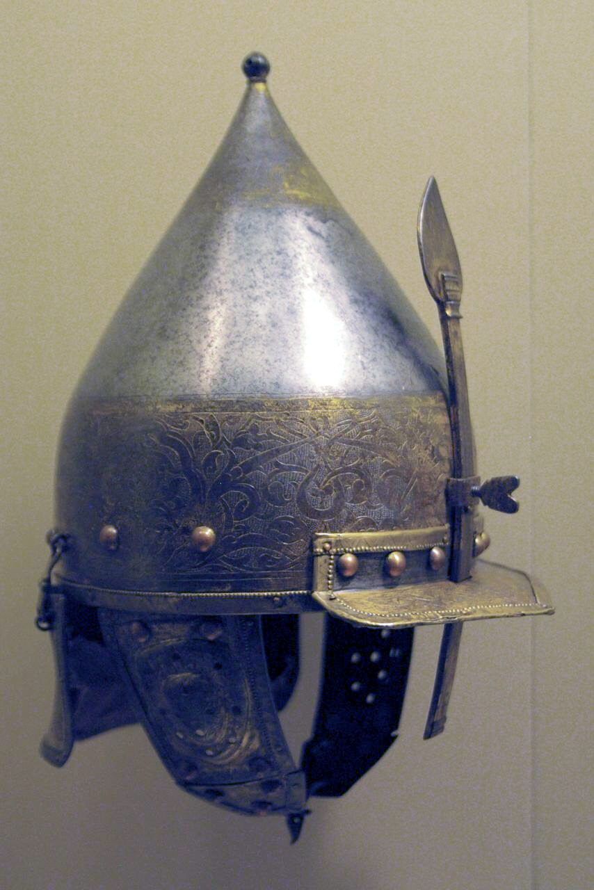 2. Тюрбанный шлем (анг. turban helmet, турецк. Turban miğfer ), нижняя половина его довольно глубокой тульи была цилинрической формы и имела вырезы для глаз, верхняя часть тульи была конической формы, с коротким шпилем. Коплектовался пластиной-наносником похожей на ложку и кольчужной бармицей. Причем бармица была длинной и круговой: защищала шлею плечи нижнюю половину лица и рот воина. Кольчуга нисколько не затрудняет дыхание, но ржавеет под действием влаги, поэтому кольца кольчуги воронили или танатировали. Тюрбанные шлемы происходят из Северного Ирана: Империи Тимура и Ак-Коюнлу. Ранние тюрбанные шлемы выделяются своей цилиндросферической тульей, которая склепана из нескольких частей и они не имели навершия. Классические тюрбанные шлемы датирутся второй половиной 15 -нач. 16 века.