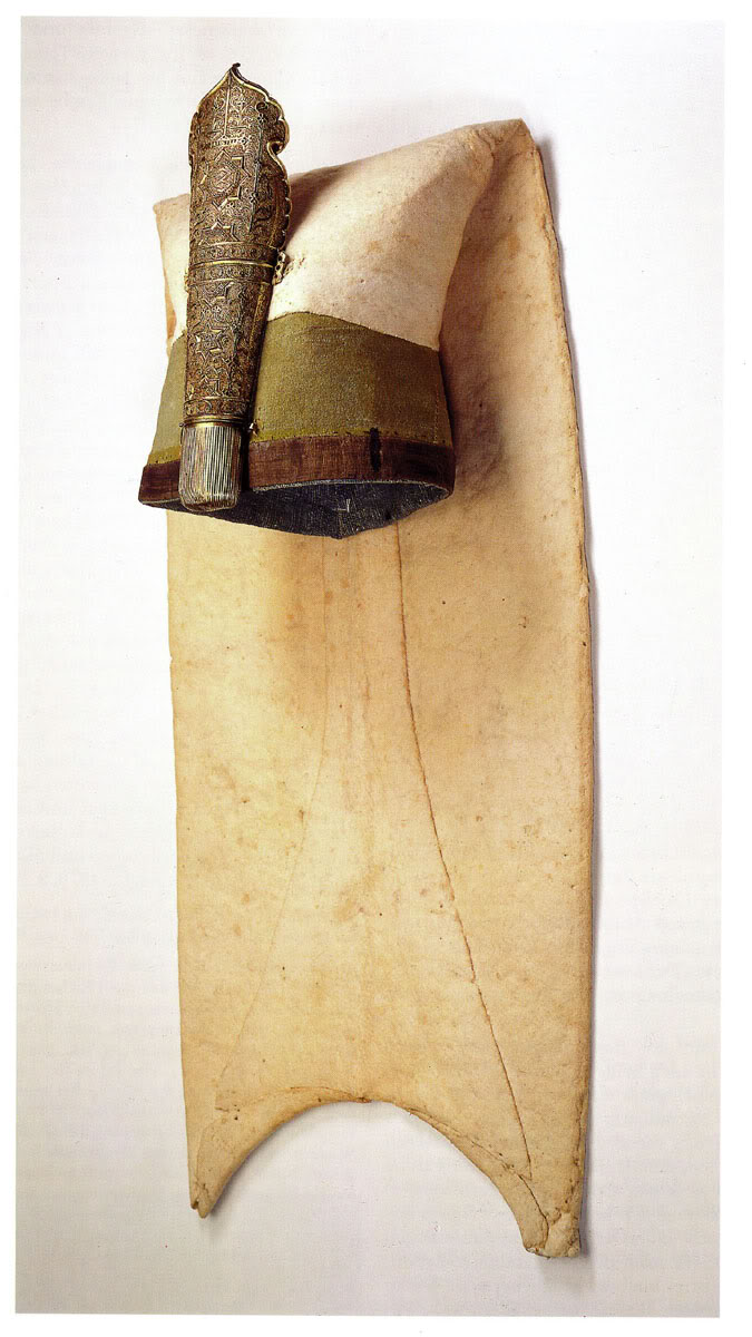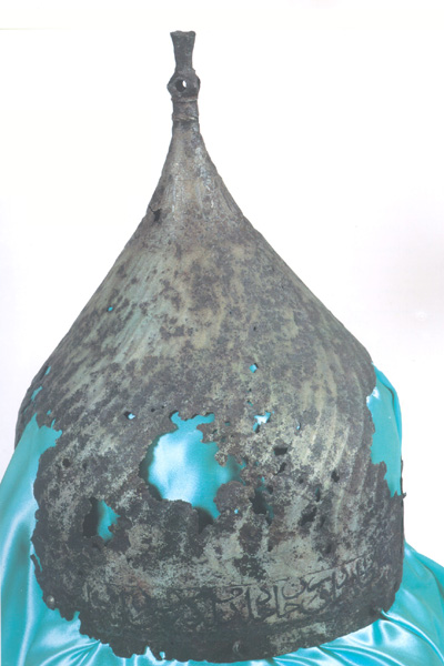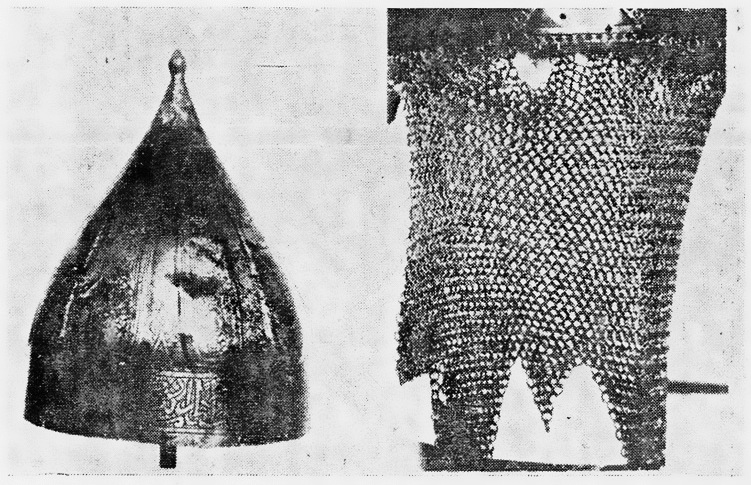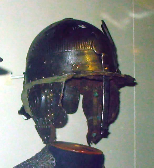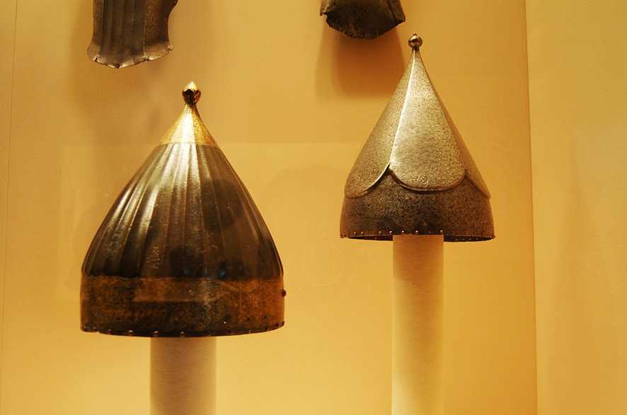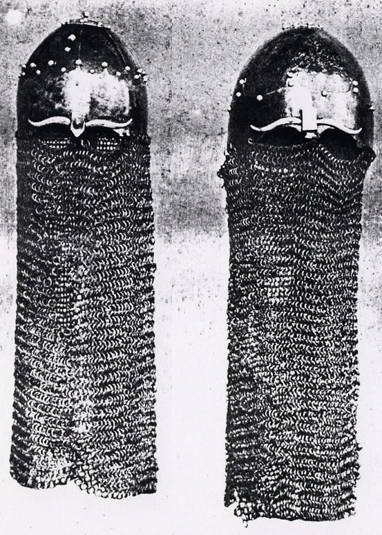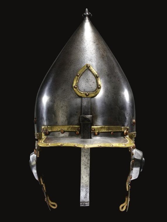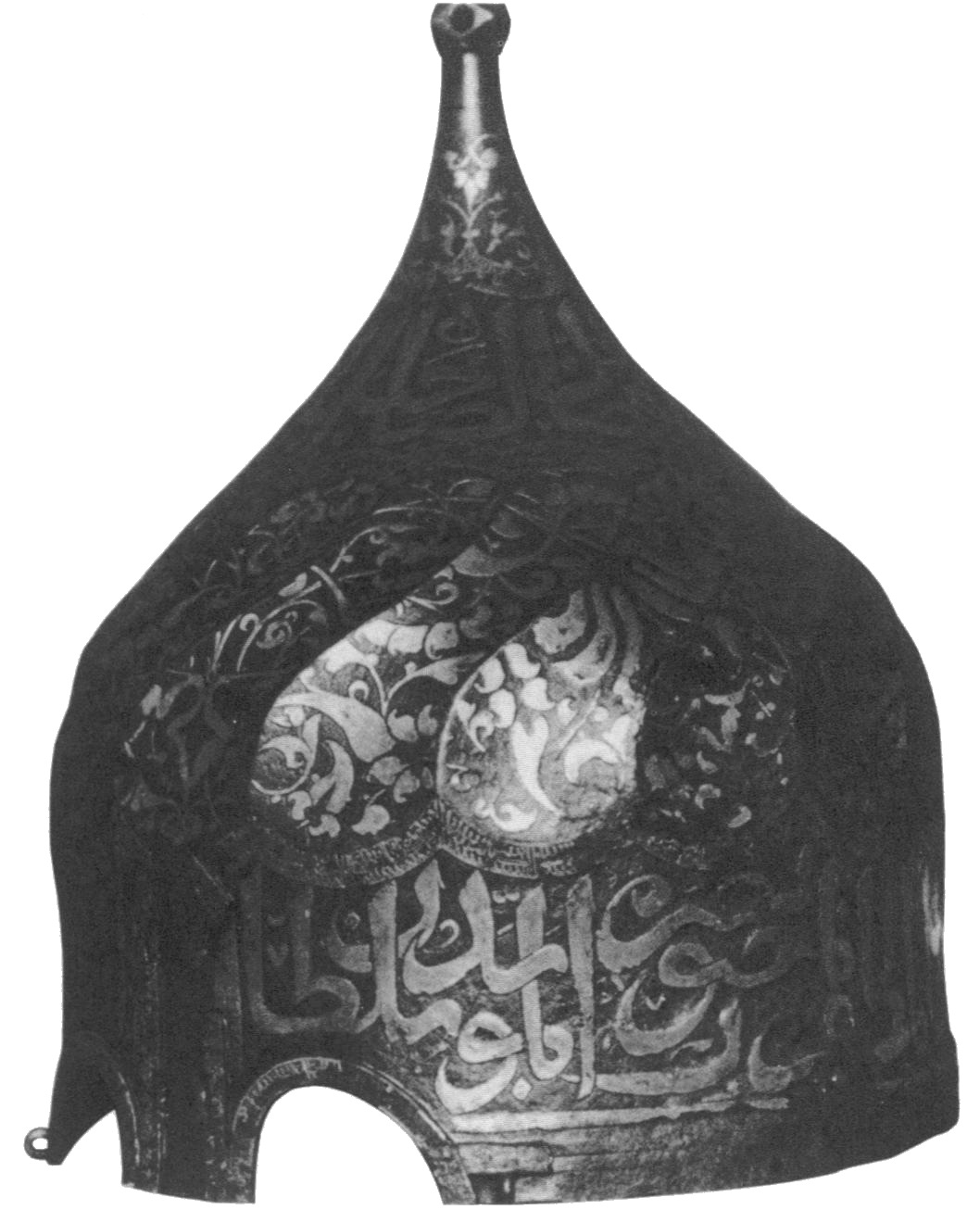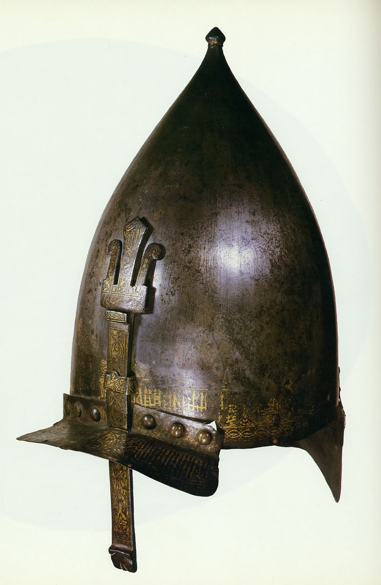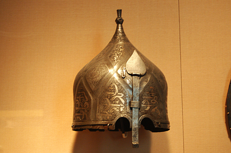 2. Тюрбанный шлем (анг. turban helmet, турецк. Turban miğfer ), нижняя половина его довольно глубокой тульи была цилинрической формы и имела вырезы для глаз, верхняя часть тульи была конической формы, с коротким шпилем. Коплектовался пластиной-наносником похожей на ложку и кольчужной бармицей. Причем бармица была длинной и круговой: защищала шлею плечи нижнюю половину лица и рот воина. Кольчуга нисколько не затрудняет дыхание, но ржавеет под действием влаги, поэтому кольца кольчуги воронили или танатировали. Тюрбанные шлемы происходят из Северного Ирана: Империи Тимура и Ак-Коюнлу. Ранние тюрбанные шлемы выделяются своей цилиндросферической тульей, которая склепана из нескольких частей и они не имели навершия. Классические тюрбанные шлемы датирутся второй половиной 15 -нач. 16 века.