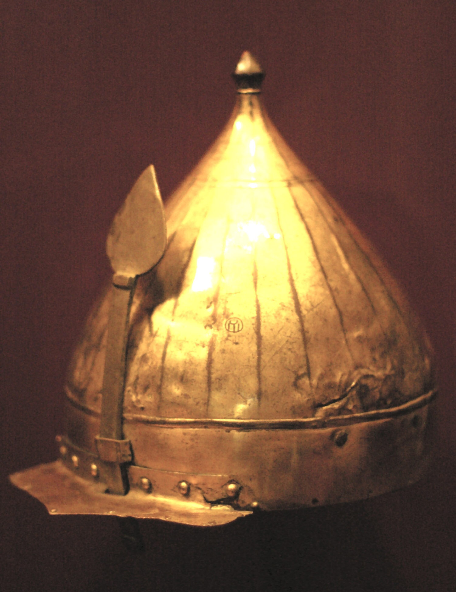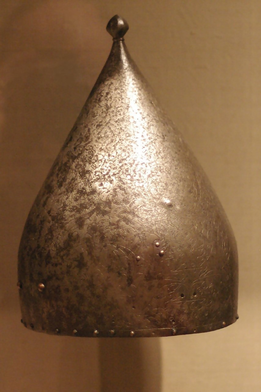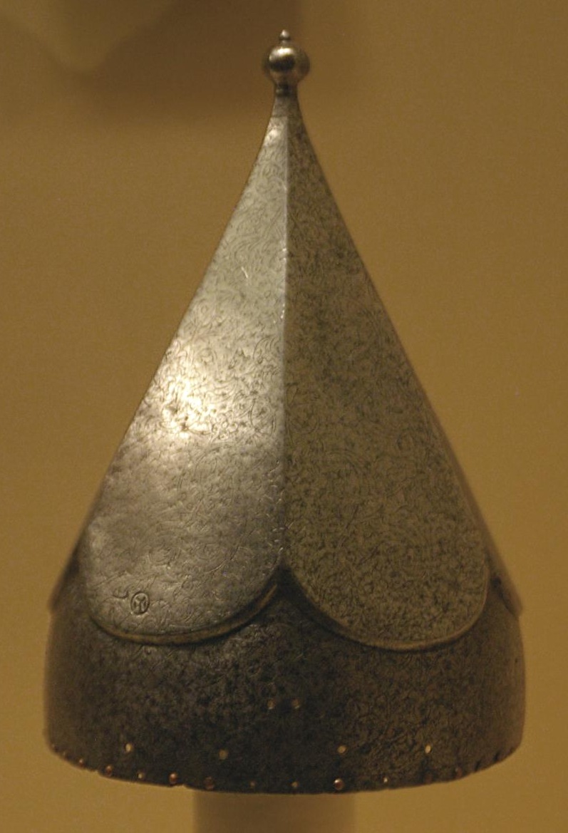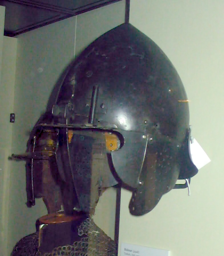 4. Высокий шлем (анг. large helmet) – выделяется своей своей почти конической формой, но короткое основание его гладкой тульи цилиндрическое, и резко переходит в высокий конус и венчается высоким шпилем. Перод применения: от начала 14-го и до начала 17 века Может комплектоваться кольчужной бармицей, но с конца 15-го века часто комплектуется подобно ерихонке козырьком, наушами и затыльником. Русское название шлемов этого типа "шелом" говорит о том что именно такие боевые наголовья и считали полноценными.