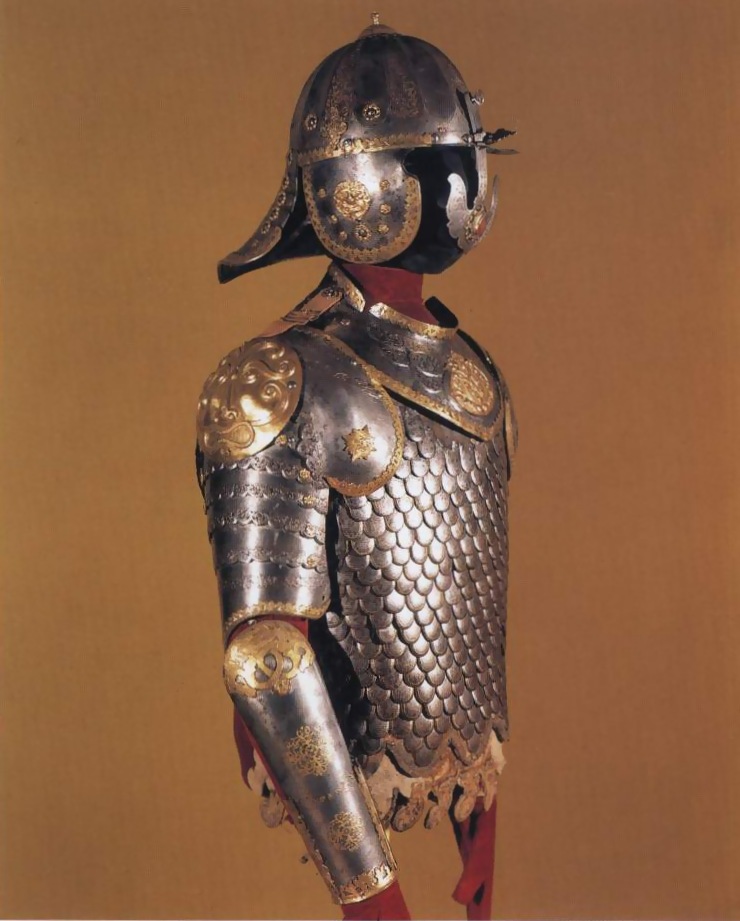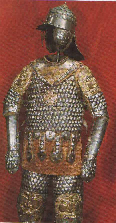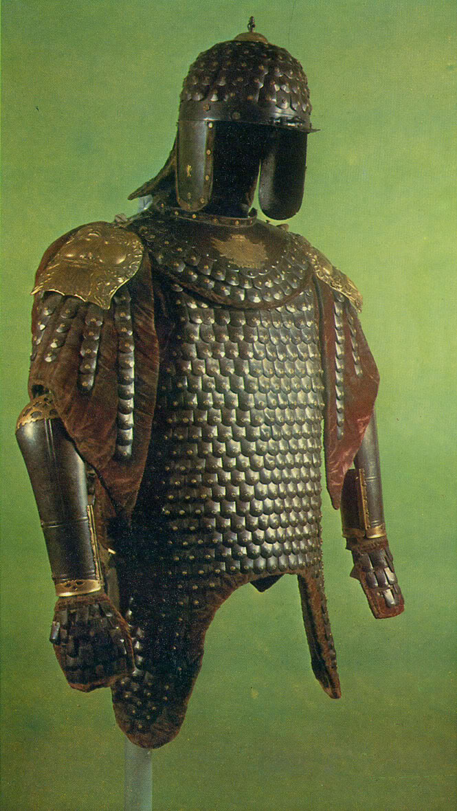И еще одна уникальная деталь встреющаяся на караценовых доспехах трубчатые (и чешуйчатые) наручи имеют несшитую чешуйчатую рукавицу, которая просто нависает над кистью руки.