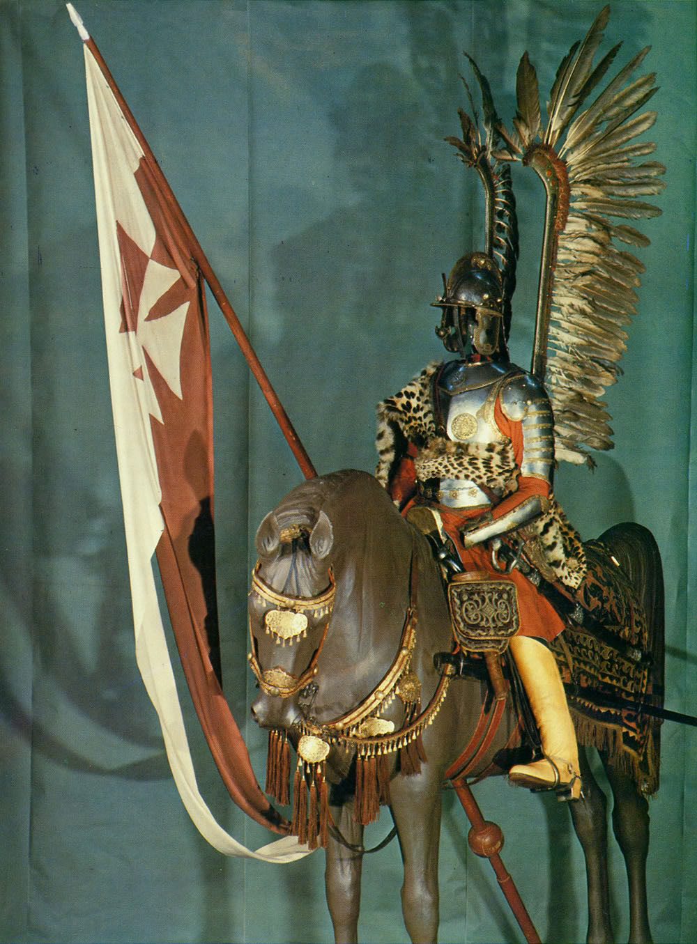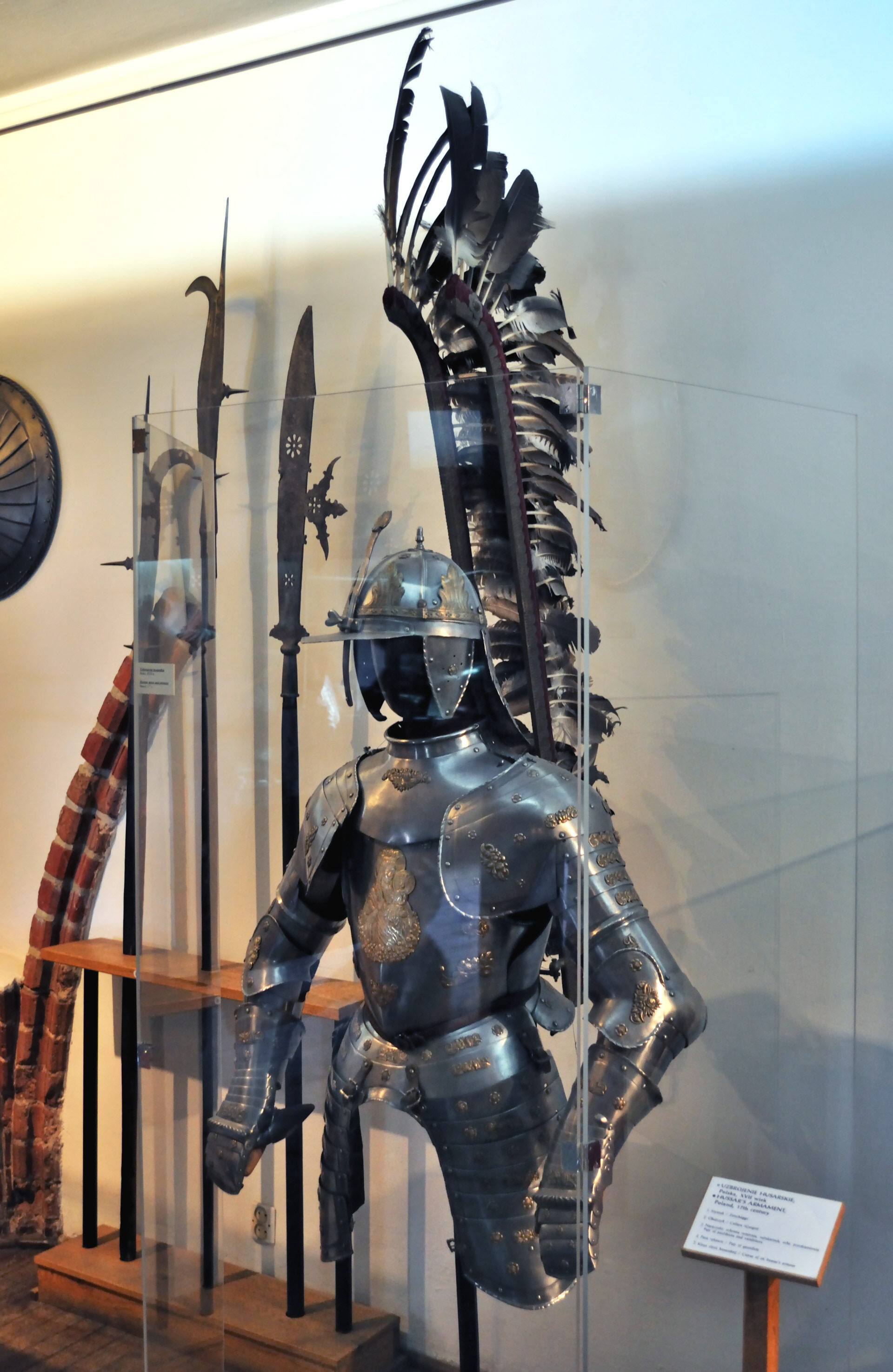 Комплект товарища панцерного. Музей Войска Польского. Варшава.  Передняя часть гусарской кирассы.  Королевский замок Вавель (Wawel) неподалеку от Кракова. Польский крылатый гусар. на 1640 год. Копьё с флагом, шкура леопарда, кафтан и сапоги реконструированы. Остальное оригинал.