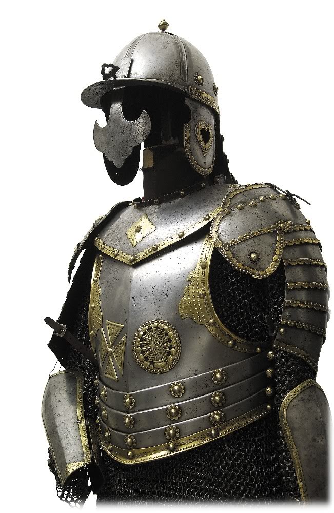 Как уже говорилось, доспехи гусар были весьма красивы. Но кроме красоты, они, конечно, должны были защищать владельца. Нагрудная кирасса, сделанная по образцу немецких и итальянских доспехов, толщиной до 3х миллиметров выдерживала попадание из мушкета с расстояния в 20 метров, а из пистолета не прибивалась и в упор. Кирассы как и все детали гусарского доспеха причудливо украшались латунными накладками, иногда даже позолотой. Наиболее популярным мотивом изображений на кирасссах была пара: Богоматерь – слева и крест – справа.