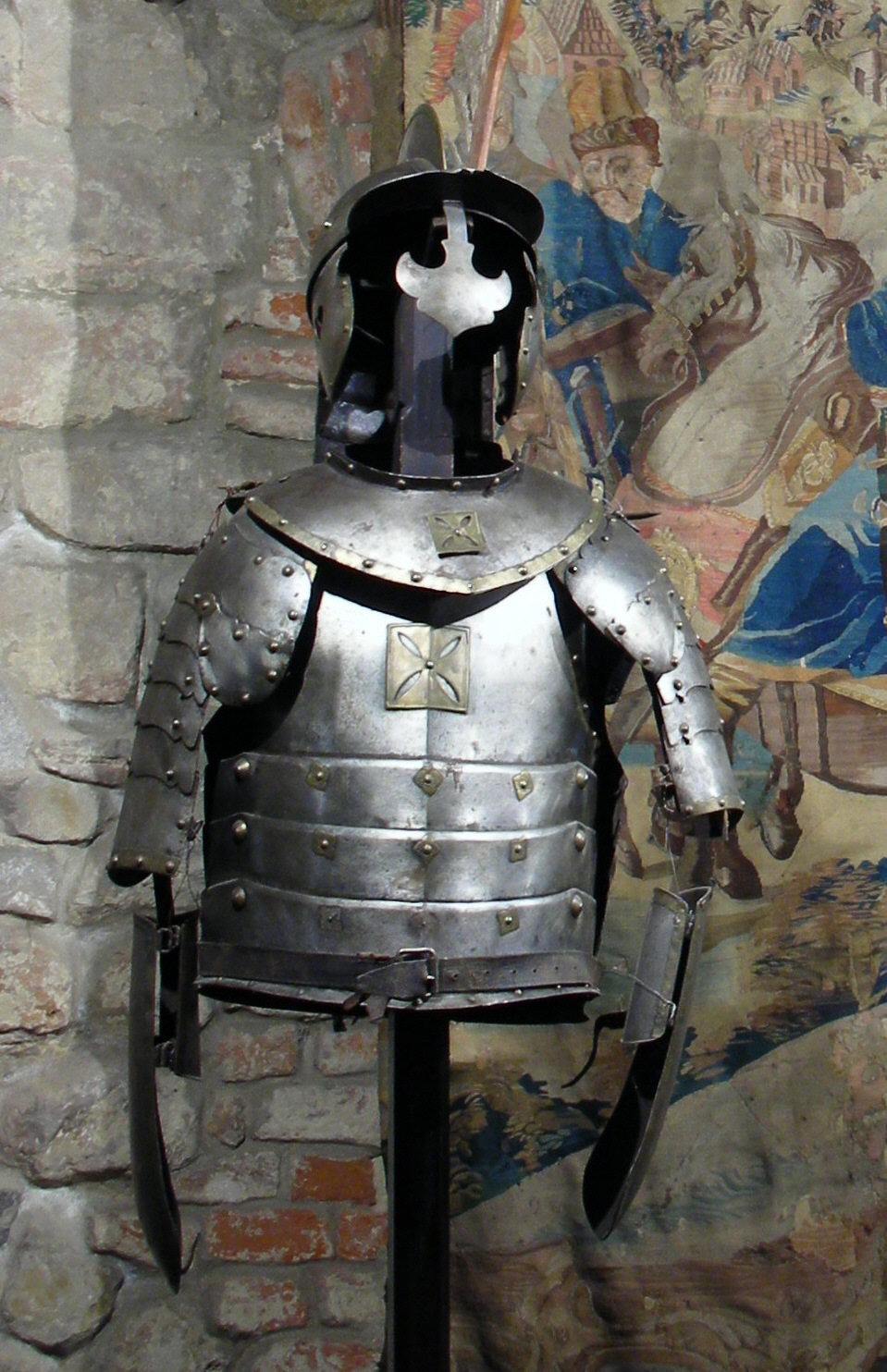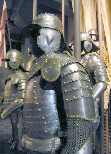 Гусарский доспех, конец 17 века. Национальный музей в Кракове. Пример кирасы одетой поверх кольчуги. Наносник реконструирован. Королевский замок Вавель (Wawel). Защита ног выставляемая с этим доспехом не от него, но соответсвует ему по периоду. Замок Курник в провинции Познань.