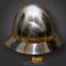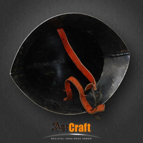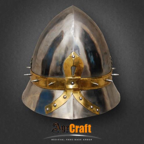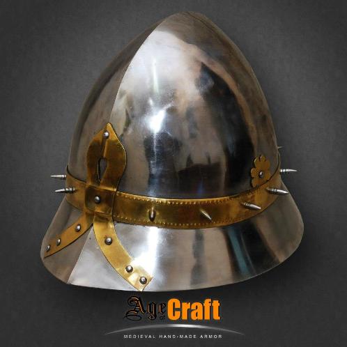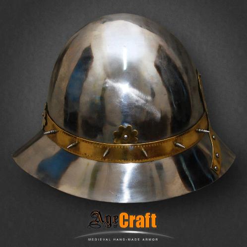Очень изящный красивый и пропорциональный шлем для пехотинца, который кое чего добился в своей военной карьере. Кроме безукоризненой формы идеально приспособленой для отражения ударов (рациональный наклон частей тульи и полей) он украшен латунными накладками с чеканкой и шипами. Английские названия подобных шлемов вполне соответствуют его форме Кеттльхельм (kettle helmet) переводится как шляпа-шлем, а ироничное Kettle hat как шляпа чайник.
