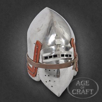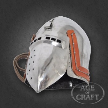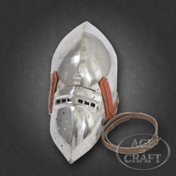 Образцом для данного шлема является бацинет клапвизор хранящийся в Немецком историческом музее (Deuches Historiches Museum). Наши мастера могут изготовить бацинет по образцу бацинета Седлятково, Зиттен или другой желаемой вами констркции. Для заказа укажите нам окружность головы вокруг лба и висков над ушами.