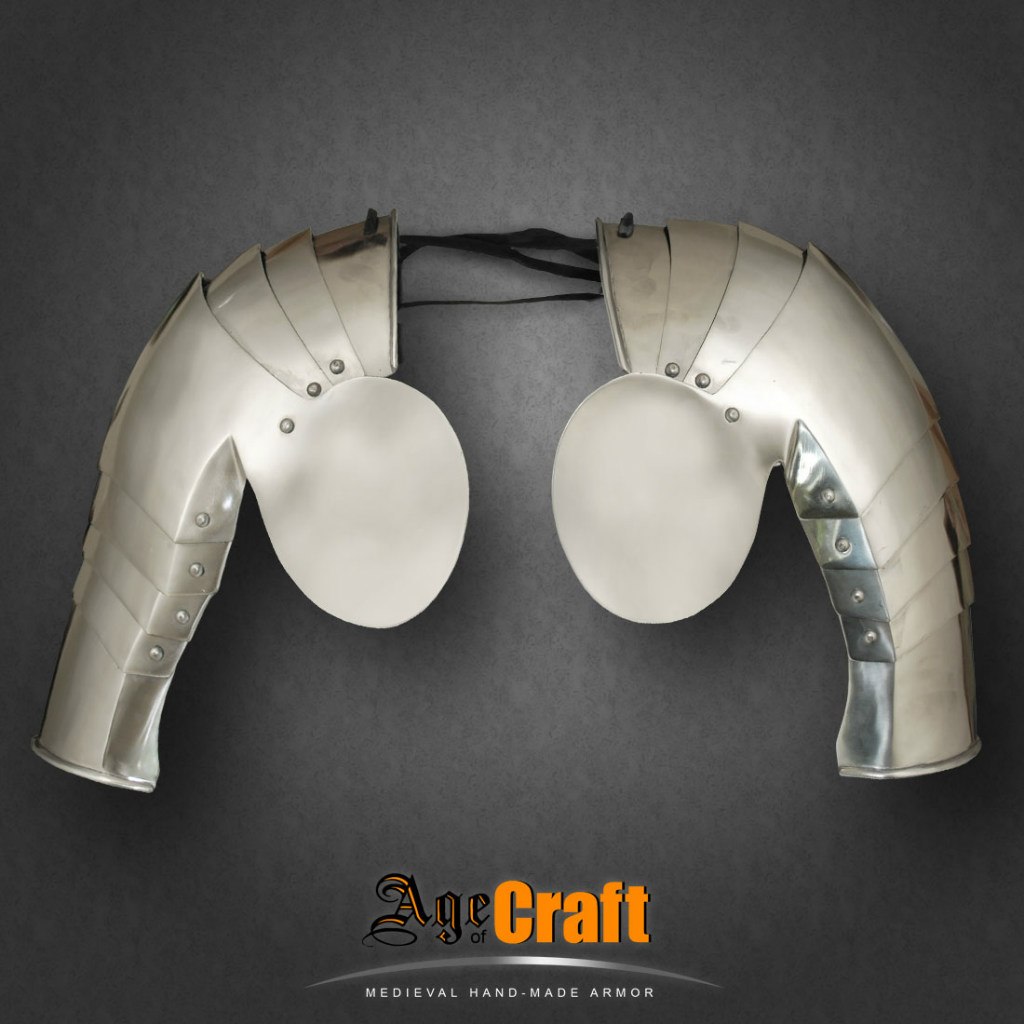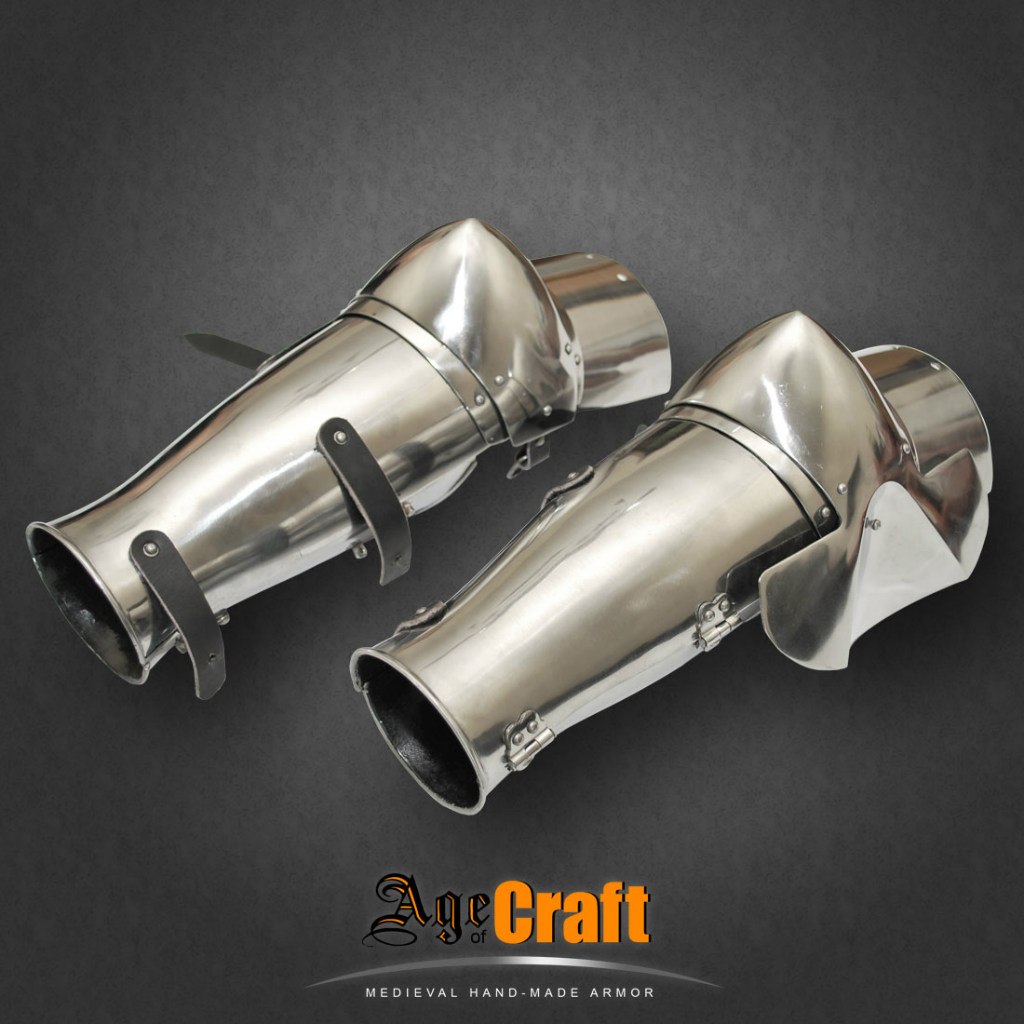 Максимум защиты и внешнего вида чтоб соответствовать званию рыцарь без такого элемента доспеха как латные руки невозможен. В условиях современных боев, когда бьются оружием которое тяжелее своих исторических прототипов, но тупое и бой происходит только рубящими ударами - больше всего страдают голова, плечи и руки. Рыцарские шлема у нас в продаже уже есть, вот и полагающиеся им рыцарские наплечники и наручи с локтями и отбойниками. Датируются эти предметы концом XIV используются весь XV век.