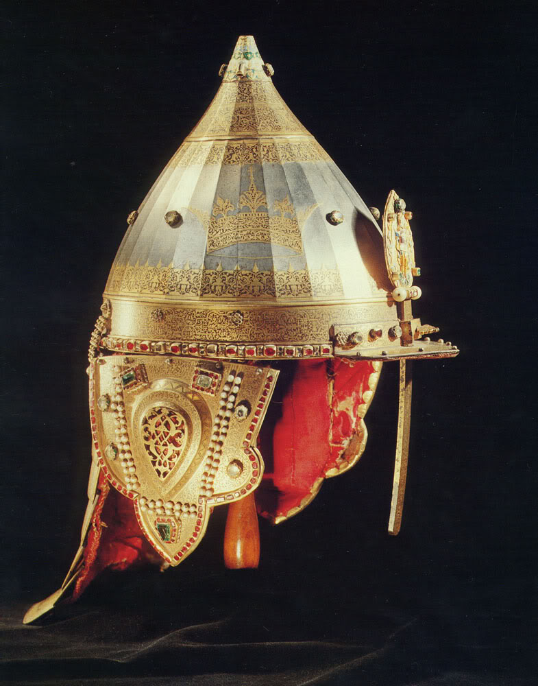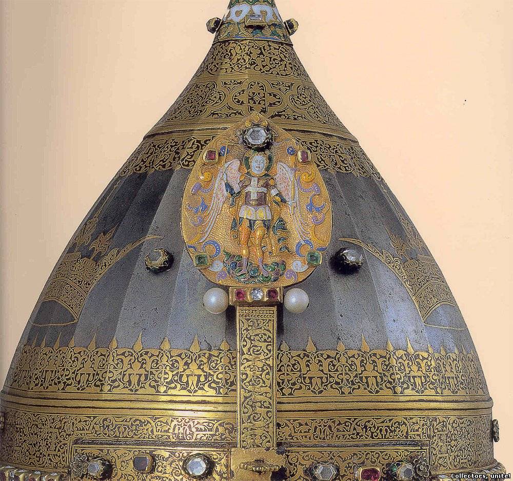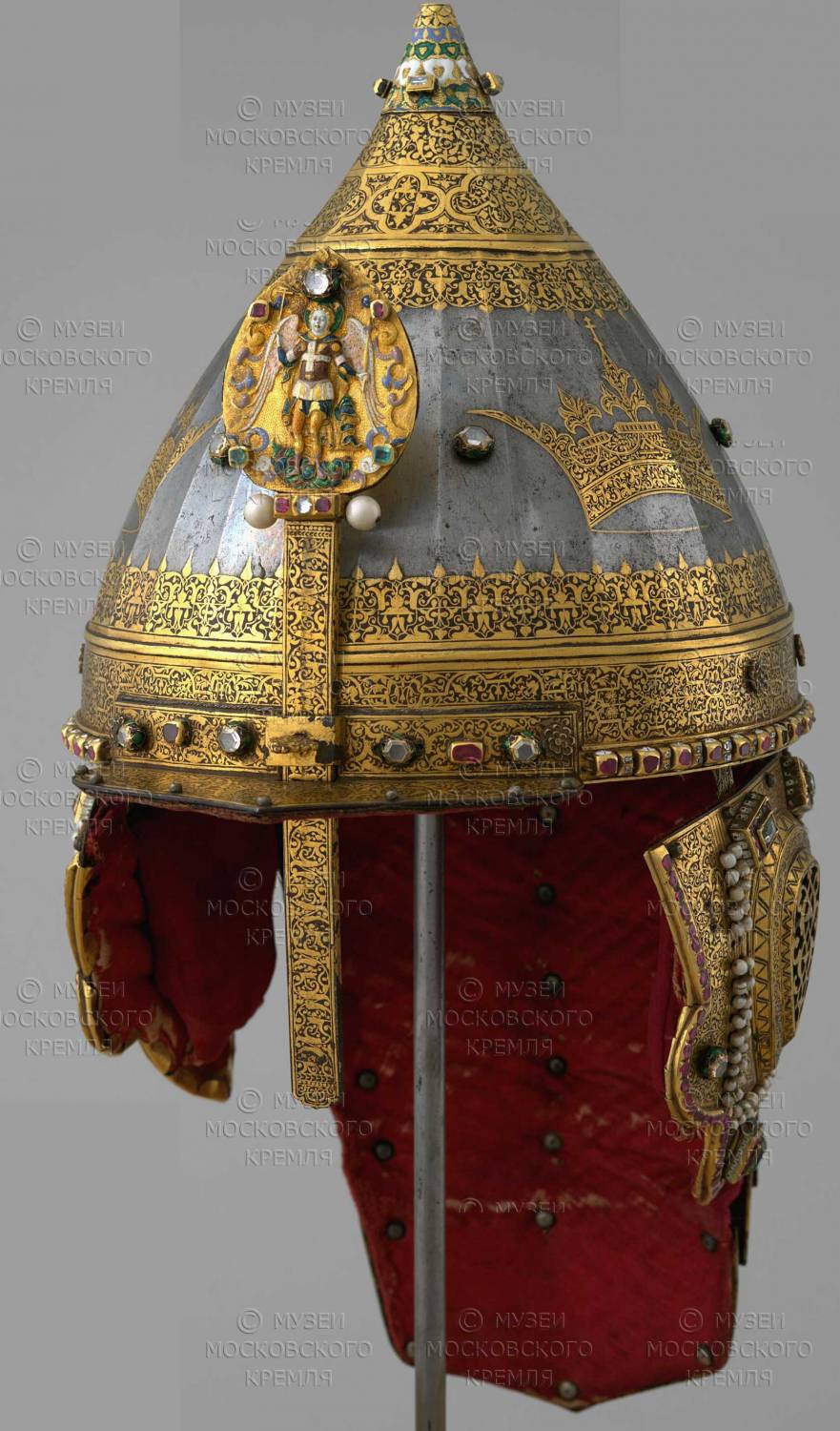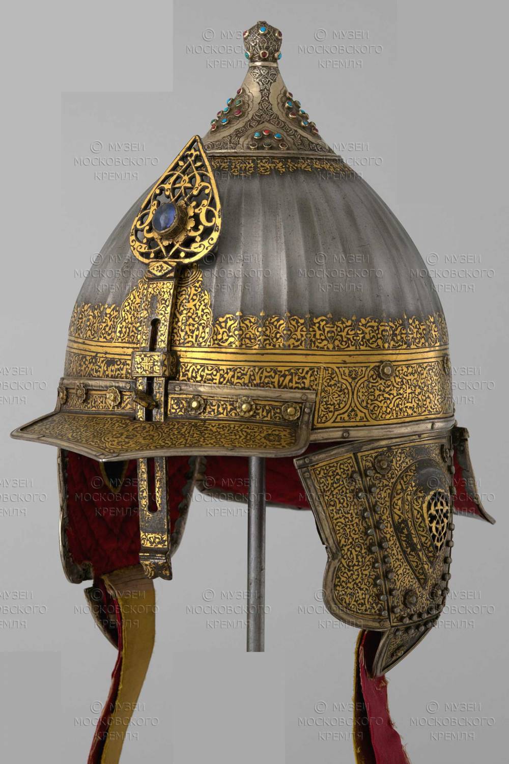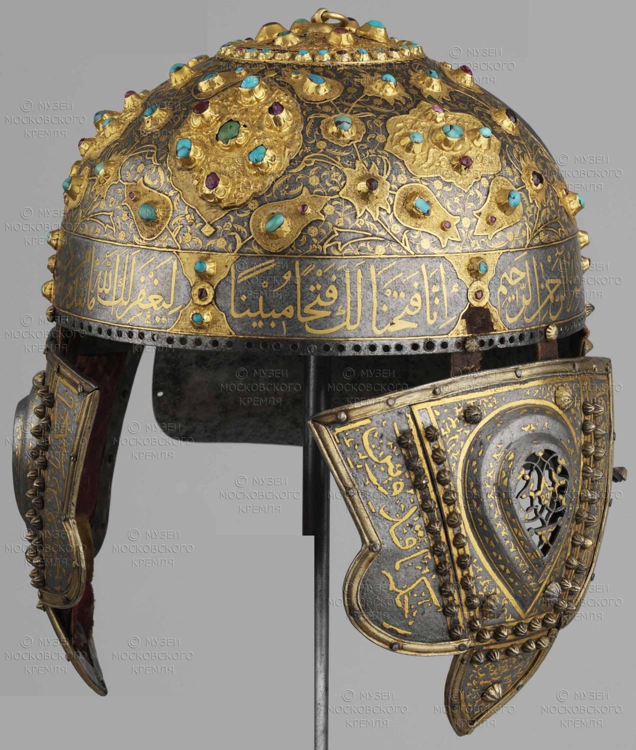 Шелом Ивана Грозного,  предположительно 1547 год. Диаметр шлема 19 см – для головы подростка, Иван Васильевич вступил на царствование в 14 лет. Надпись у нижнего края тульи на арабском языке – "Аллах Мухамед" является сокращенной версией извесной мусульманской молитвы.