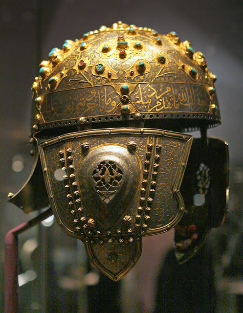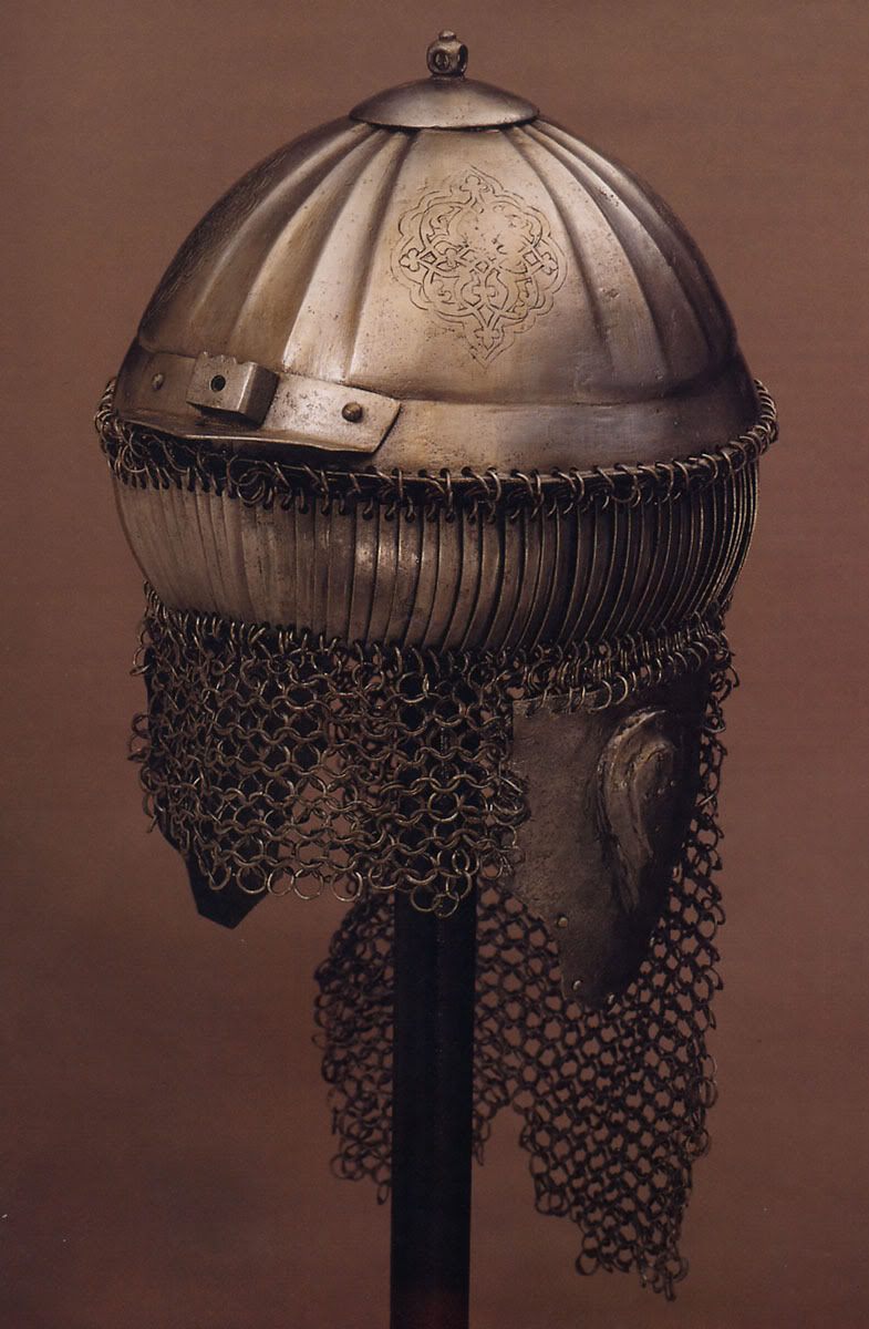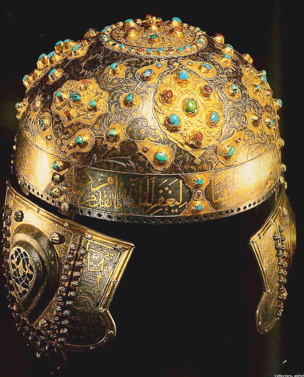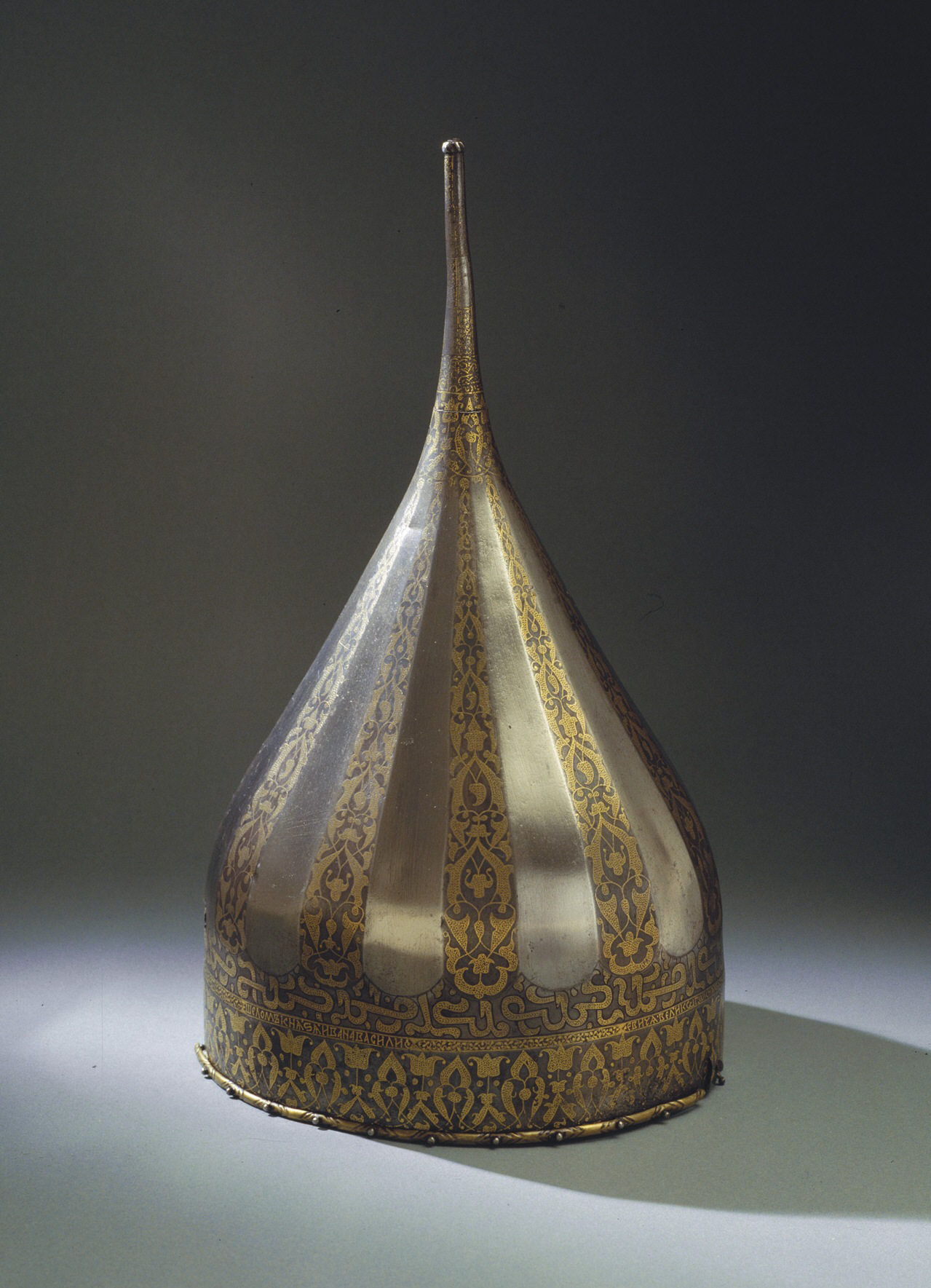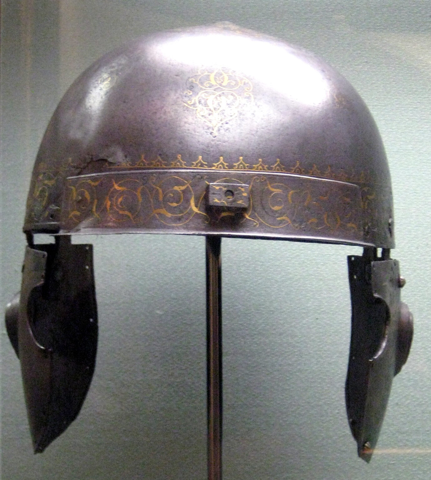 Шелом Ивана Грозного,  предположительно 1547 год. Диаметр шлема 19 см – для головы подростка, Иван Васильевич вступил на царствование в 14 лет. Надпись у нижнего края тульи на арабском языке – "Аллах Мухамед" является сокращенной версией извесной мусульманской молитвы.