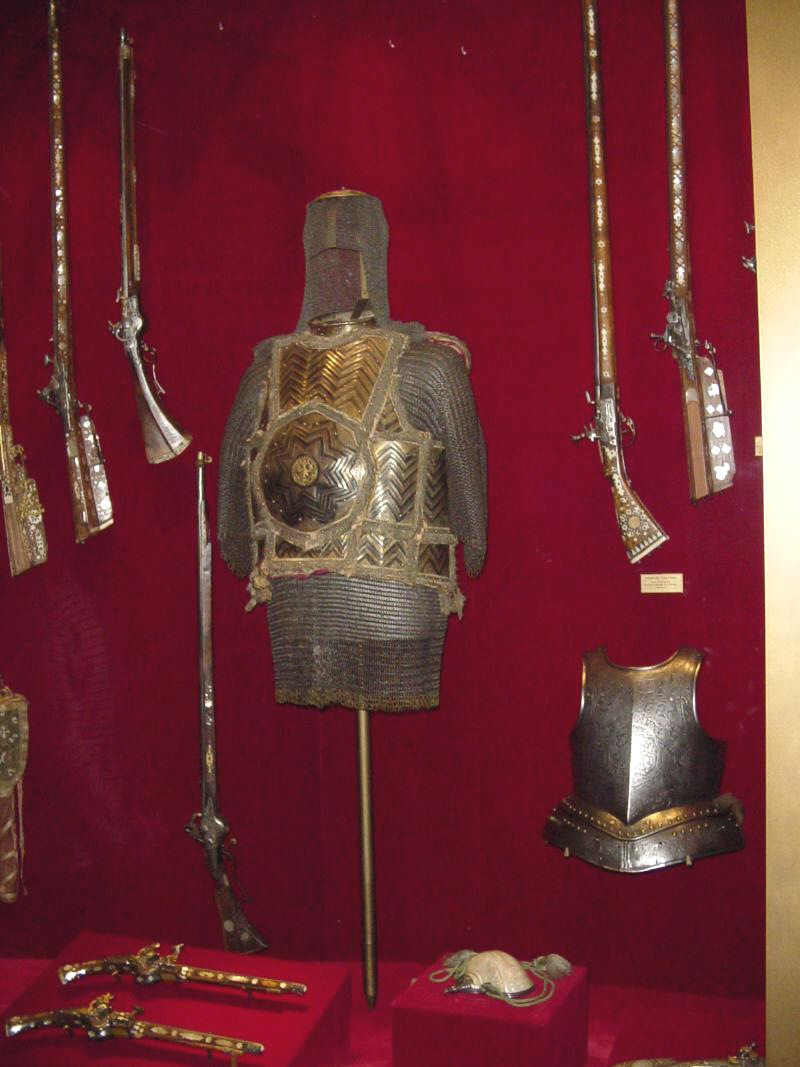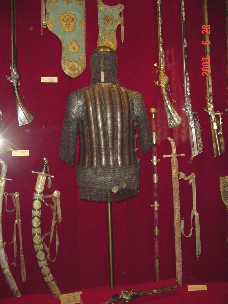 О трудных ратных походах конца средневековья нам напоминает кольчуга, принадлежавшая знатному военачальнику князю Петру Ивановичу Шуйскому, участнику Казанского похода Ивана Грозного. Кольчуга имеет вид длинной прямой рубахи с квадратным вырезом и короткими рукавами. Сделана она из 16 000 крупных клепаных колец. Вес кольчуги – почти 12 кг. На ее левой стороне - круглая медная бляха с именем Шуйского. В 1564 году воевода П. И. Шуйский был убит под Оршей, и кольчуга его перешла в царскую казну. Тогда на ней была укреплена свинцовая бляха с клеймом царской казны. Позднее, когда казачий атаман Ермак Тимофеевич прислал в Москву гонцов с радостной вестью о присоединении к русским землям владений сибирского хана Кучума, царь пожаловал атаману эту кольчугу. Много лет спустя после гибели Ермака кольчугу снова вернули в Кремль. Здесь она и находится с тех пор. Музеи Москвы