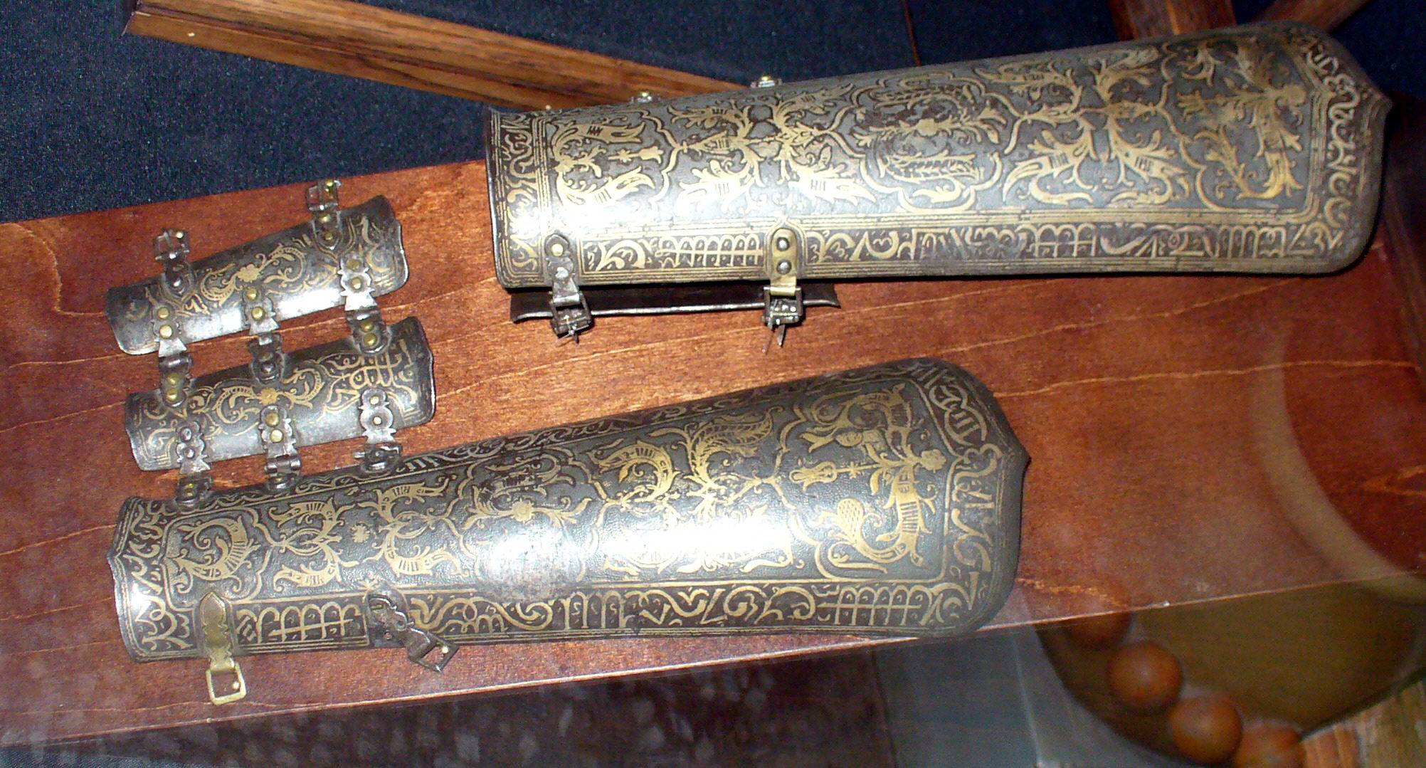Наруч  (налокотник)  17-го века, Длина 35 см. Наружная сторона гладкая, с вертикальными желобками в верхней части. Защита запястья из трех сочлененных пластин, прикрепленных к руке с бархатными ремешками и пряжками. Внутри покрыты тканью, крепление которой видно с внешней стороны – это гравированные медные заклепки.