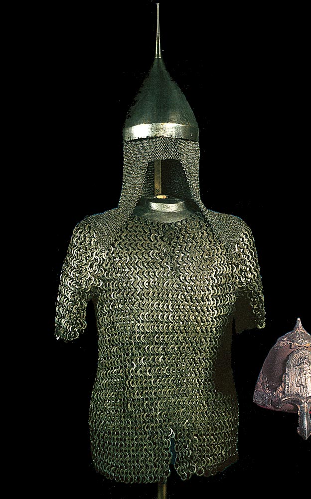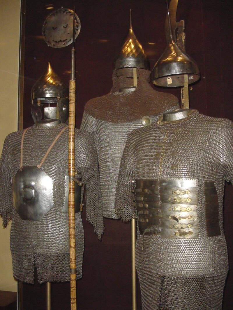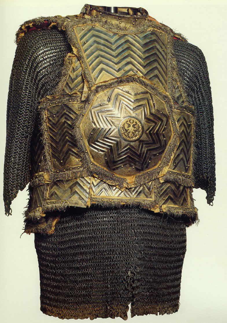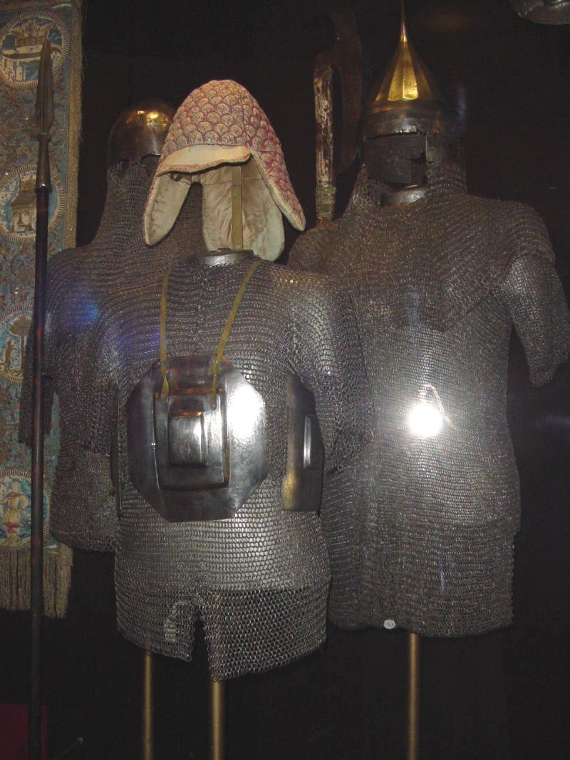 Еще менее понятно, как выглядели доспехи на корпус? Кольчуга то понятно, как и стеганка, ну наверное появились первые колонтари. А вот применялись ли Бехтерцы или Зерцало не понятно, также как и применялась ли еще чешуйчатая броня, старого типа? Впрочем мало понятна какой формы были щиты?