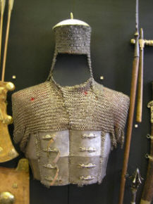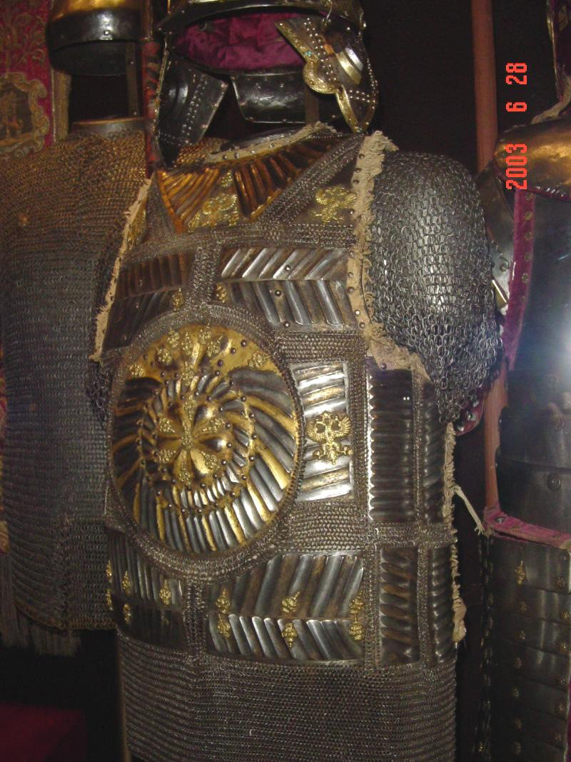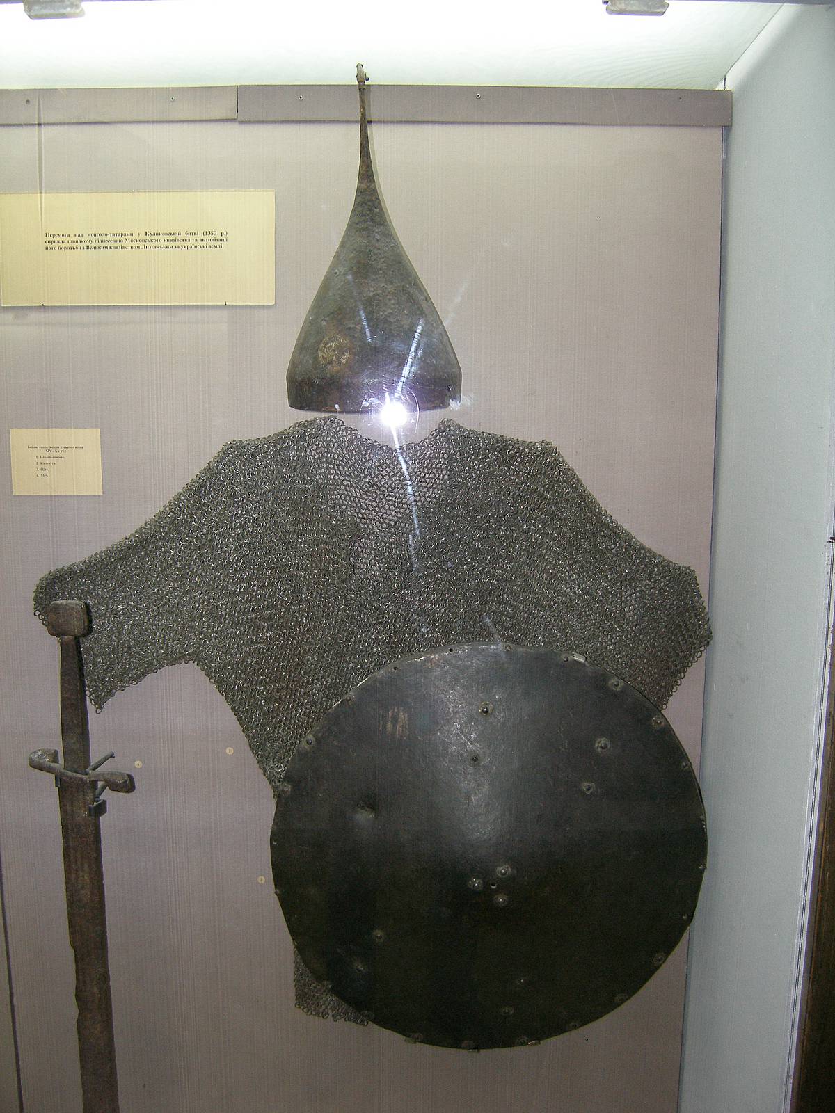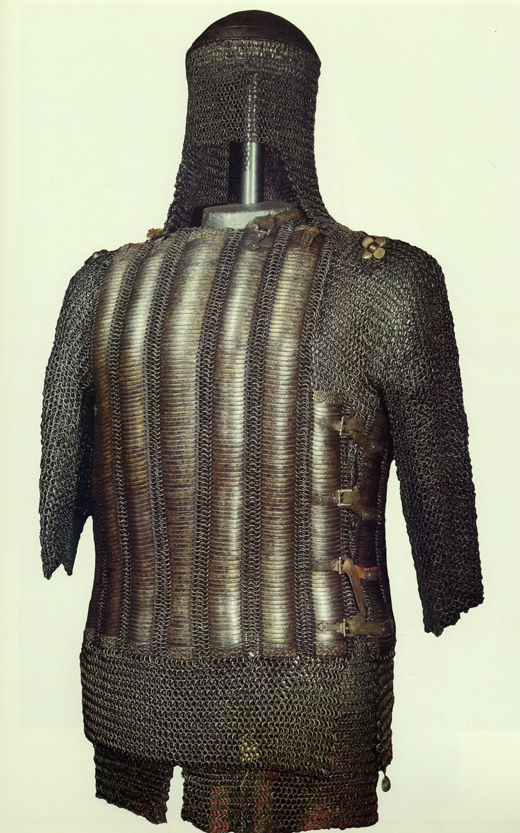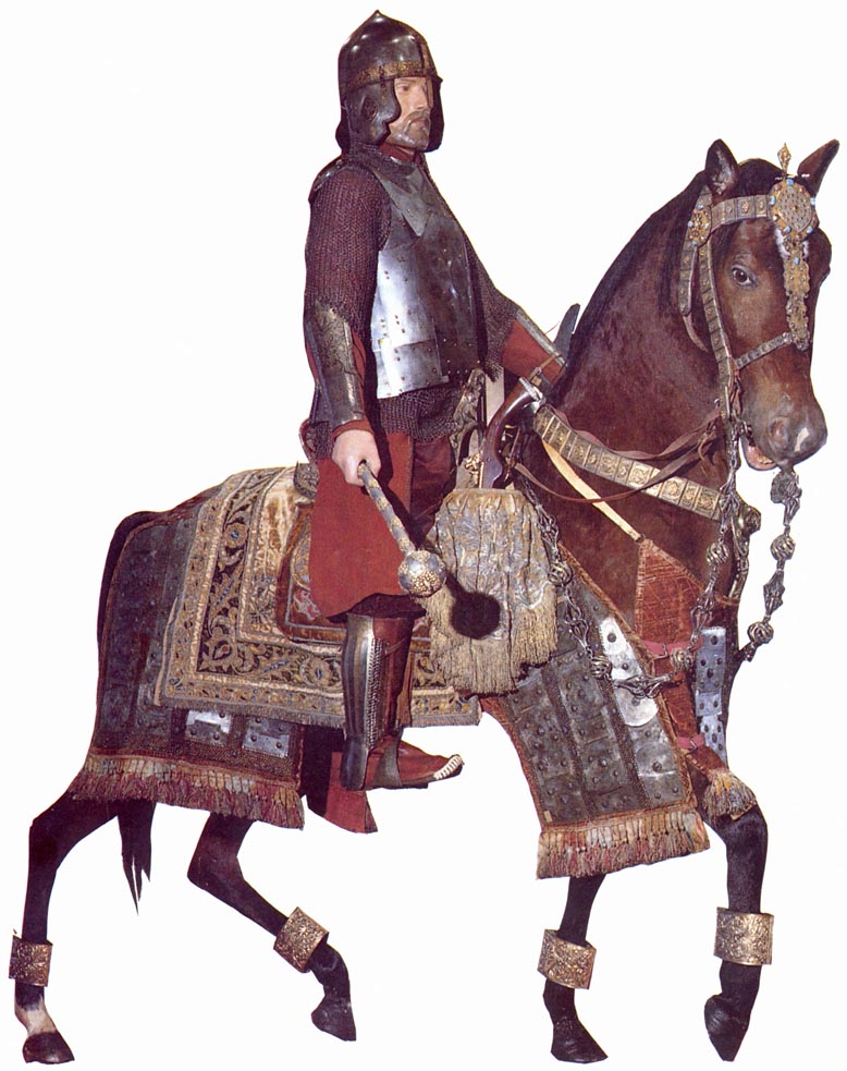 Еще менее понятно, как выглядели доспехи на корпус? Кольчуга то понятно, как и стеганка, ну наверное появились первые колонтари. А вот применялись ли Бехтерцы или Зерцало не понятно, также как и применялась ли еще чешуйчатая броня, старого типа? Впрочем мало понятна какой формы были щиты?