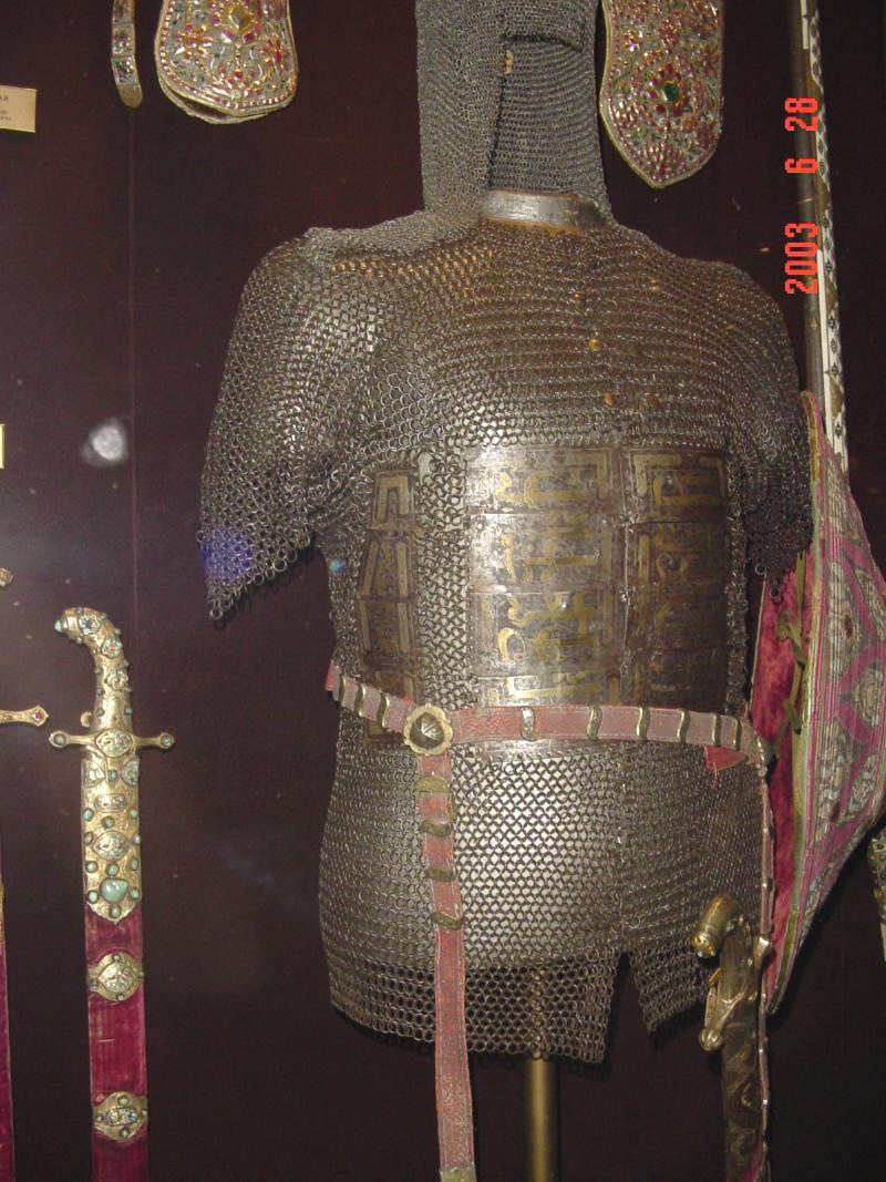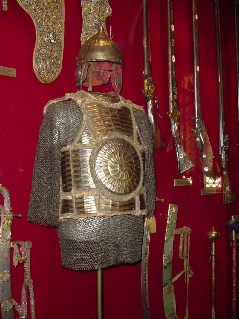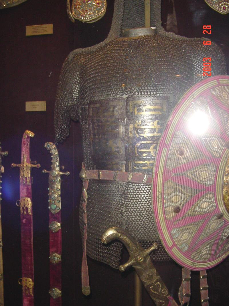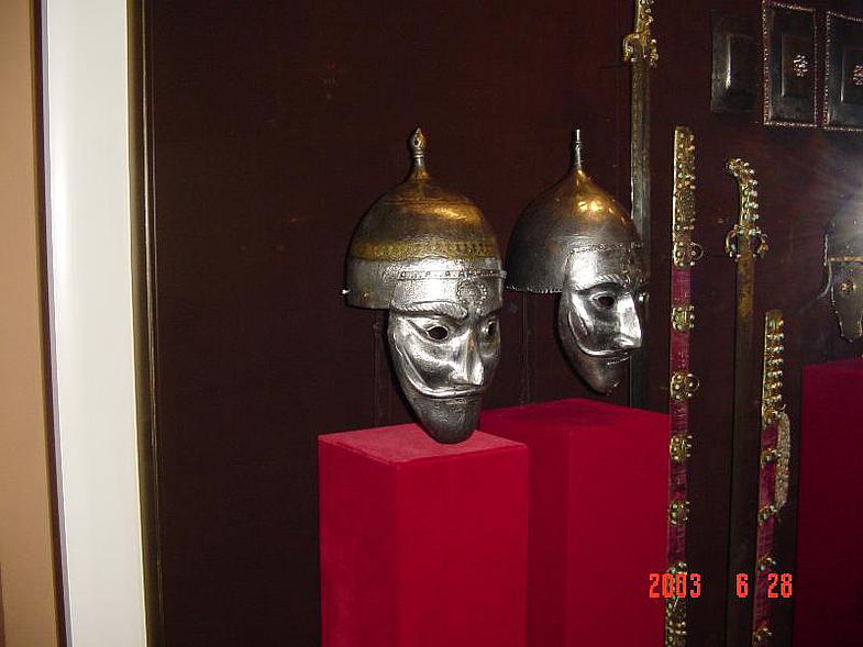 Поврежденный юшман, шапка мисюрка.  Главный исторический музей России - ГИМ, Москва. Фотографии седла, наручей, перначей и кистеня ниже.