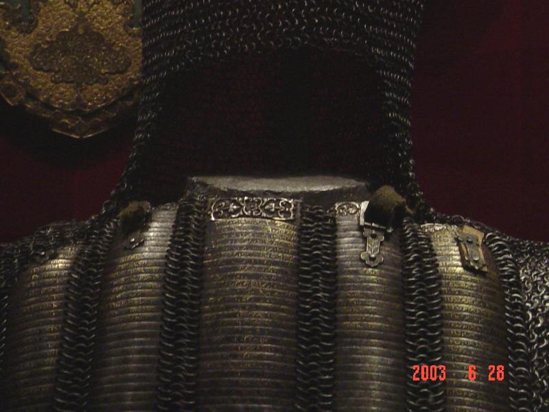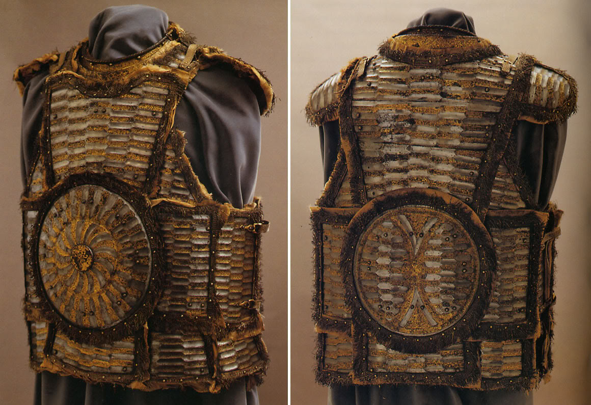 Грудь доспеха состоит из пяти рядов мелких пластинок по 102 в каждом ряду, спина из семи рядов таких же пластинок. Правый бок состоит из двух рядов, а левый бок, который застегивается, состоит из трех рядов пластинок с расчетом, что третий ряд будет закрываться при застегивании доспеха.