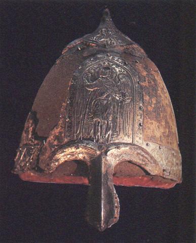 Шлем Александра Невского, принадлежавший царю Михаилу Федоровичу. Втор. пол. 16 ст. В 1621 году переделанный мастером Никитой Давыдовым: он вероятно добавил фигурку святого на наносник и изображение короны на тулью.