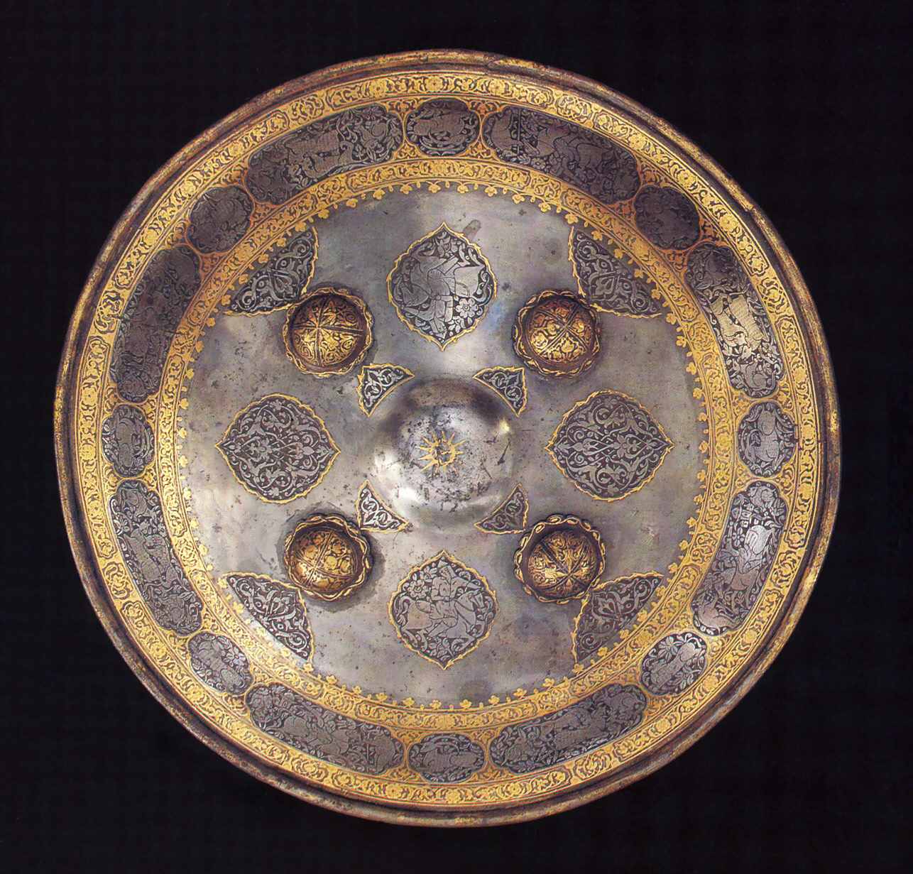 Вызывает интерес щит. Он турецокго происхождения, середина XVII в. Тростник, сталь, золото, золотная нить, шелковая нить, рубины, бирюза, бархат; плетение, резьба, чеканка, насечка золотом, басма.  Оружейная палата, Москва.