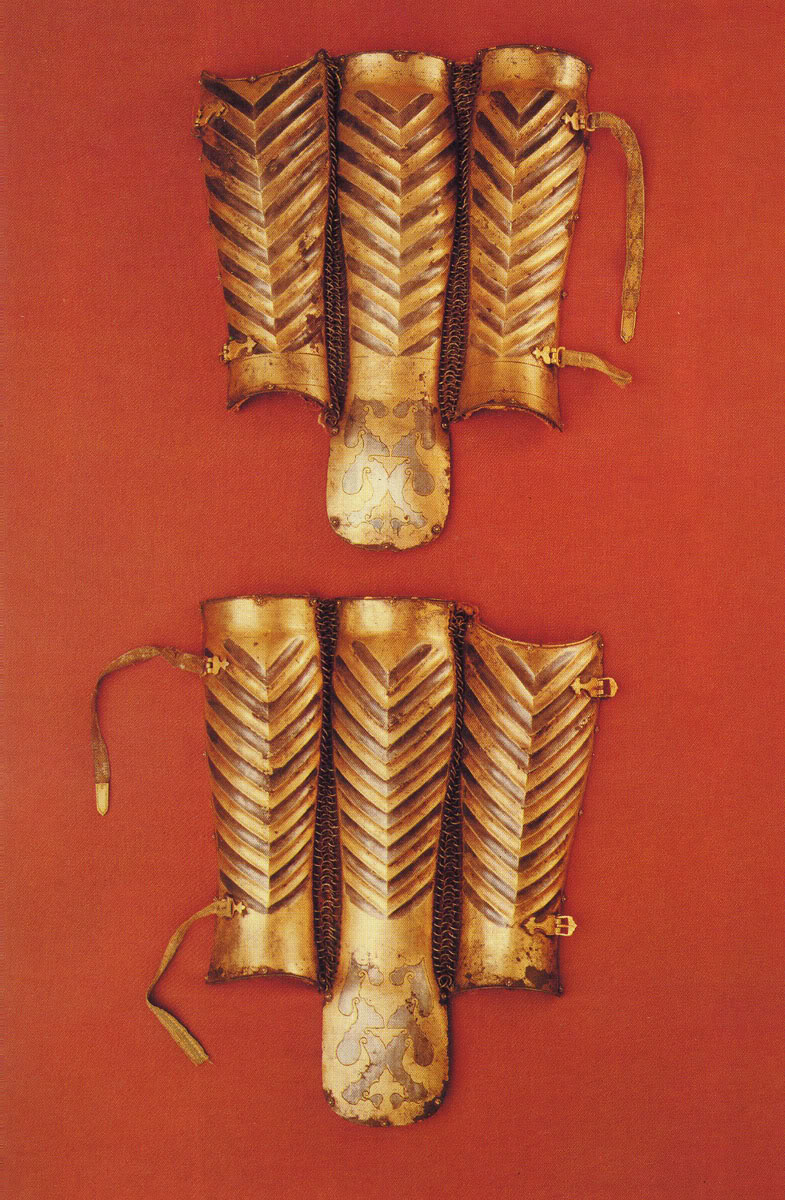 (b) Наручи, длина, 32.5 см. Каждый наруч состоит из трех секций, соединенных петлями с шелковыми ремни с пряжками. Основные пластины украшены позолочеными фигурами в виде двуглавого Орла. Изнутри обиты тканью.
